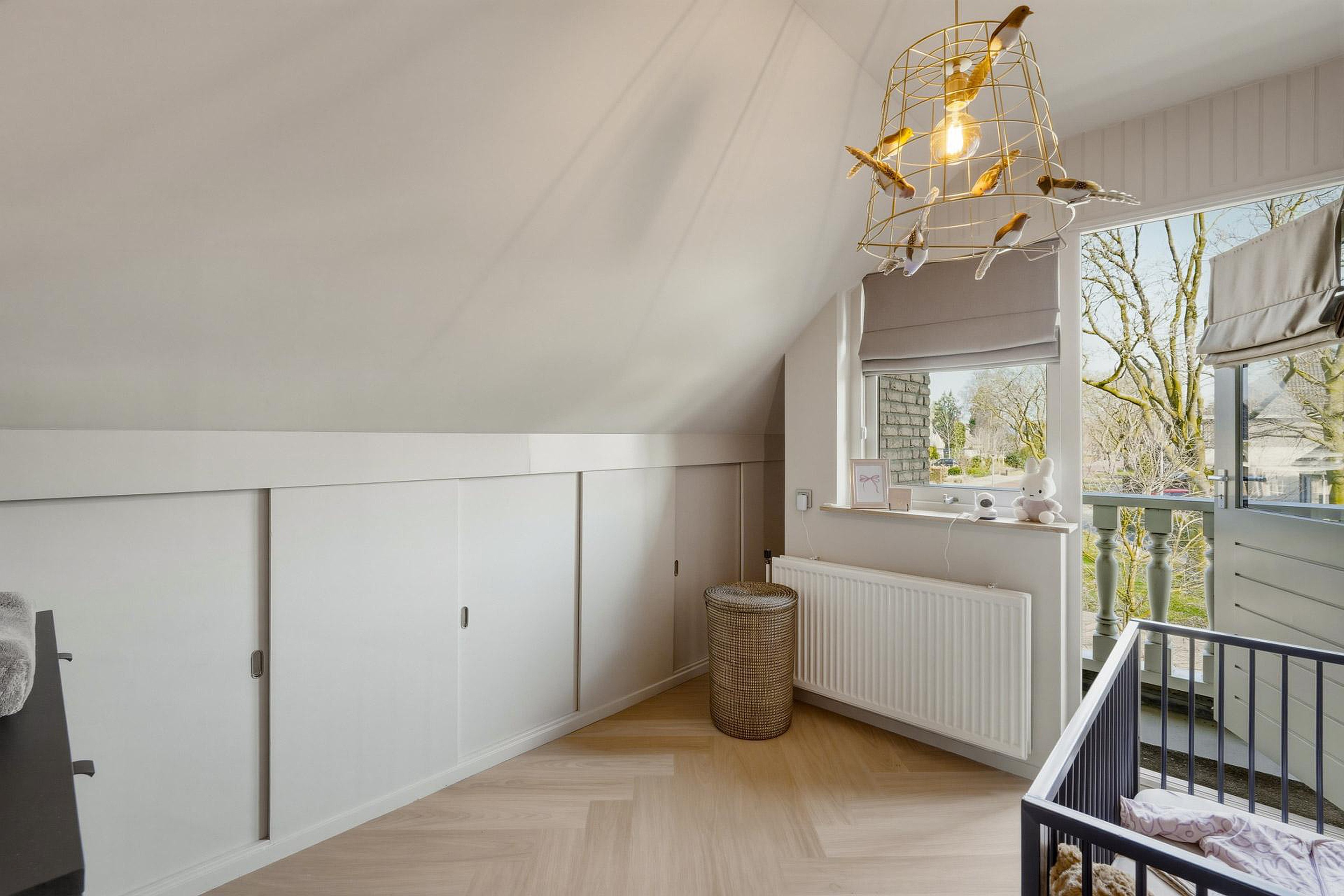 Overloop met vide en toegang tot meerdere slaapkamers. De slaapkamers zijn ruim van opzet en beschikken over vaste kastruimte. Eén van de kamers biedt toegang tot een balkon.