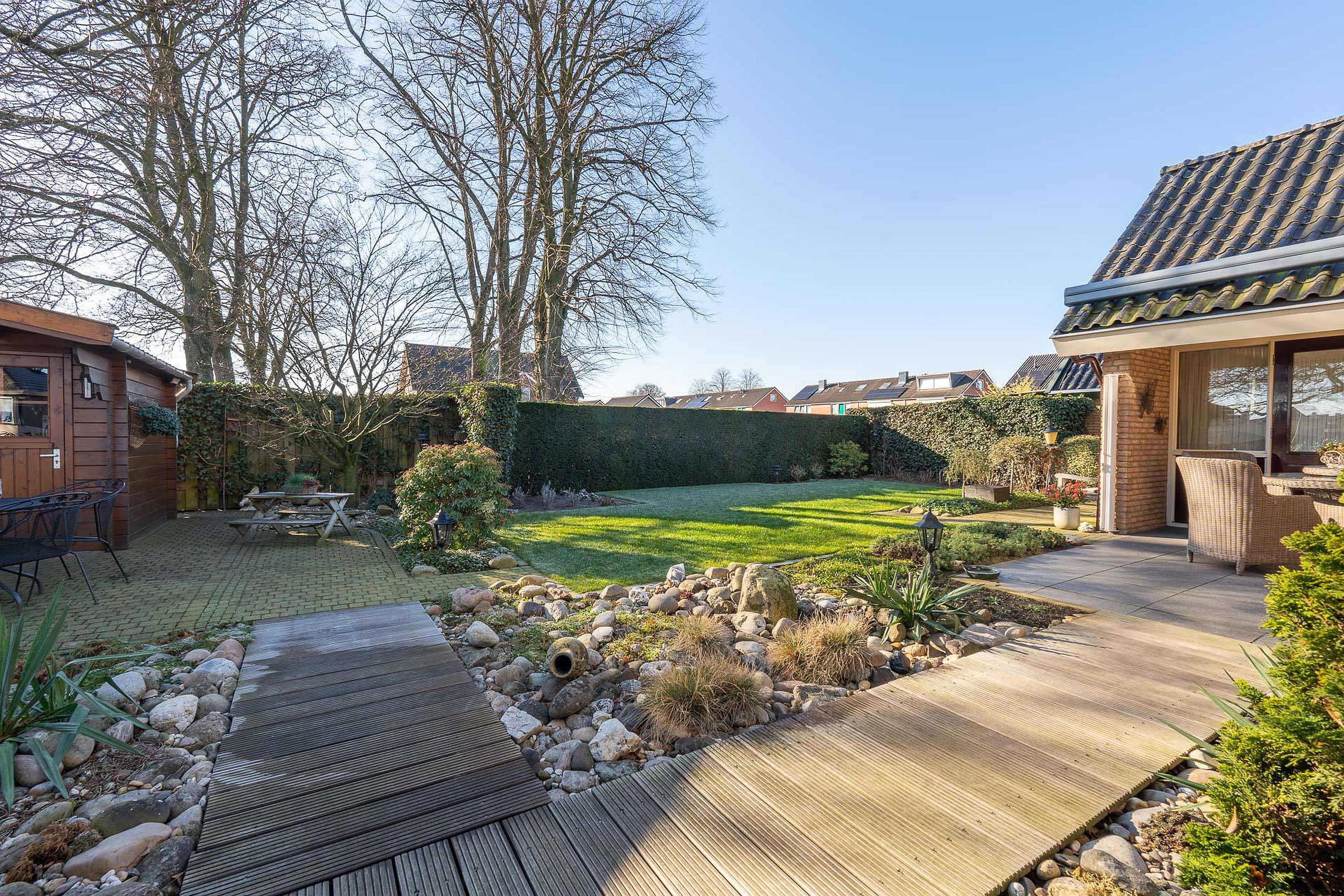 De woning staat op een ruim perceel met een verzorgde tuin rondom. In de tuin zijn meerdere terrassen aangelegd waardoor er altijd een plek in de zon of schaduw te vinden is.