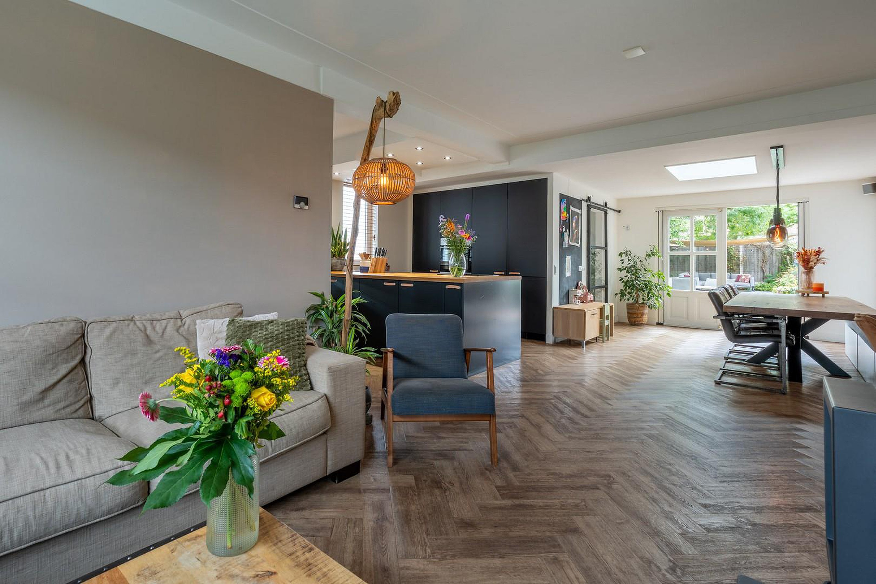 Entree/hal met trapopgang naar etage, toilet en trapkast naar kelder met meterkast en pomp voor vloerverwarming en garderobe, middels de prachtige loftdeur komt u in de riante living met daarin centraal opgesteld de leuke keuken met riant eiland. De keuken is voorzien van o.a. stoomoven, inductiekookplaat, vaatwasser, vrieskast, koelkast en luxe afzuigschouw. Achter het leefgedeelte ligt de bijkeuken met achter entree en hierin de aansluitingen voor wasmachine en droger welke zijn verwerkt onder een werkblad met daarnaast kastruimte. De begane grond is grotendeels voorzien van vloerverwarming met in visgraat afgewerkte PVC vloer. Verder is vanuit de lichte keuken-/ kamer middels openslaande tuindeuren de riante en fraai aangelegde achtertuin te bereiken.