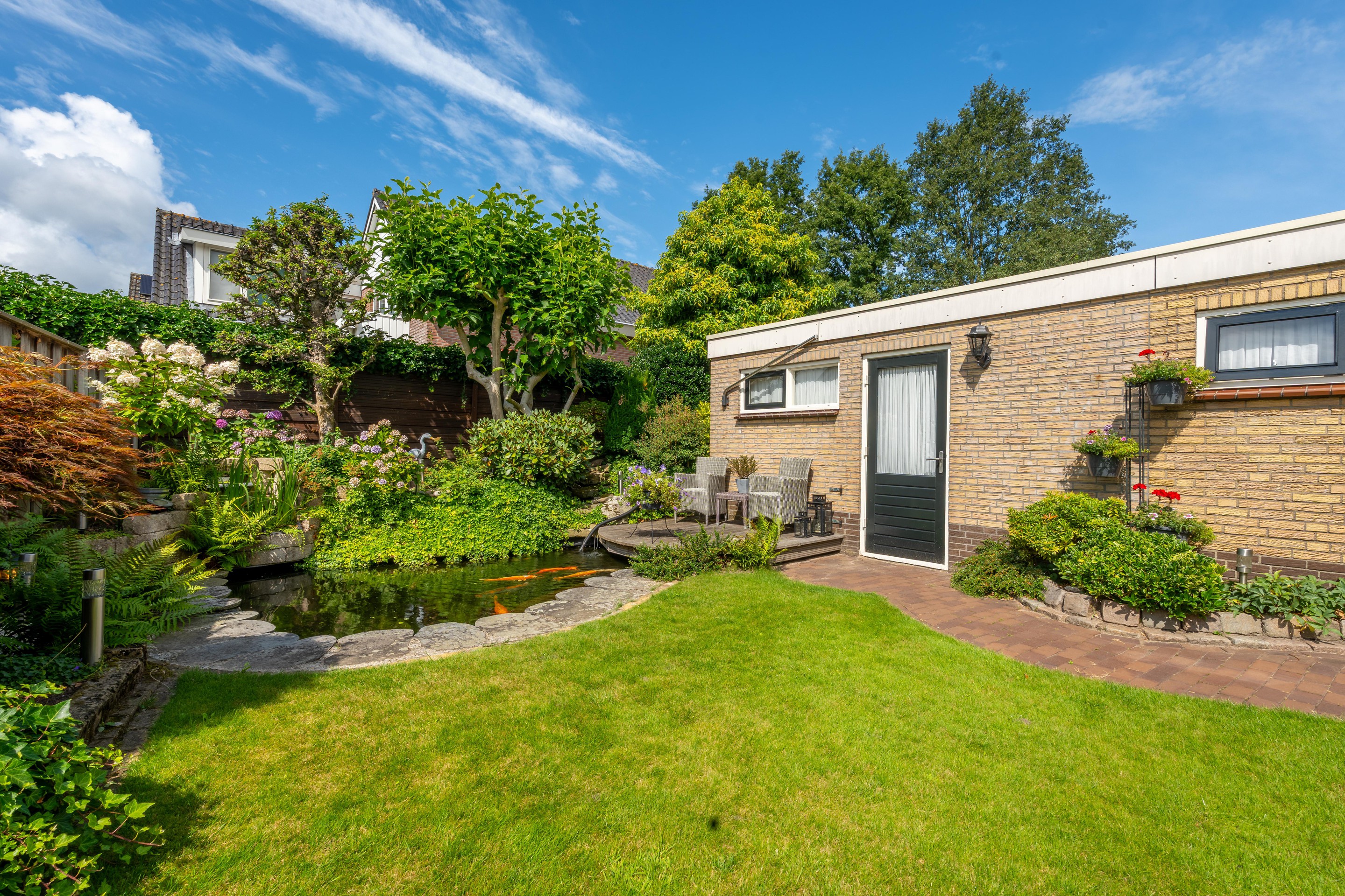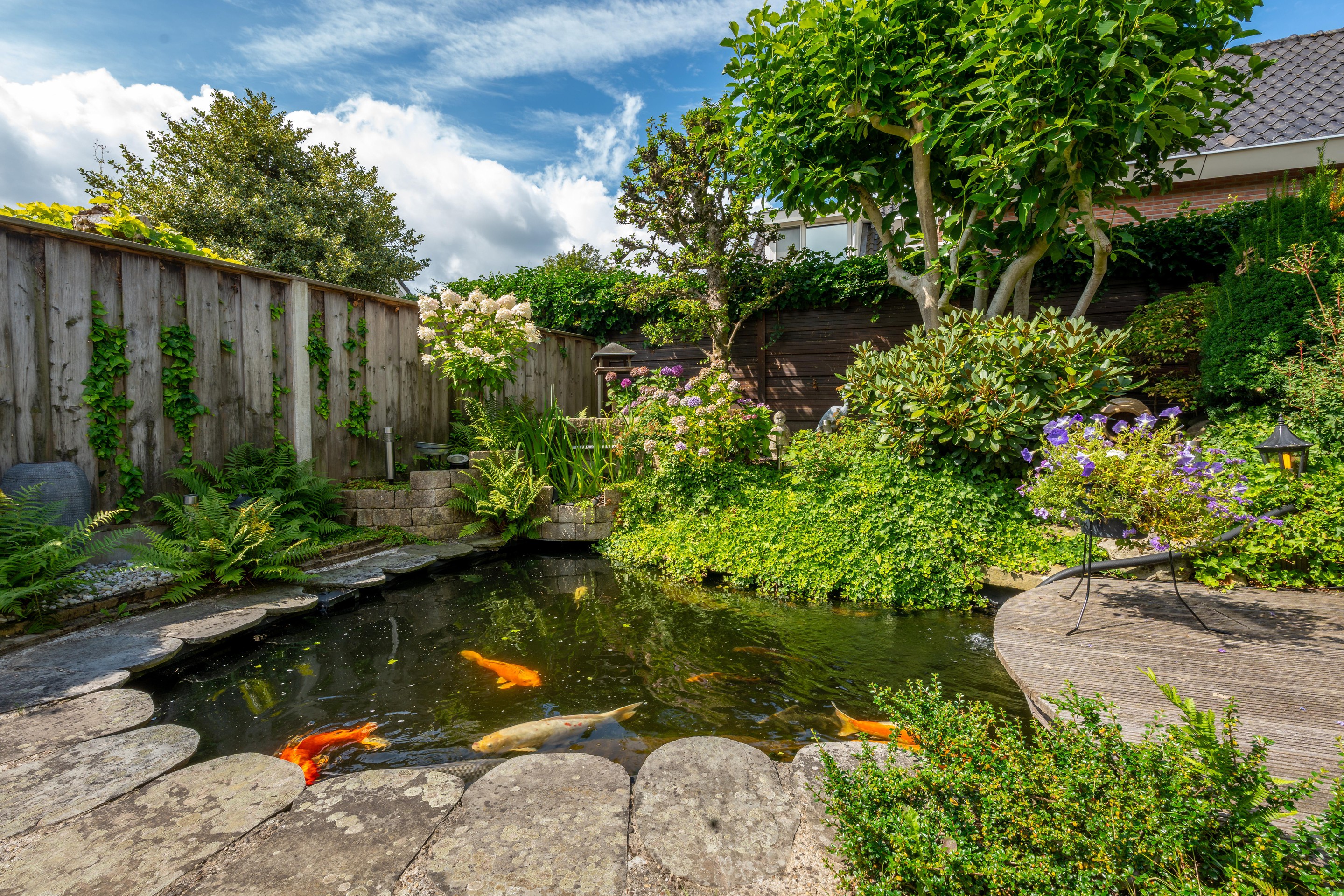 - Schitterende achtertuin voorzien van siervijver met vlonderterras, gazon en diverse beplantingen;
