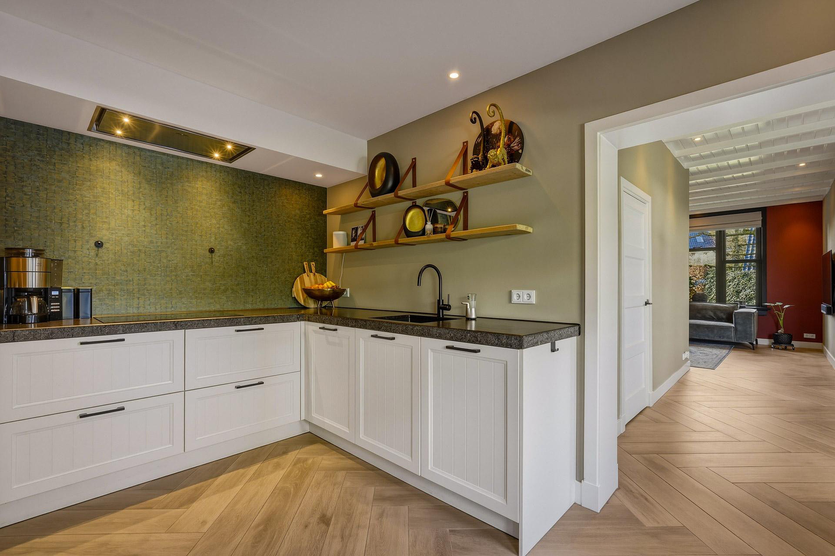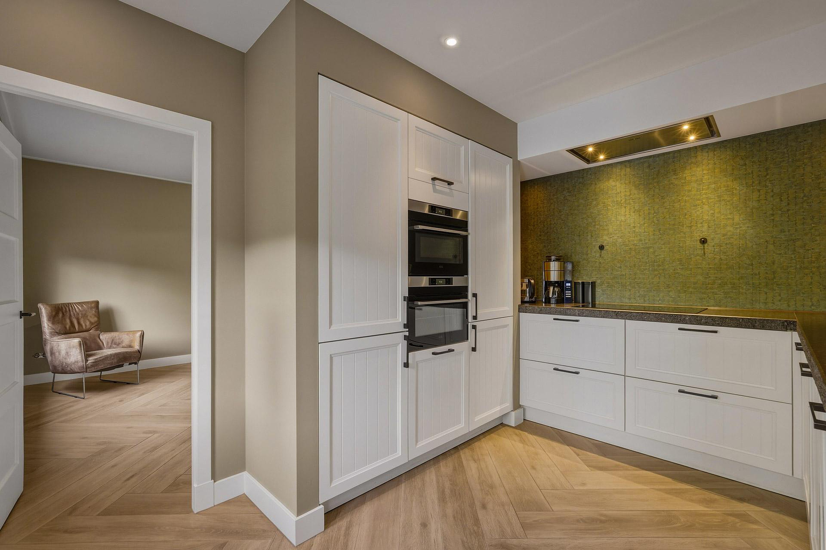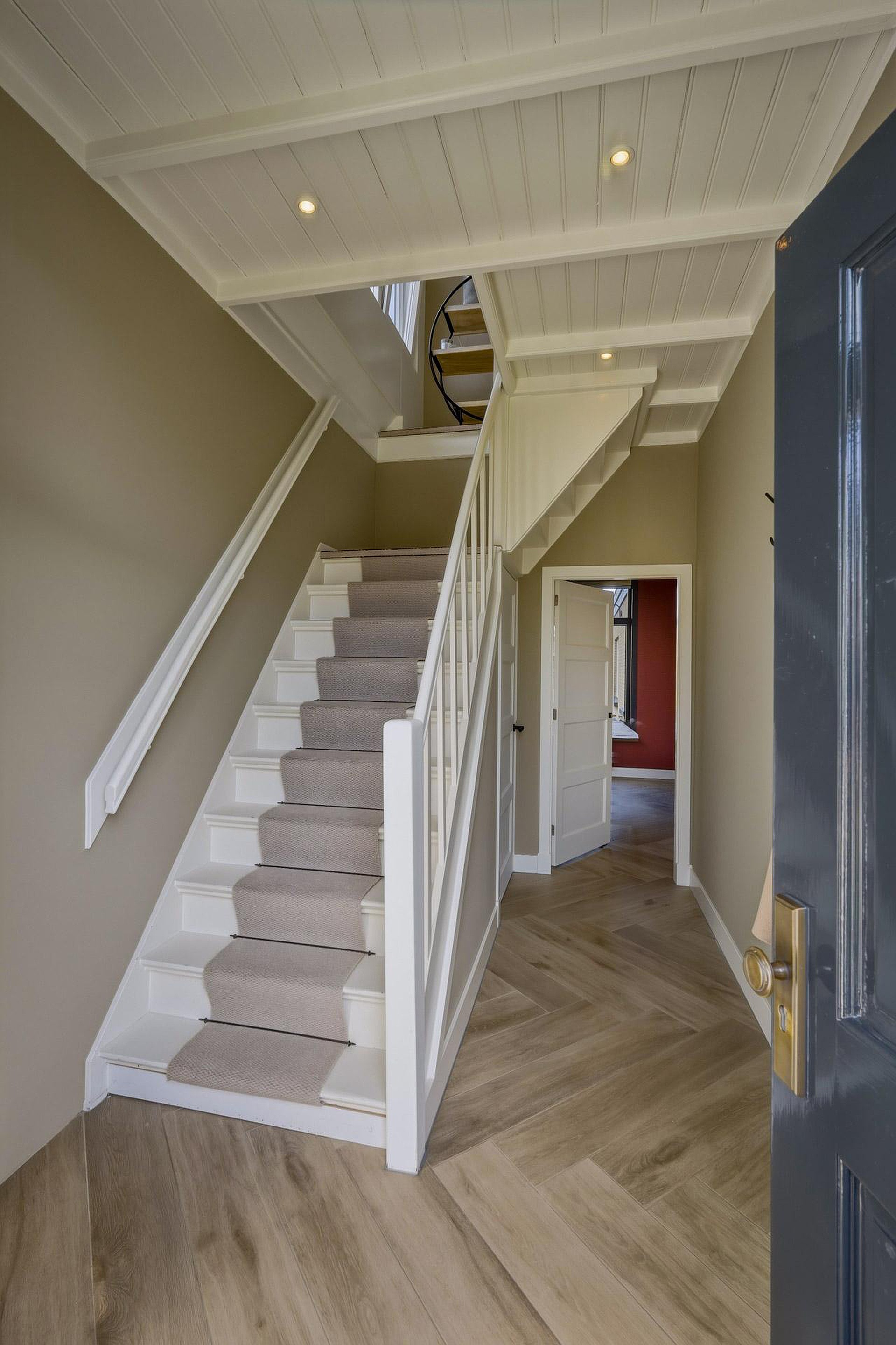 Entree/hal met meterkast, trapkast en trapopgang naar de eerste verdieping. Vanuit de hal heeft u toegang tot de ruime woonkamer en de keuken. De gehele begane grond is afgewerkt met een keramisch pakket in visgraatmotief en voorzien van vloerverwarming, wat zorgt voor een stijlvolle en comfortabele basis.