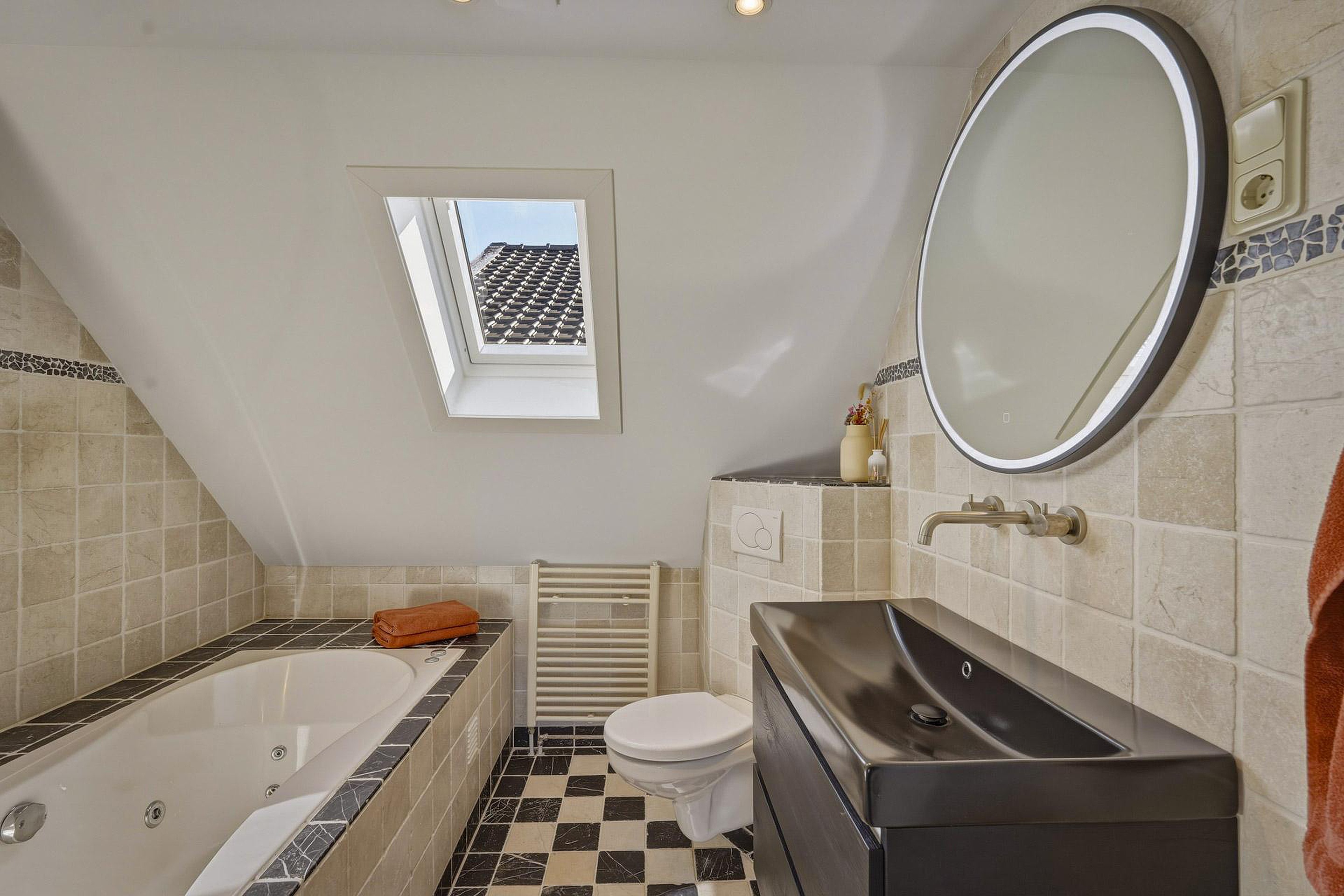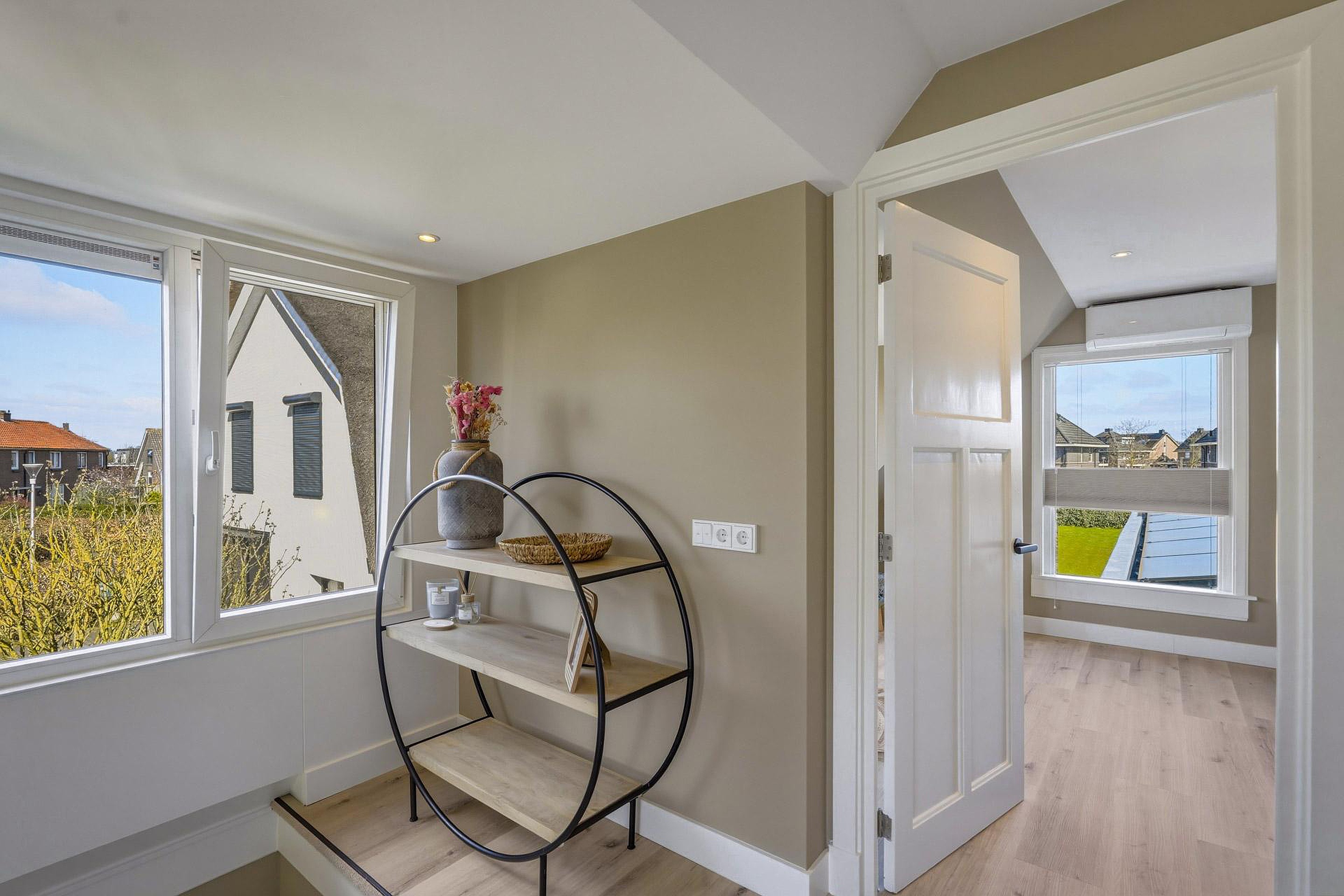 Overloop met toegang tot twee ruime slaapkamers. Deze verdieping kenmerkt zich door de prettige lichtinval en is afgewerkt met een pvc-vloer. Beide slaapkamers zijn voorzien van airconditioning en inbouwspots, terwijl de verdieping grotendeels is uitgerust met elektrische rolluiken. De badkamer is compleet ingericht en beschikt over een ligbad, inloopdouche, toilet en wastafel. Daarnaast is de badkamer voorzien van vloerverwarming, een luxe verlichte en verwarmde spiegel en een badkamervloer met retourleiding, wat bijdraagt aan extra comfort.