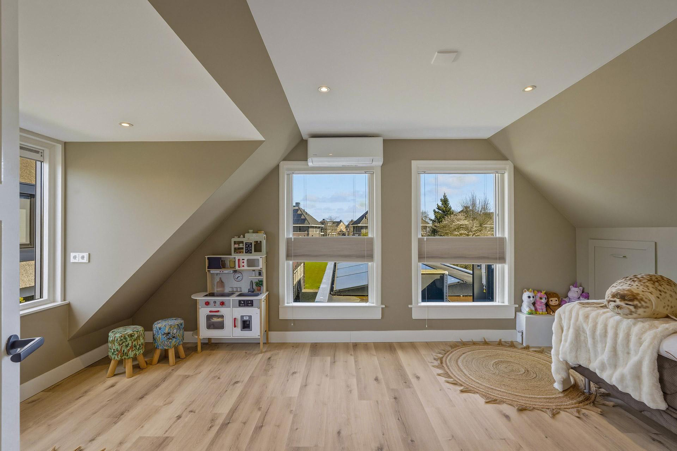 De keuken is voorzien van diverse inbouwapparatuur, waaronder een combi-oven, inductiekookplaat, afzuiginstallatie, twee ruime koelkasten en twee vriezers. Aansluitend bereikt u een extra ruimte die zich uitstekend leent als speel- of werkkamer. De achtergelegen slaapkamer is voorzien van een airco-installatie en openslaande deuren naar de veranda en de achtertuin. Daarnaast beschikt de begane grond over een badkamer met douche en wastafel, evenals een separaat toilet.