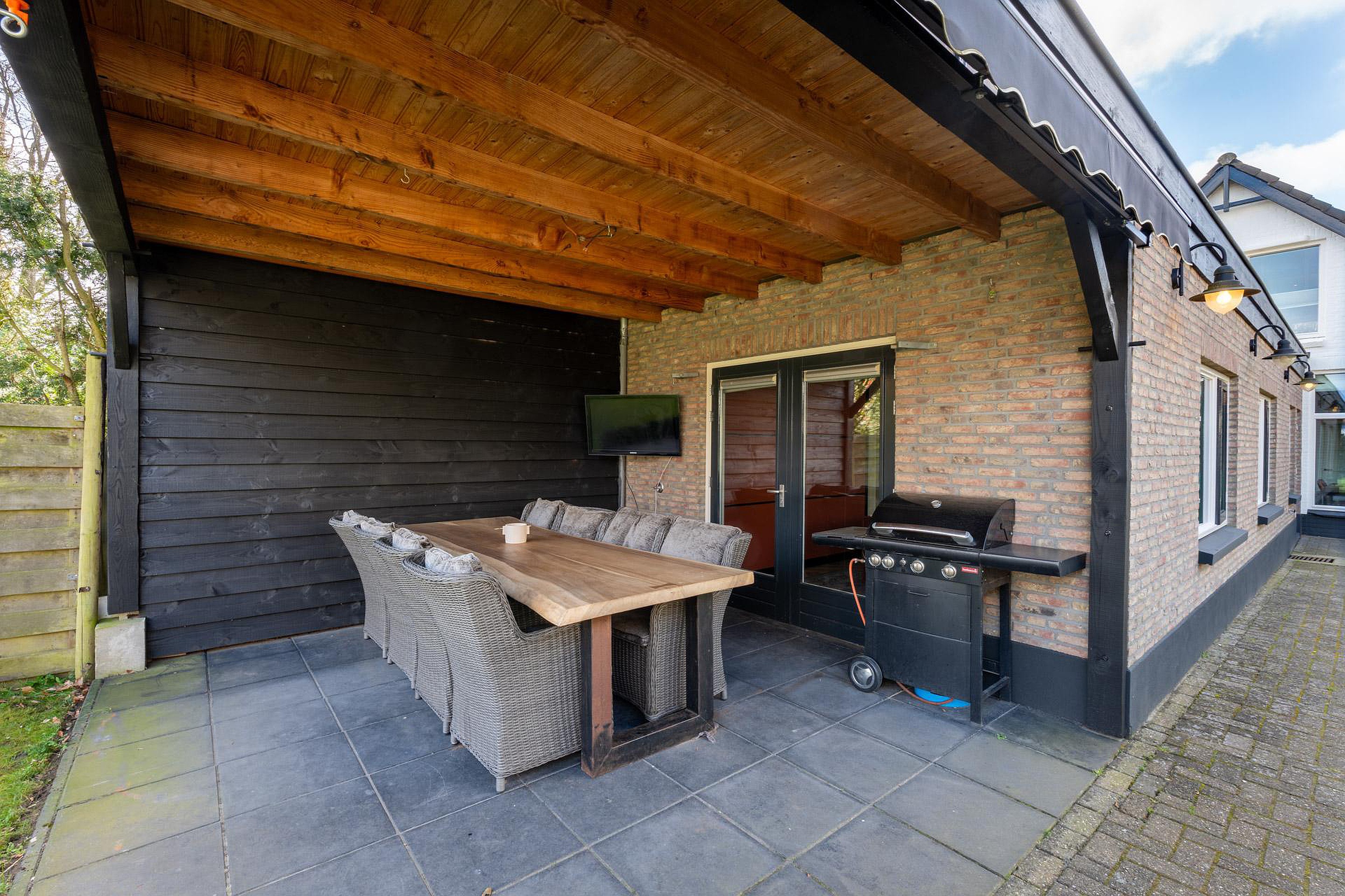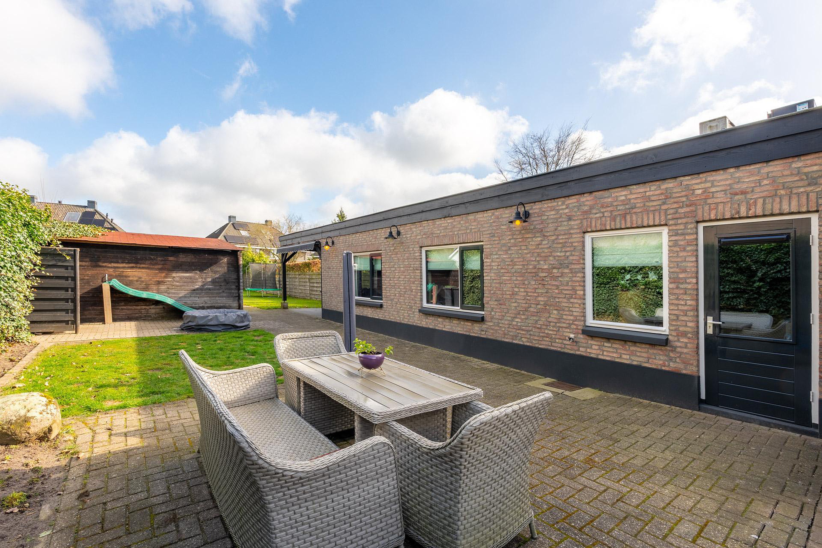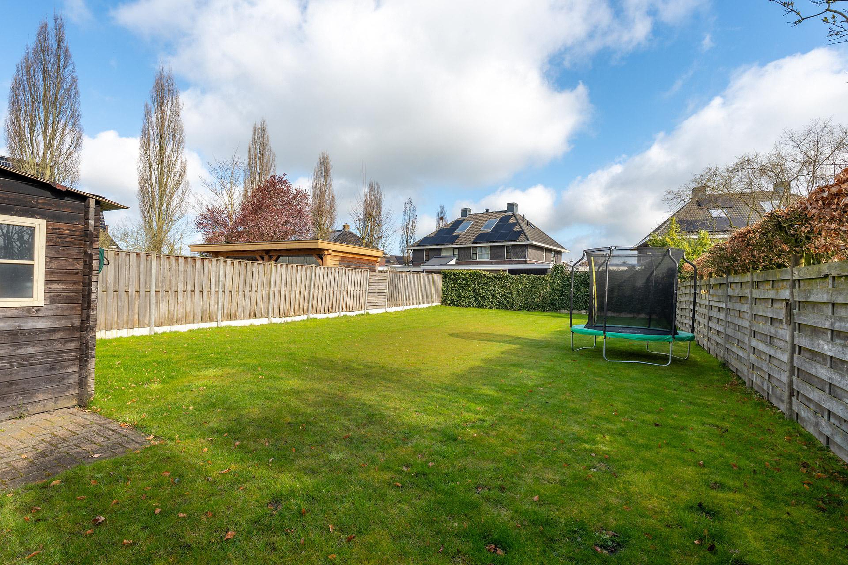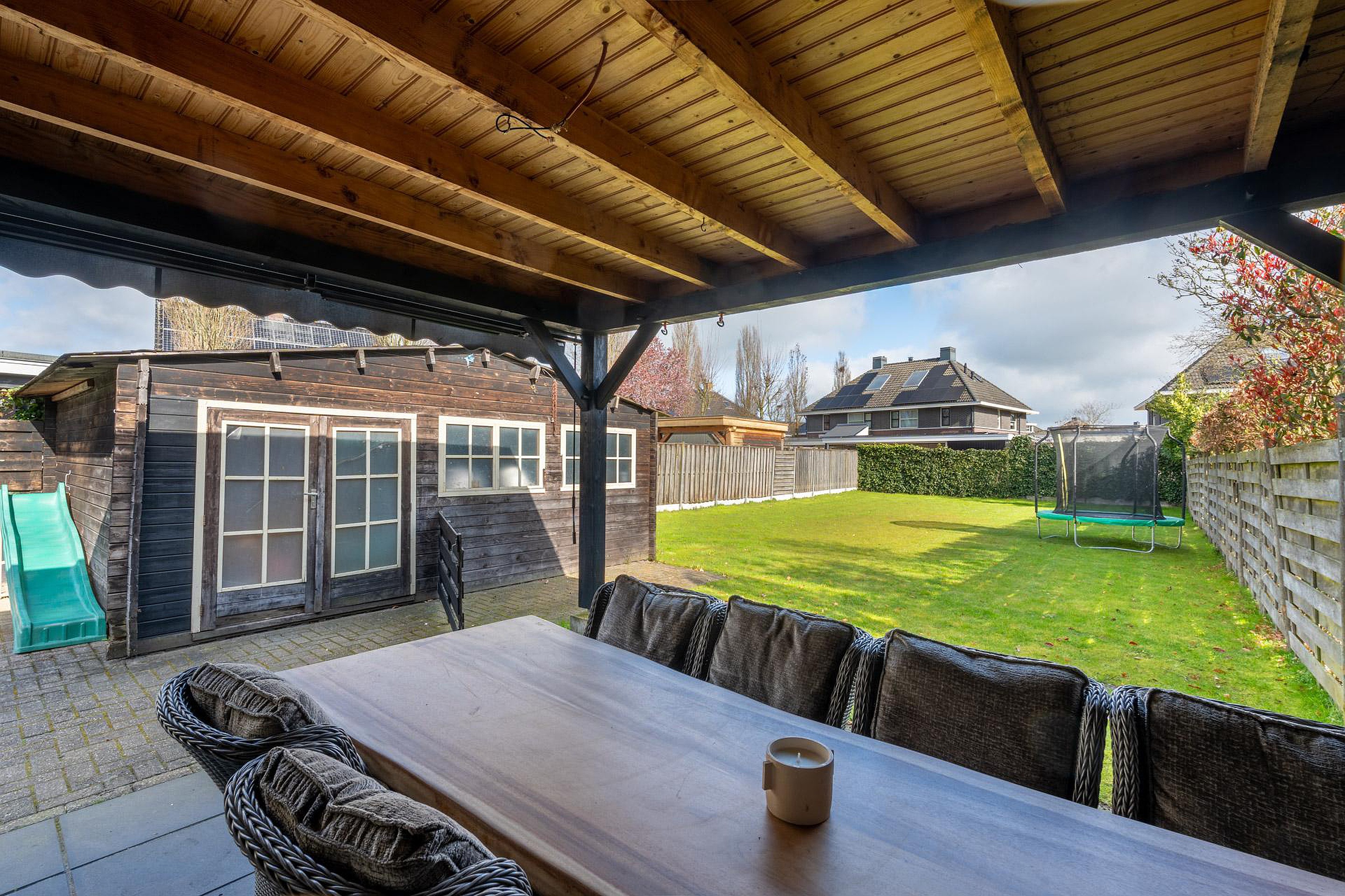 De diepe achtertuin is voorzien van een houten veranda met elektra en beschikt over vele mogelijkheden.