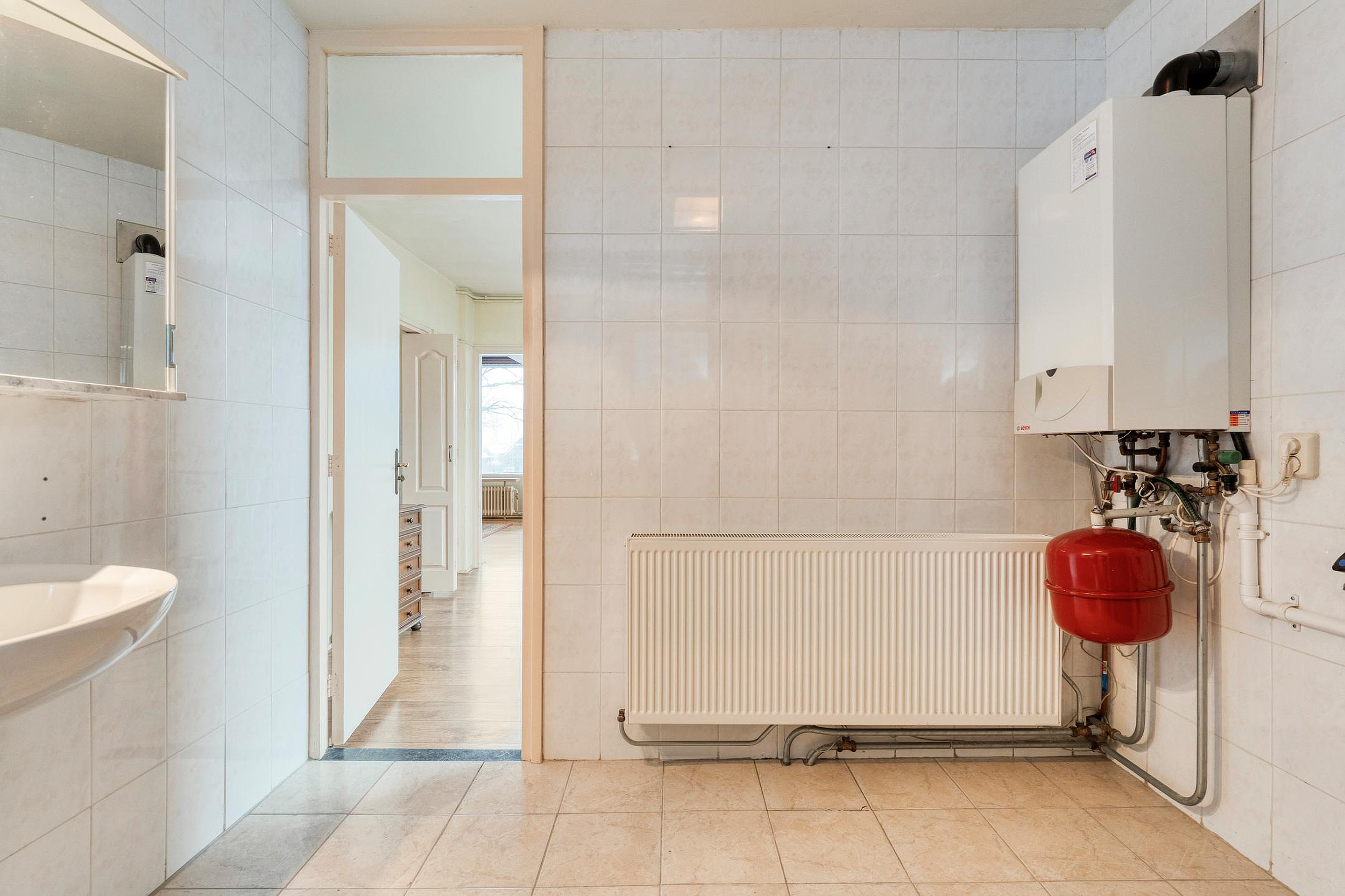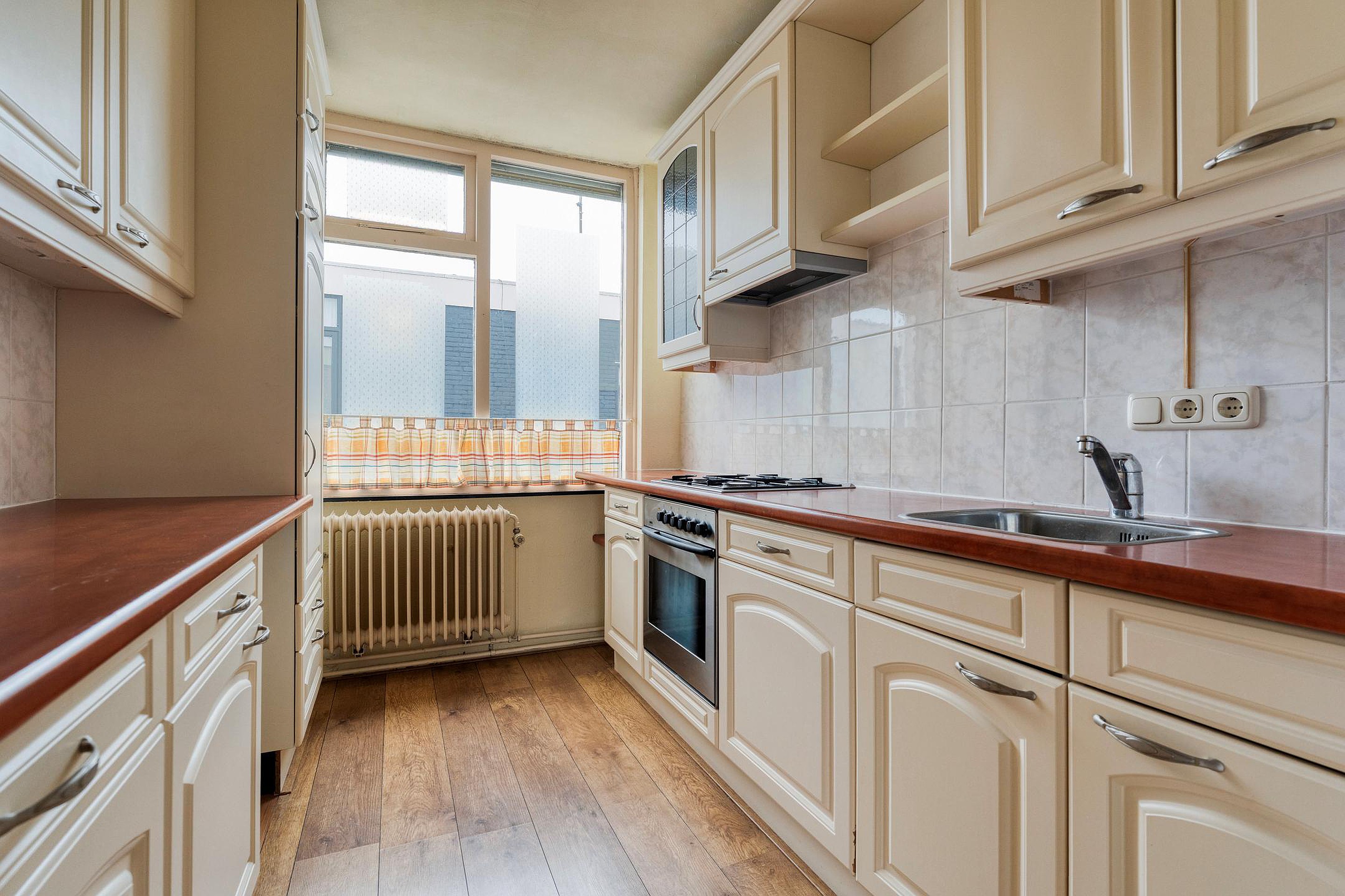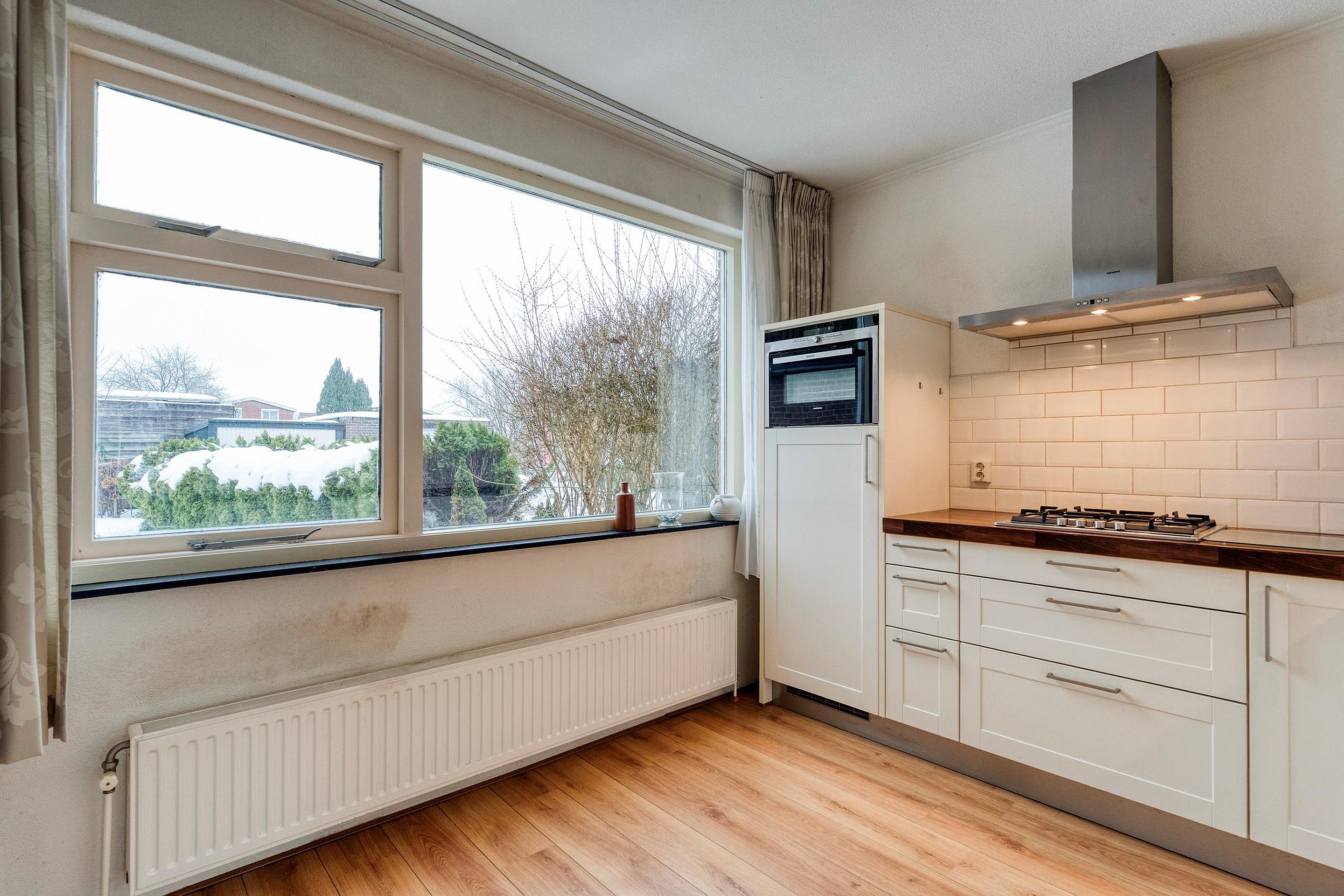 De afgesloten keuken beneden is voorzien van een hoekkeuken en heeft uitzicht over de achtergelegen tuin.