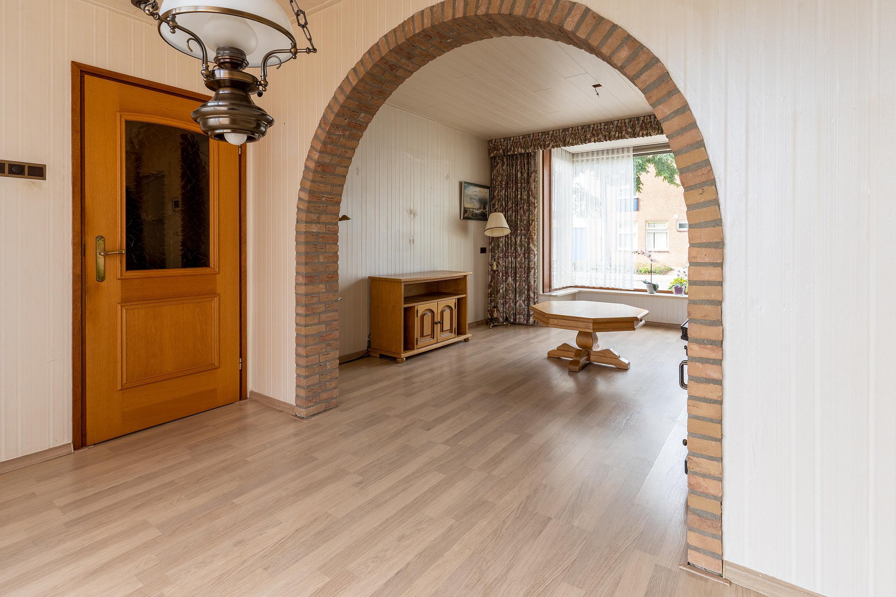 hal met toilet en kelderkast, uitgebouwde keuken met toegang tot de woonkamer. De voorzijde van de woonkamer is voorzien van een erker en de achterzijde van een schuifpui. Achter de keuken is nog een achterportaal met ruimte voor de wasapparatuur en de geiser, tevens vanuit hier toegang tot de tuin.
