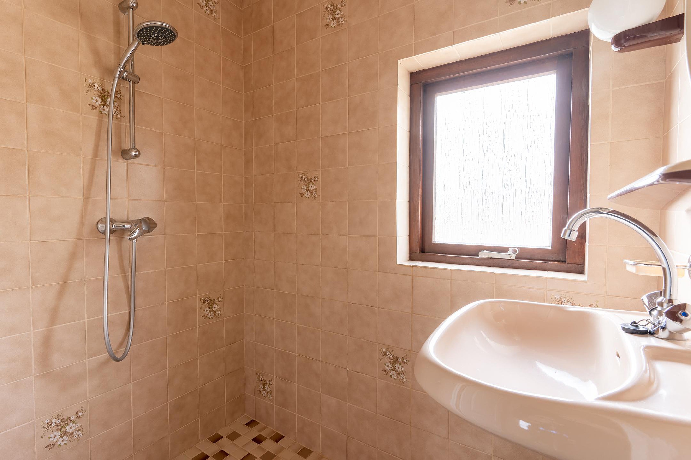 overloop, 3 slaapkamers met vaste kasten (en 1 slaapkamer met balkon) en een compacte badkamer voorzien van douche en wastafel.
