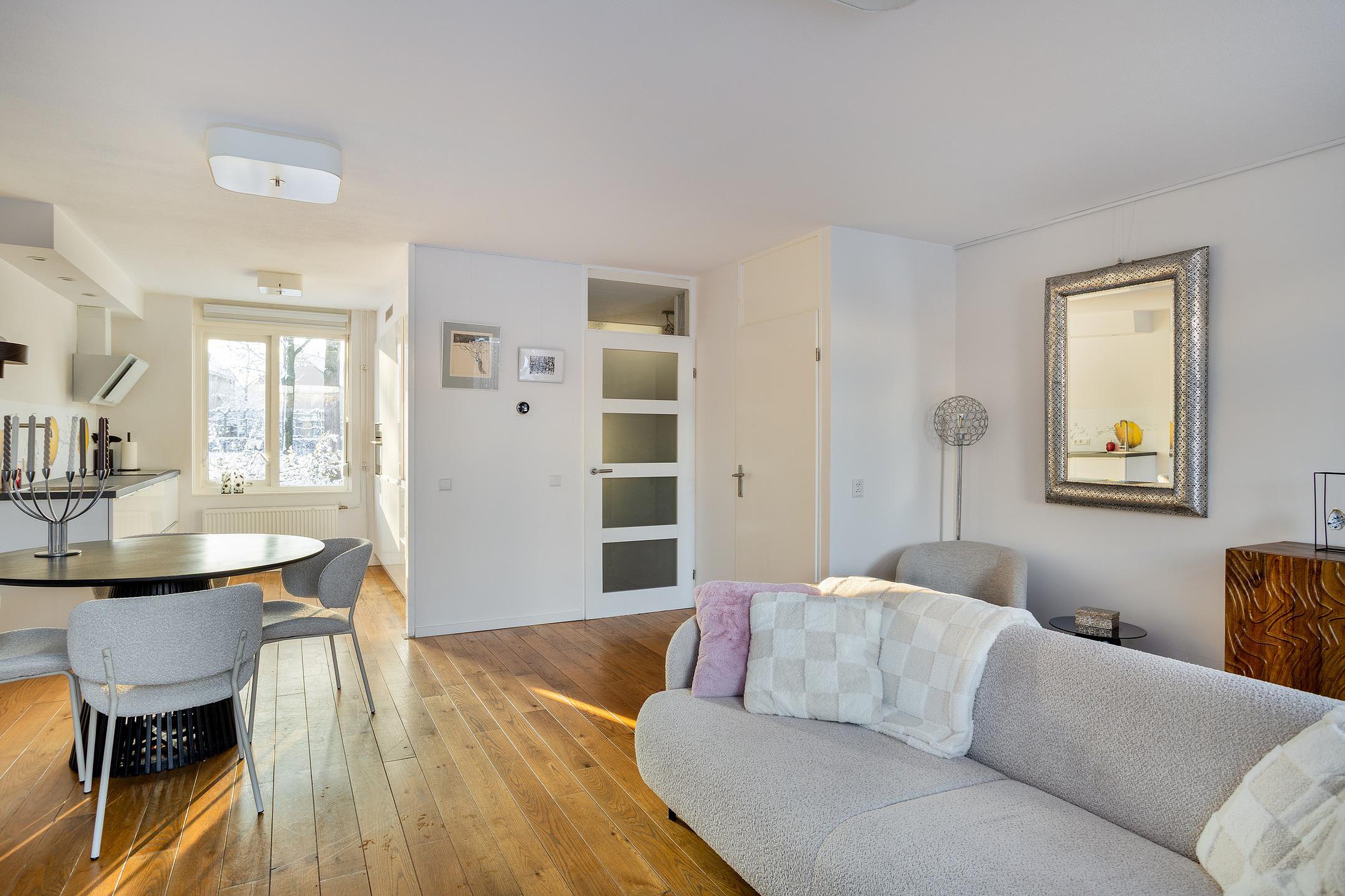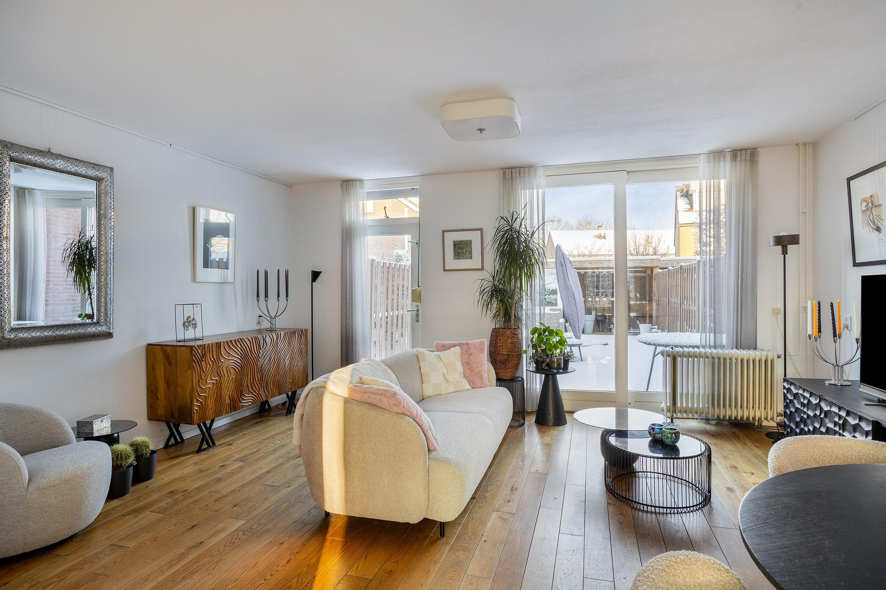 Heerlijk lichte woonkamer met een geweldig zicht op de achtertuin. Door de schuifpui lijkt de tuin een verlengstuk van de woonkamer, wel zo prettig in de zomermaanden. De woonkamer laat zich heel natuurlijk indelen met een royale zit- en eethoek. De boodschappenvoorraad en stofzuiger kunnen keurig in de trapkast worden geplaatst.