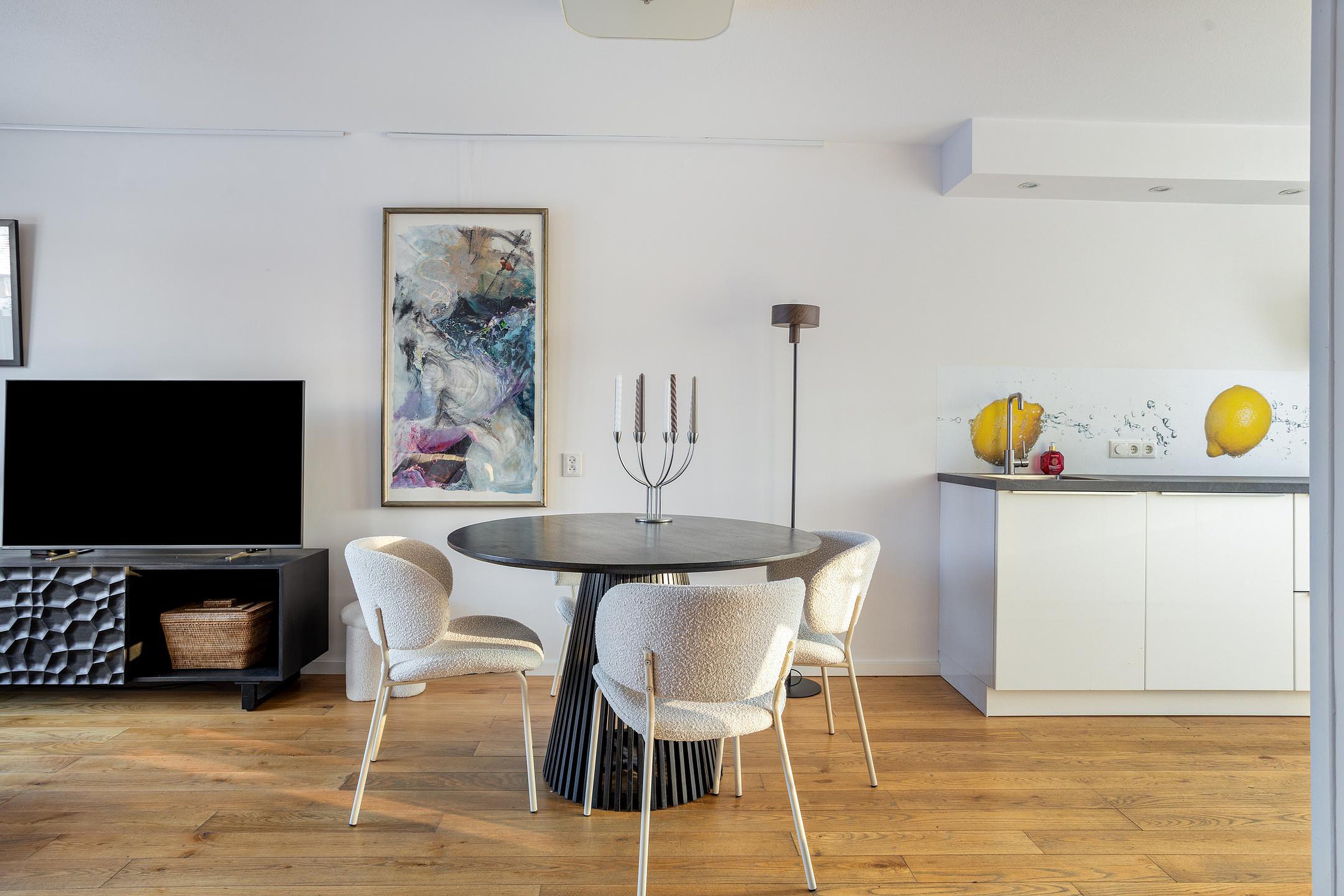 De ruimte is afgewerkt met een eikenhoutenvloer, gestuukte wanden en een spuitwerkplafond.