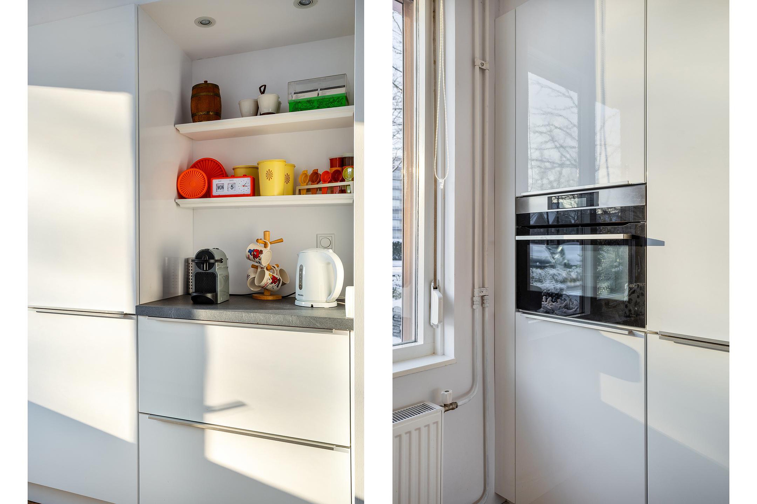 Open keuken aan de voorzijde van de woning met een leuk uitzicht over de straat. Zo kun je de visite al aanzien komen tijdens het kokkerellen. De keuken heeft een doordachte opstelling met een apparatenwand en koffie-nis. Aan het kunststofwerkblad met enkele spoelbak is er veel werkruimte voor het bereiden van de maaltijden.