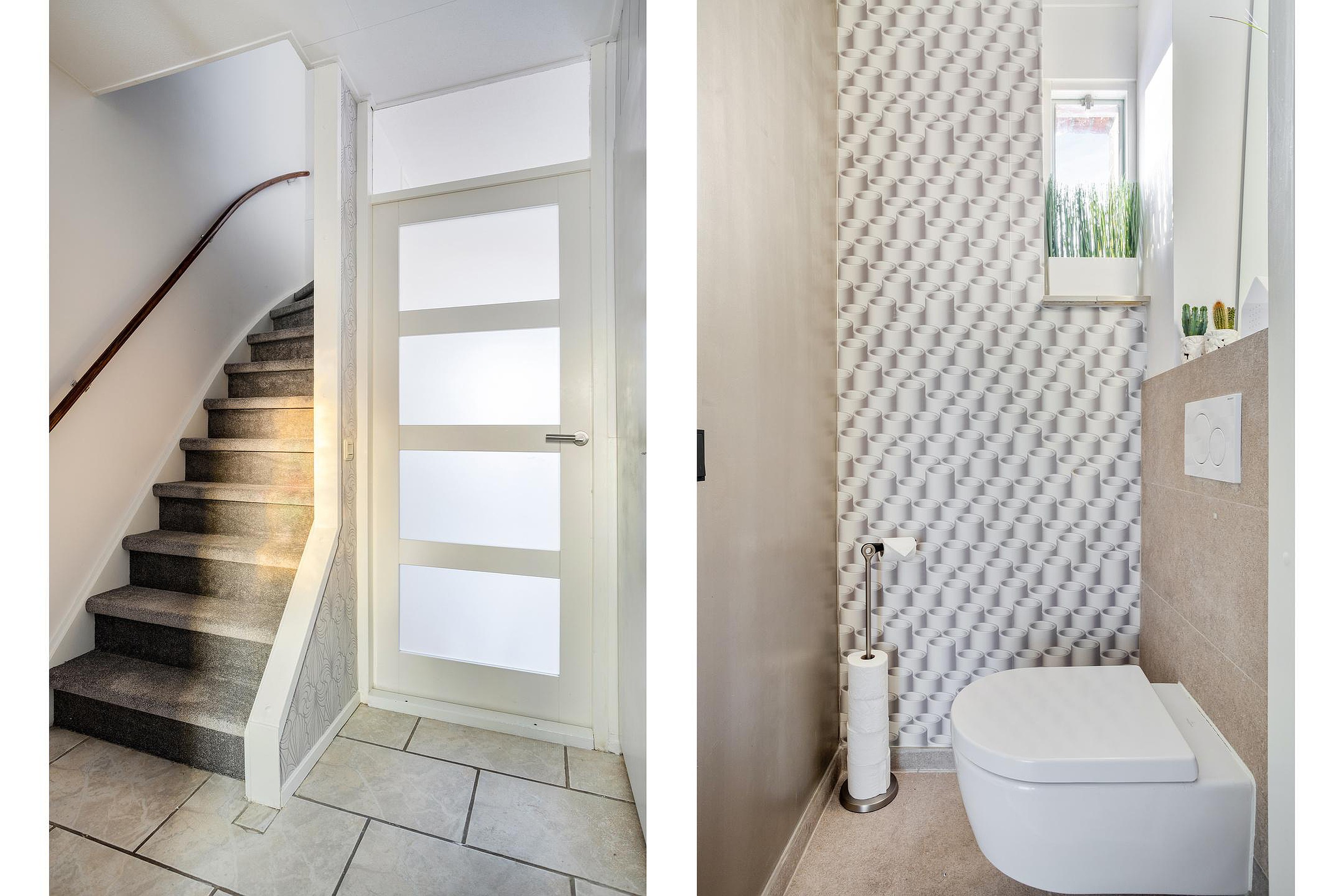 Keurige toiletruimte waar via het vensterraampje het daglicht kan binnenstromen. Op het nisje kun je een leuk plantje plaatsen of een luchtverfrisser. De behangen wand is een leuk statement en het toilet is voorzien van een wandcloset.