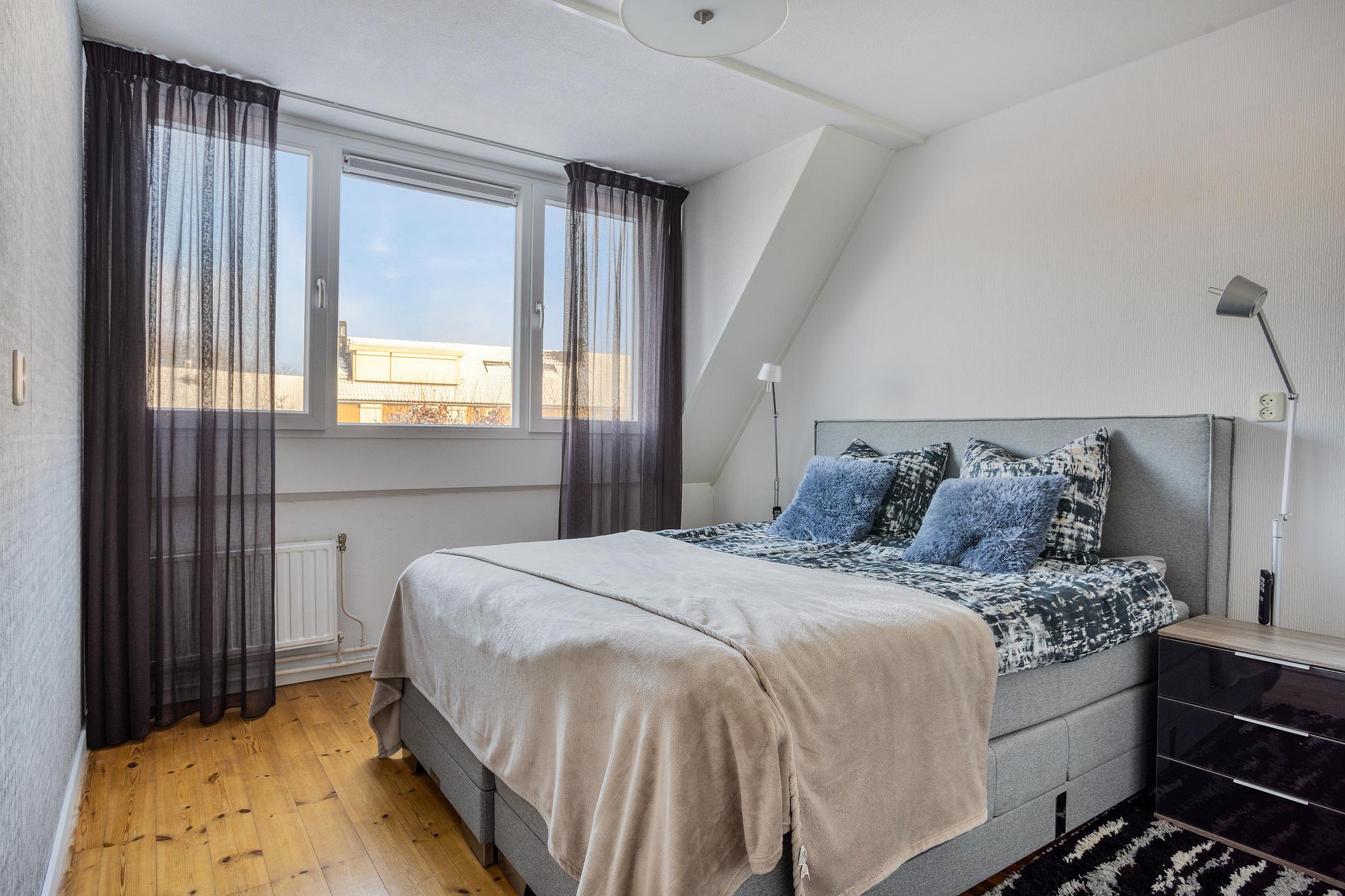 Een échte hoofdslaapkamer van ruim 12,5 m2 waar je een royaal tweepersoonsbed en kledingkast met gemak in kunt plaatsen. Het dakkapel - met elektrisch bedienbaar rolluik - is een absolute aanwinst en geeft niet alleen een mooi zicht op de achtertuin, maar maakt de kamer ook fijner om in te richten.