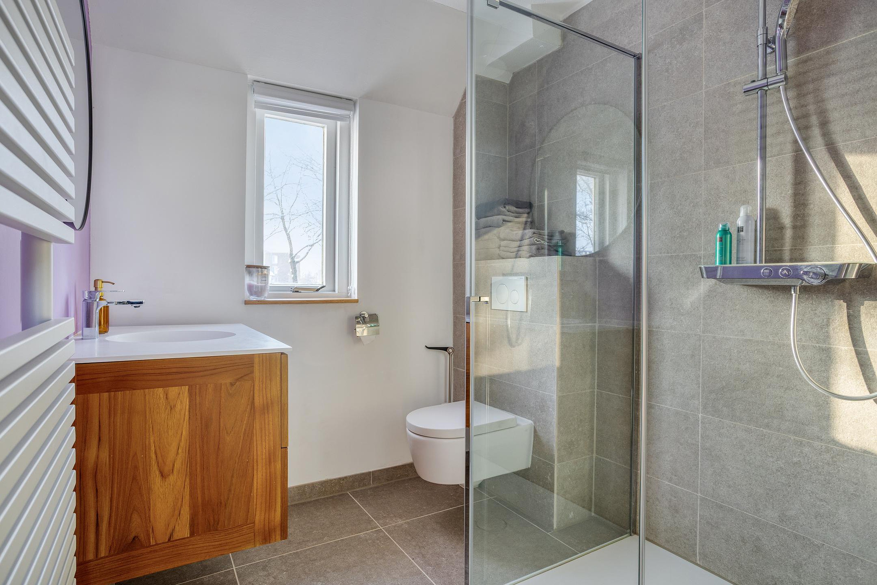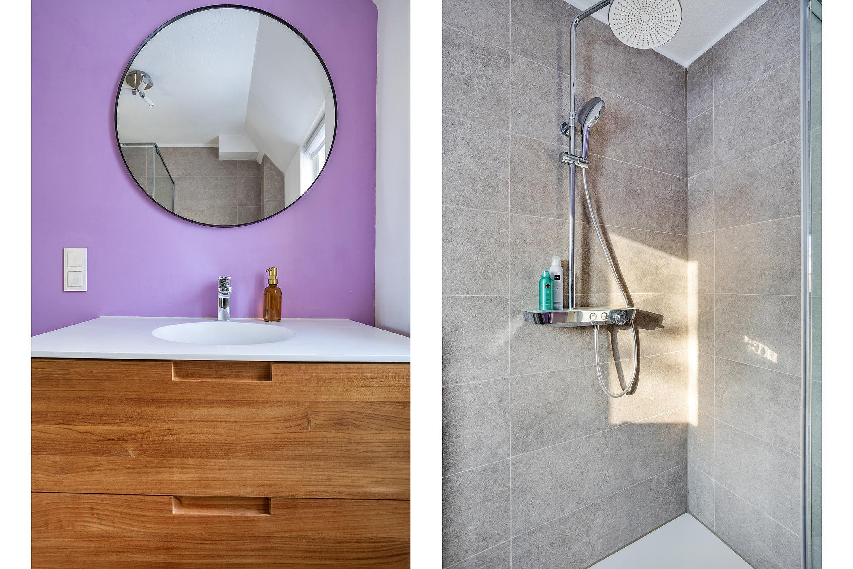Strakke en sfeervolle badkamer. Een fijne plek om je in op te frissen. Het daglicht komt goed binnen via het raam, waarmee je ook de ruimte op natuurlijke wijze kunt ventileren. Koude voeten zul je niet krijgen door de aanwezige vloerverwarming. Mooi en leuk detail is de Van Gogh roze wand. Wil je liever een ander kleurtje op de wand? Dan kan dat altijd: zo druk je vrij makkelijk je eigen stempel op de badkamer zonder deze te verbouwen.