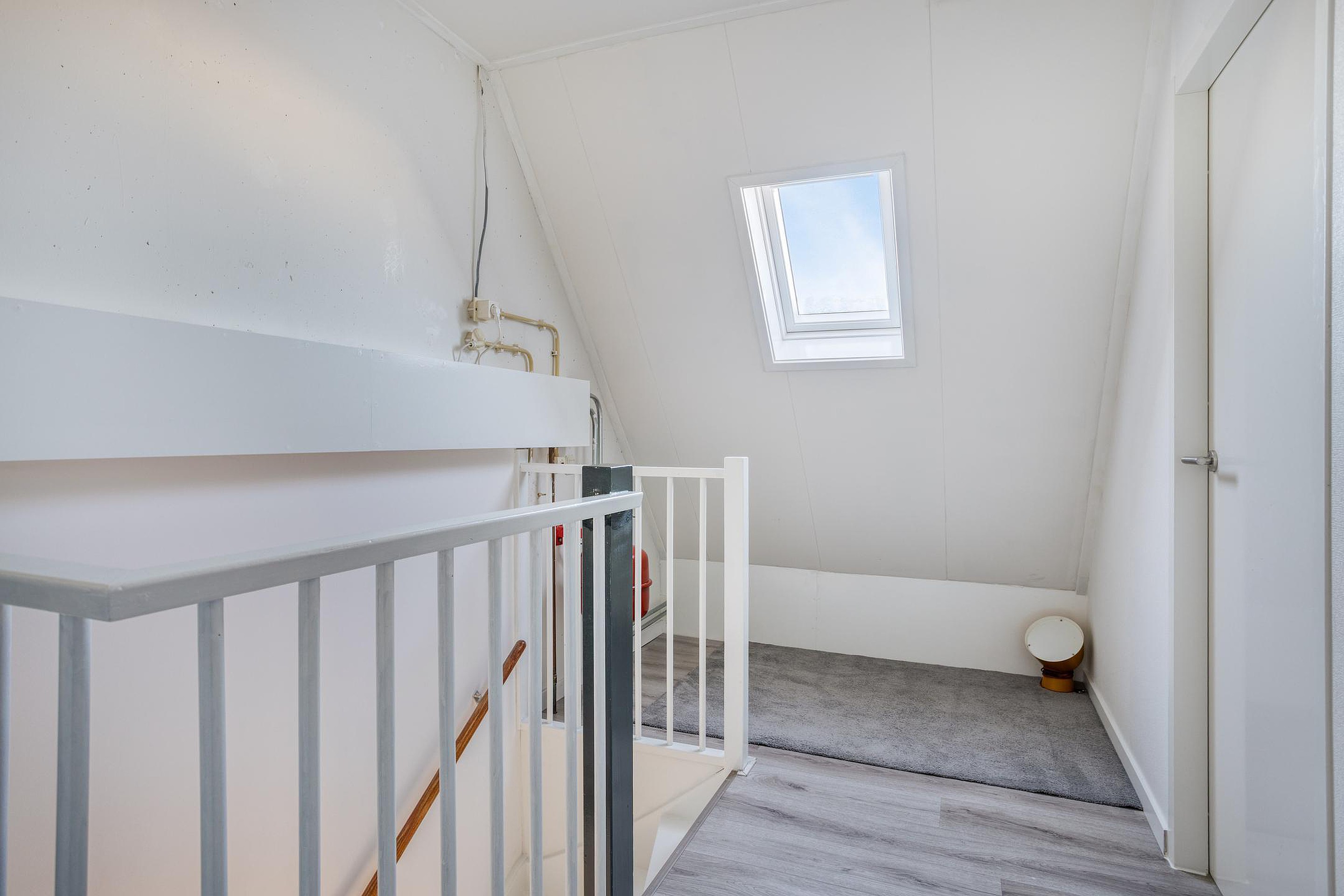 De ruime voorzolder is voorzien van een dakraam aan de achterzijde. Hier bevinden zich de opstelplaats voor de cv-ketel, de aansluitingen voor wasmachine en droger en de omvormer voor de zonnepanelen. Je hebt hier alle ruimte om je spullen en verzamelingen op te bergen.