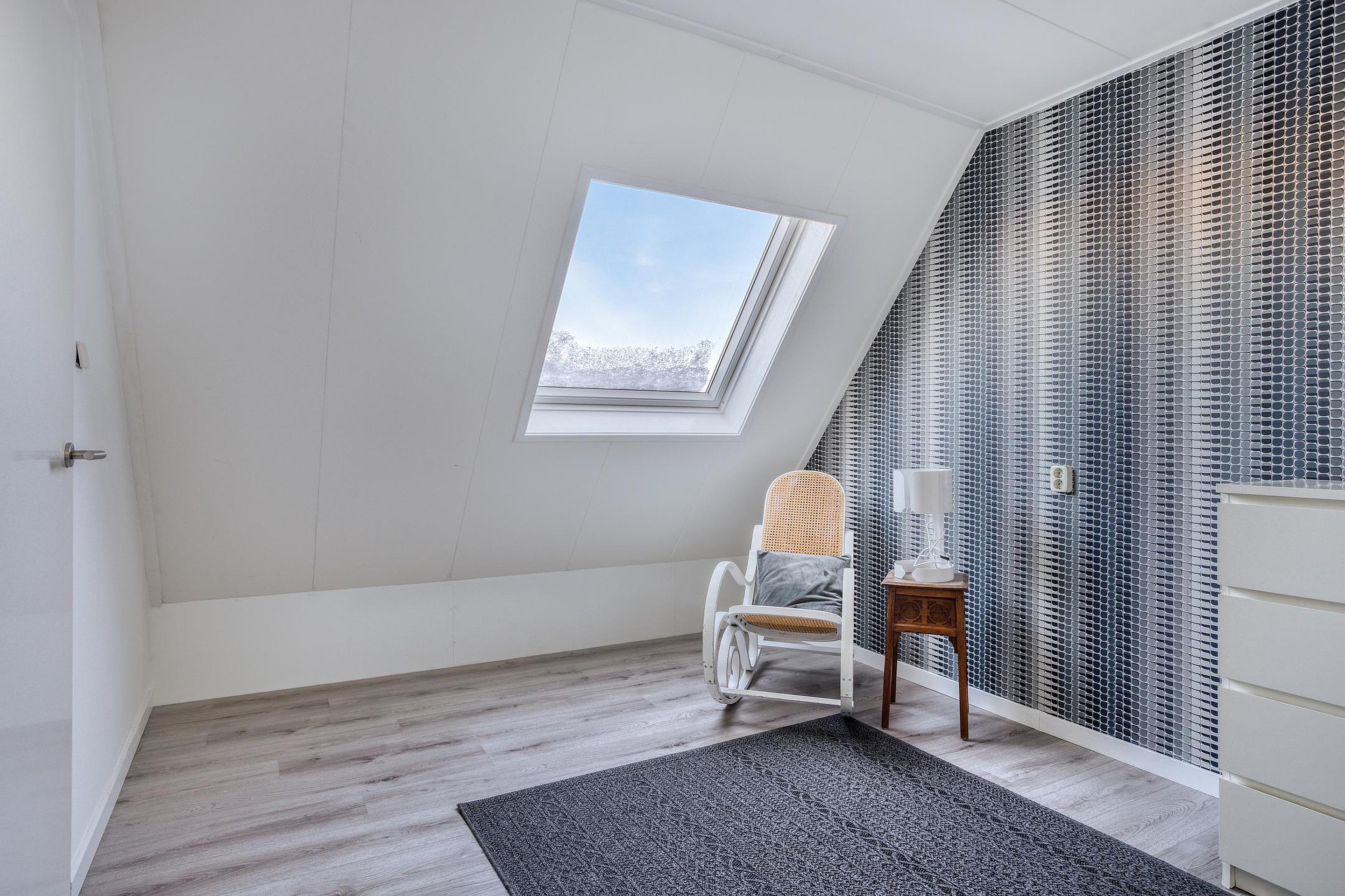 Super leuke slaapkamer met een royaal dakraam waar het daglicht goed binnen kan stromen. Het zal nog lastig kiezen worden wie deze kamer in gebruik zal gaan nemen. Menig tiener zal wel raad weten met deze kamer. Een bed, kledingkast en bureau passen er met gemak in. Achter de knieschotten kan het nodige worden opgeborgen.