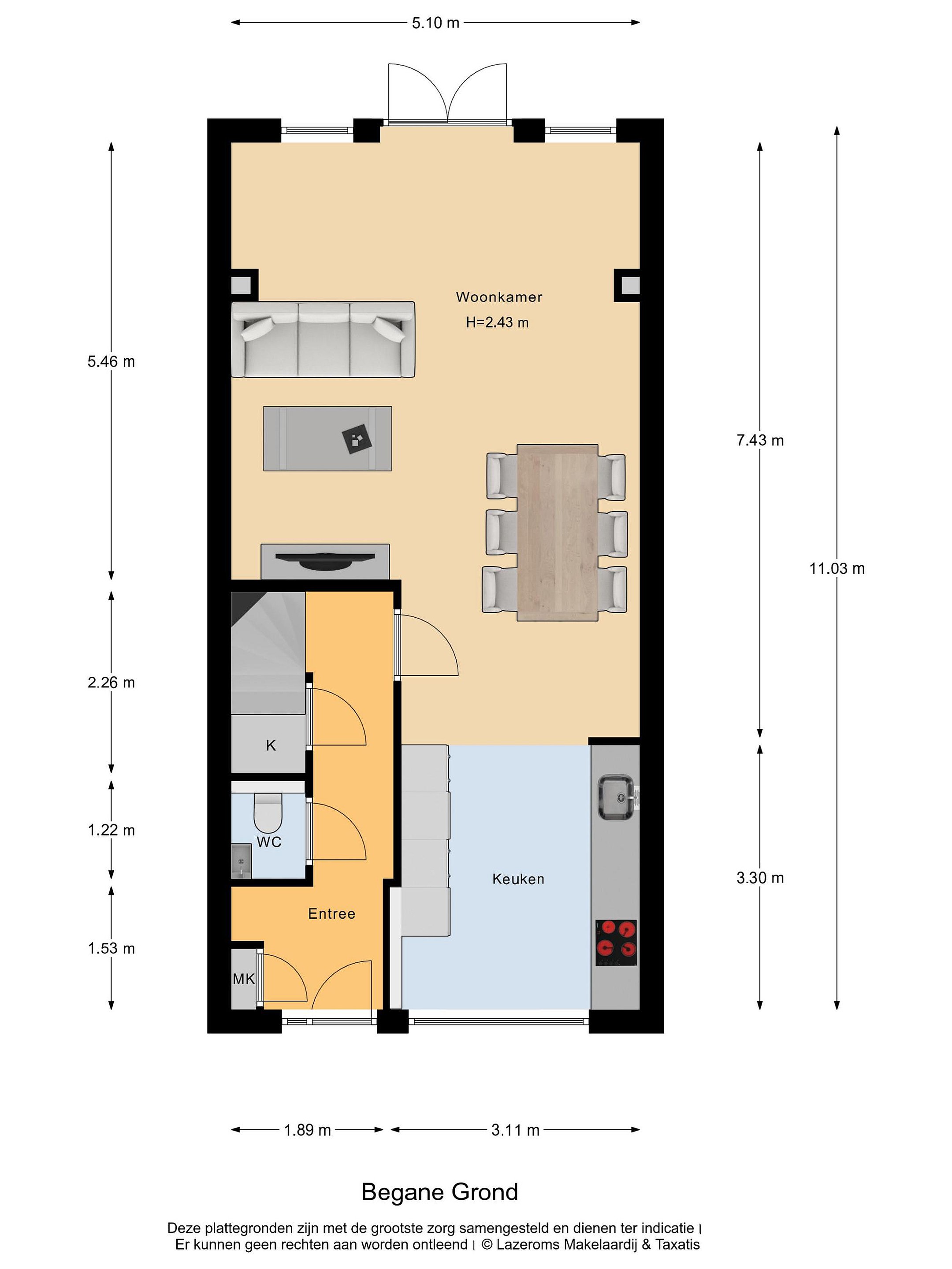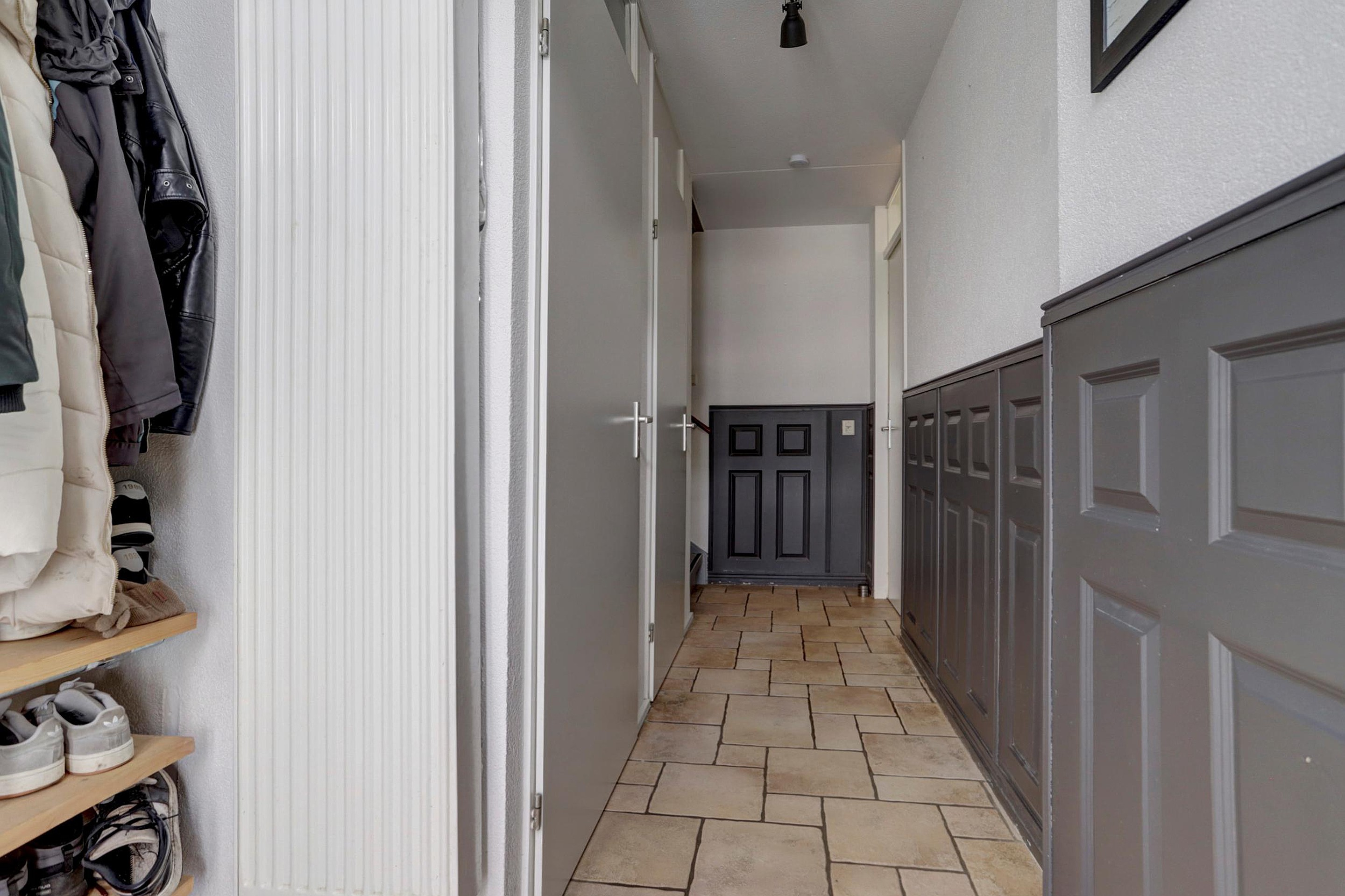 Via de verzorgde voortuin bereikt u de entree van de woning. In de hal bevinden zich de meterkast, het toilet, de trapkast en de trapopgang naar de eerste verdieping.