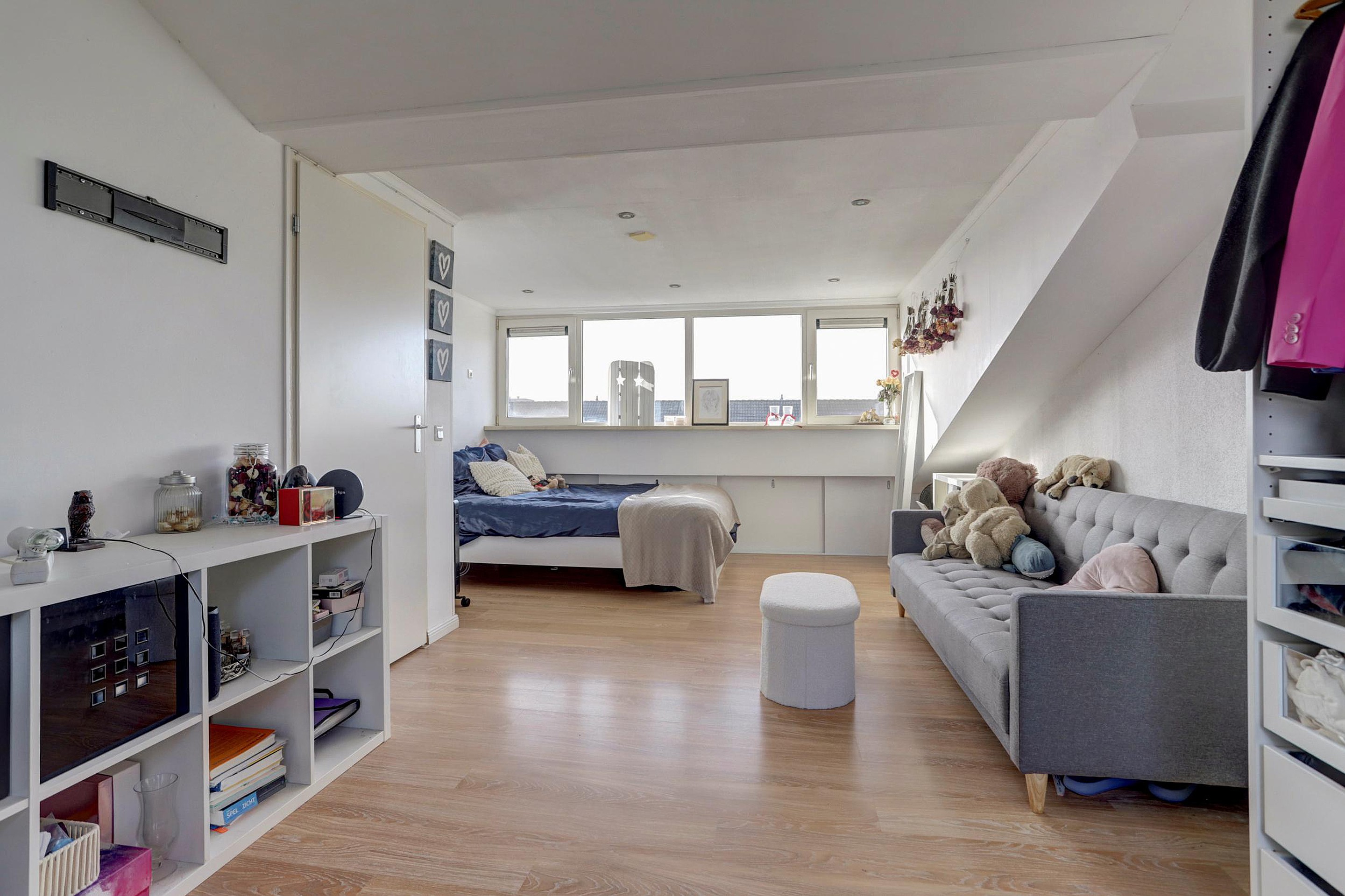 Daarnaast is hier een ruime (ca. 22m2 vloeropp.) vierde slaapkamer gerealiseerd, mede dankzij de aanwezige dakkapel. Deze kamer heeft een fijne plafondhoogte en veel lichtinval, waardoor het een volwaardige slaapkamer is. Ook is er extra bergruimte aanwezig. Deze verdieping is ideaal als ouderslaapkamer, tienerkamer of werkruimte.