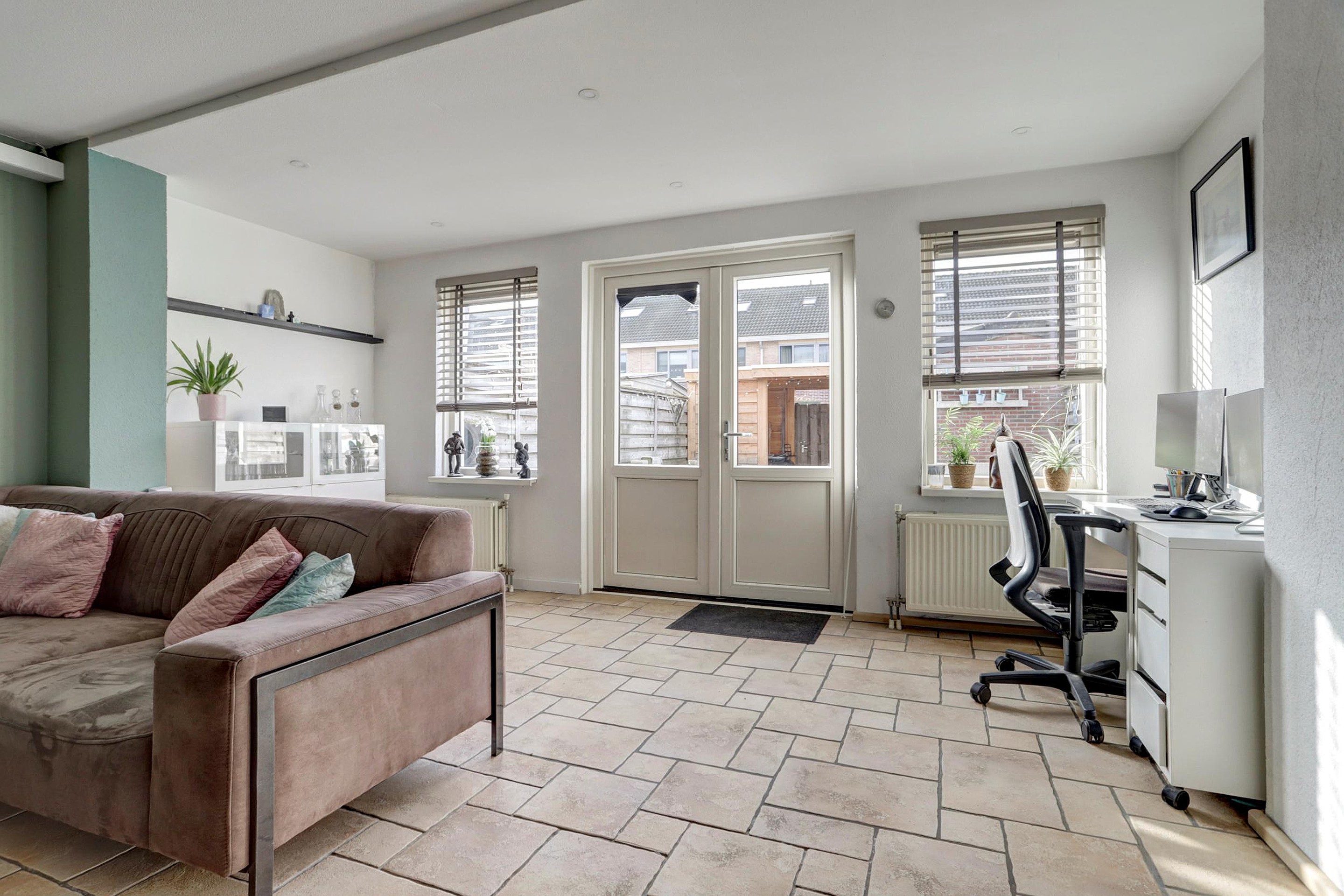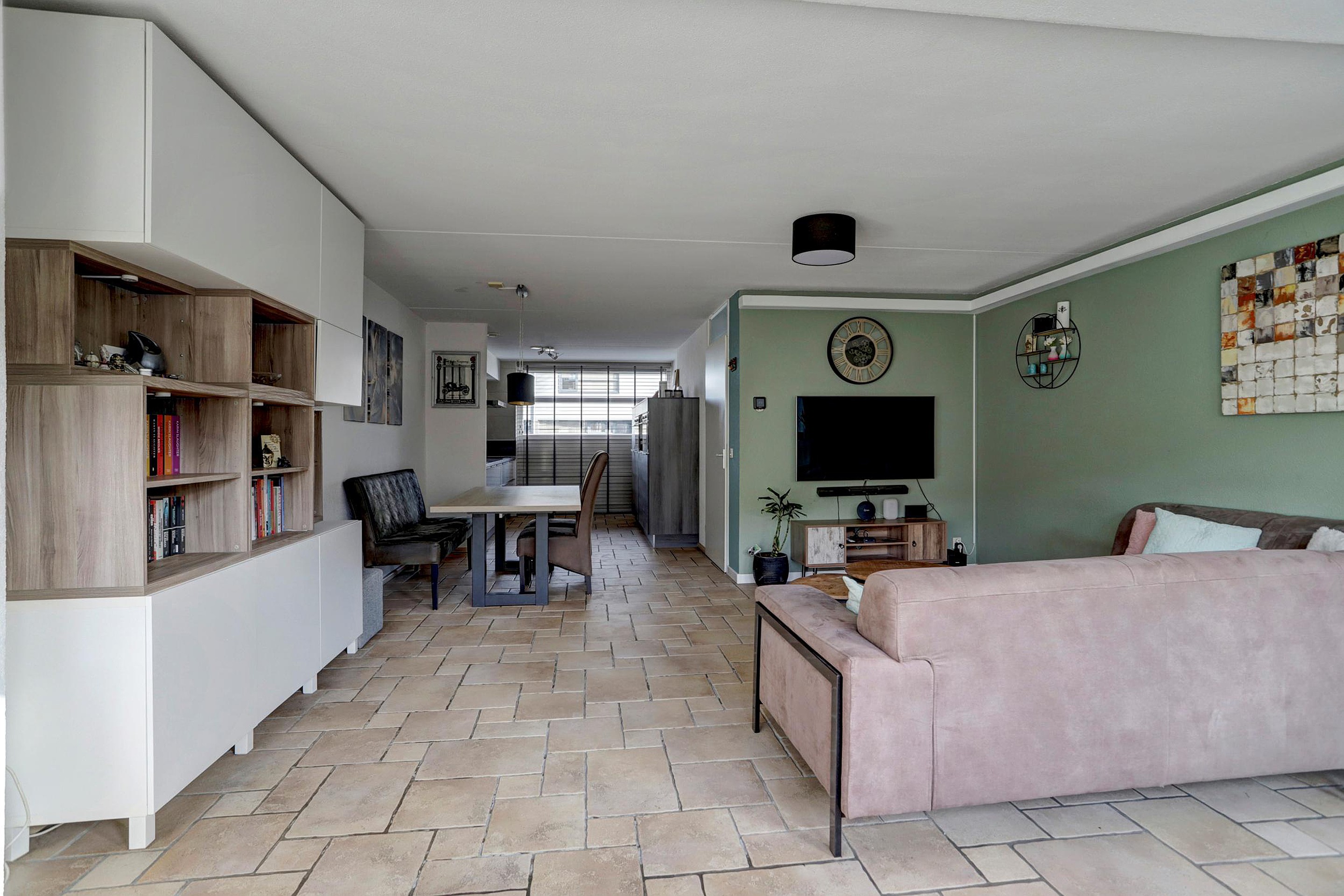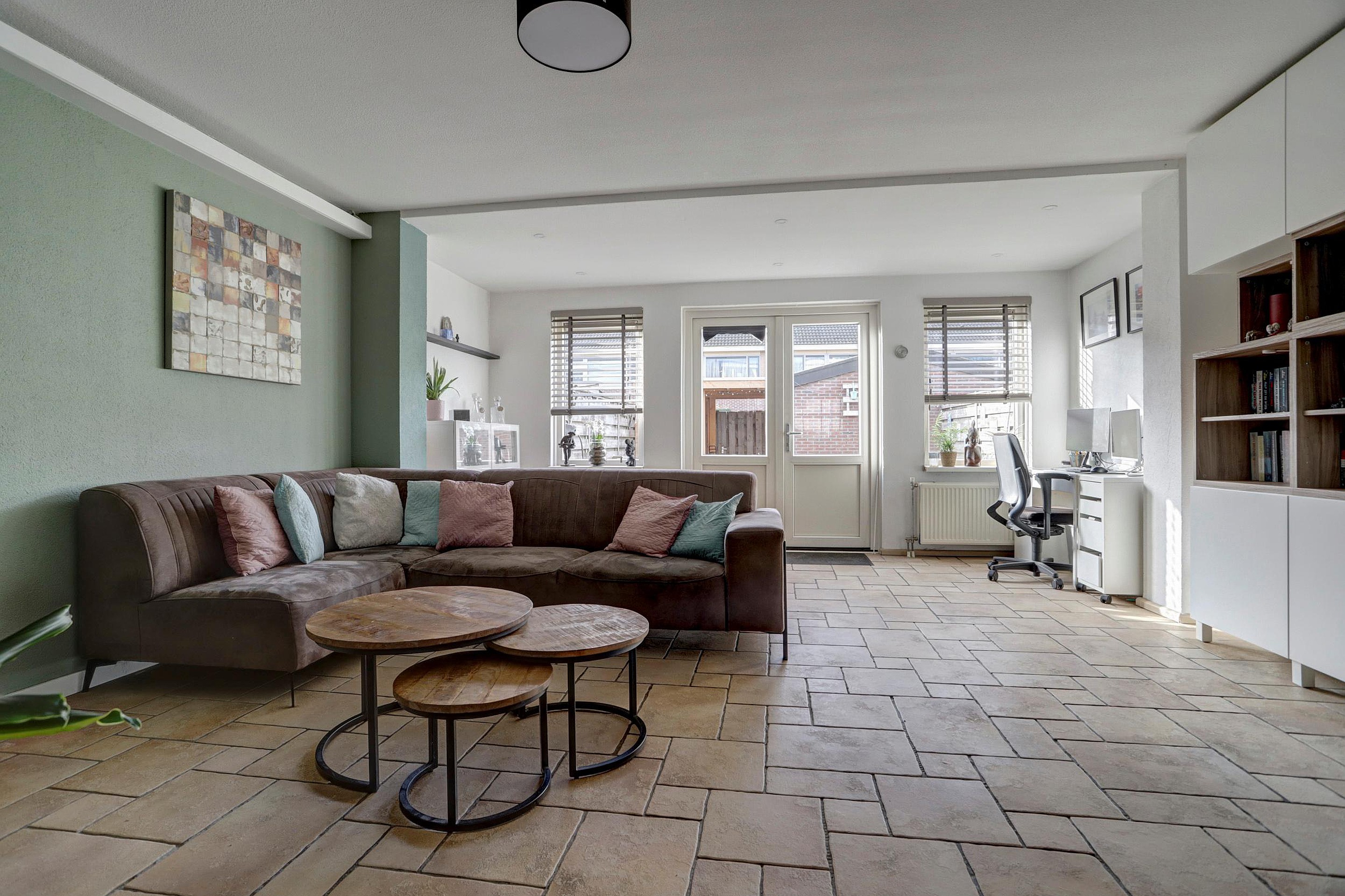 Vanuit de hal loop je door naar de lichte woonkamer. Wat direct opvalt is de prettige lichtinval door de grote raampartijen aan zowel de voor- als achterzijde. De woonkamer is ruim opgezet (ca. 34m2) en biedt door de uitbouw voldoende plaats voor een royale zithoek en een ruime eethoek. De afwerking is verzorgd met een sfeervolle tegelvloer en spachtelputz wanden.