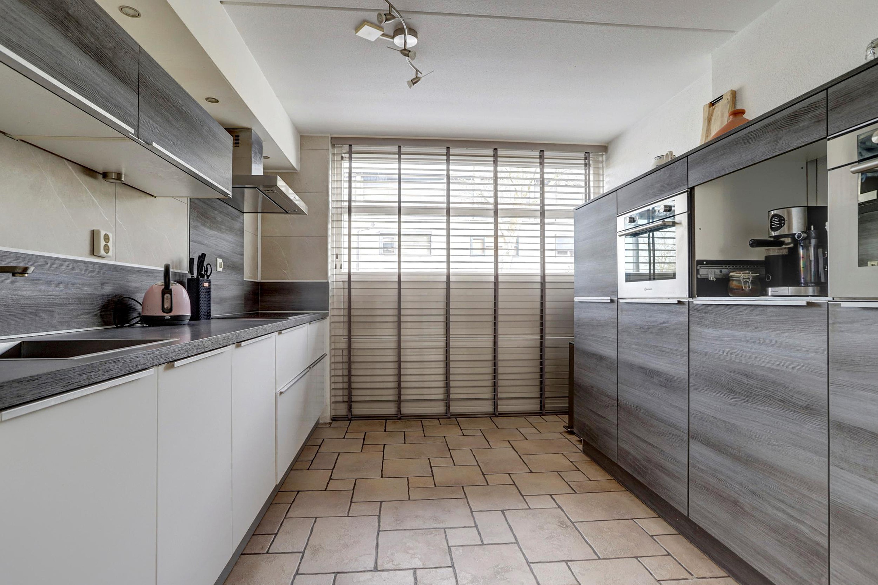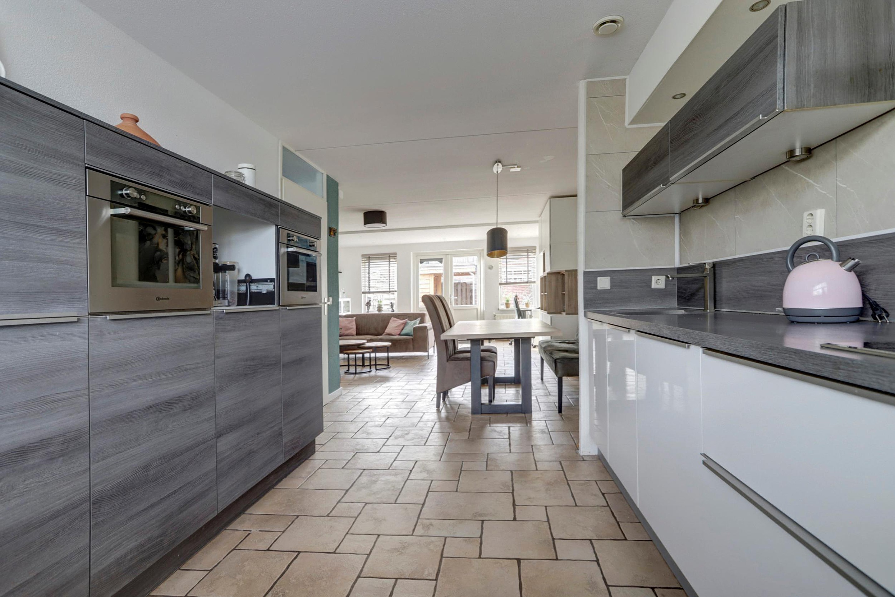 Aan de voorzijde bevindt zich de halfopen keuken in moderne kleurstelling. De keuken is opgesteld in een praktische dubbele wandopstelling en voorzien van diverse inbouwapparatuur, waaronder een inductie kookplaat, afzuigkap, 2 x een combimagnetron/oven, wasbak, koelkast en vaatwasser. Dankzij de vele kastruimte en het ruime werkblad is dit een fijne plek om te koken. Vanuit de woonkamer heb je via de openslaande deuren direct toegang tot de achtertuin.