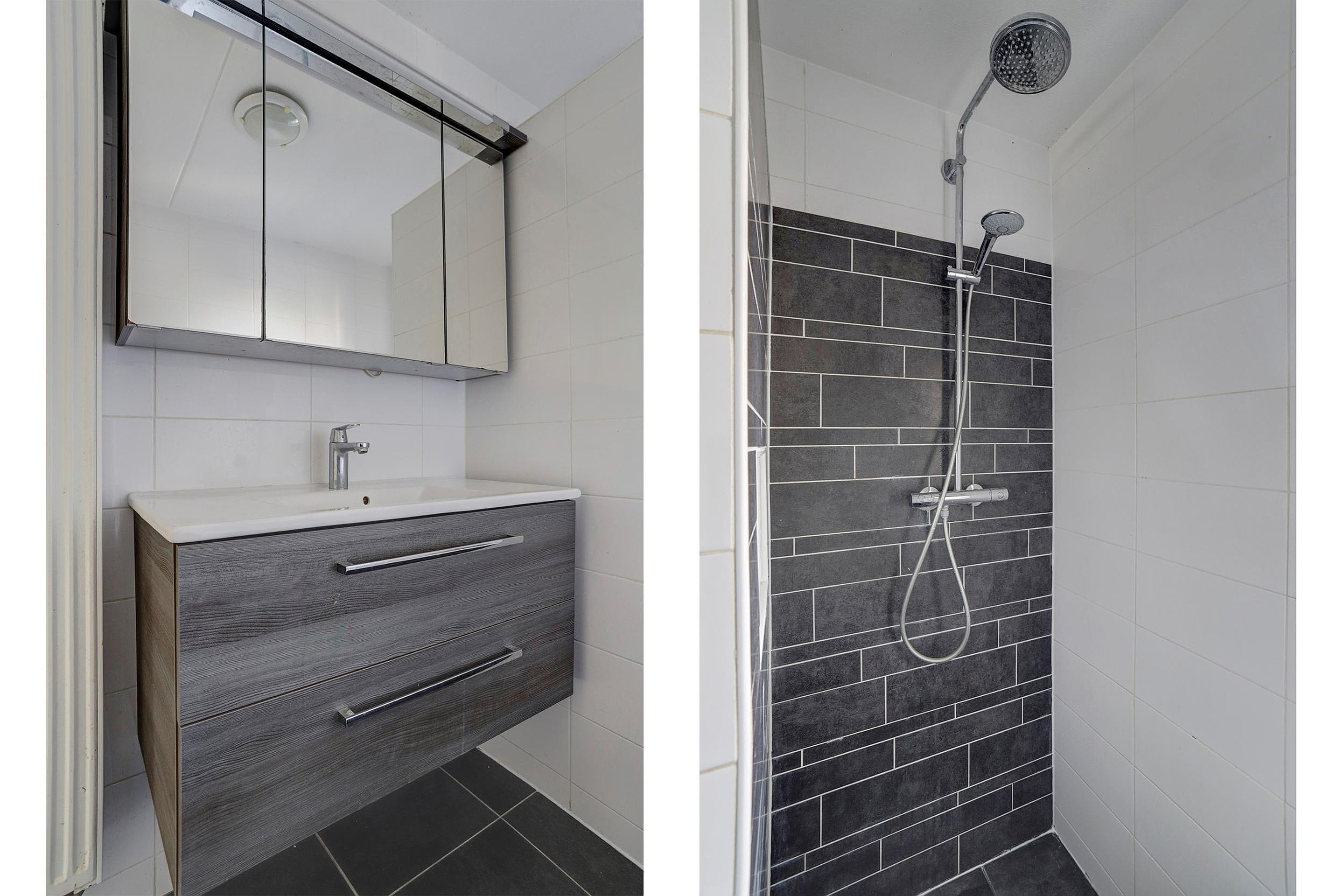De badkamer (ca. 5,5m2) is modern uitgevoerd met een inloopdouche voorzien van regendouche, een ligbad, een wastafelmeubel met spiegelkast, een toilet en strak tegelwerk in lichte en donkere tinten. Hier beschik je over een comfortabele en eigentijdse badkamer.