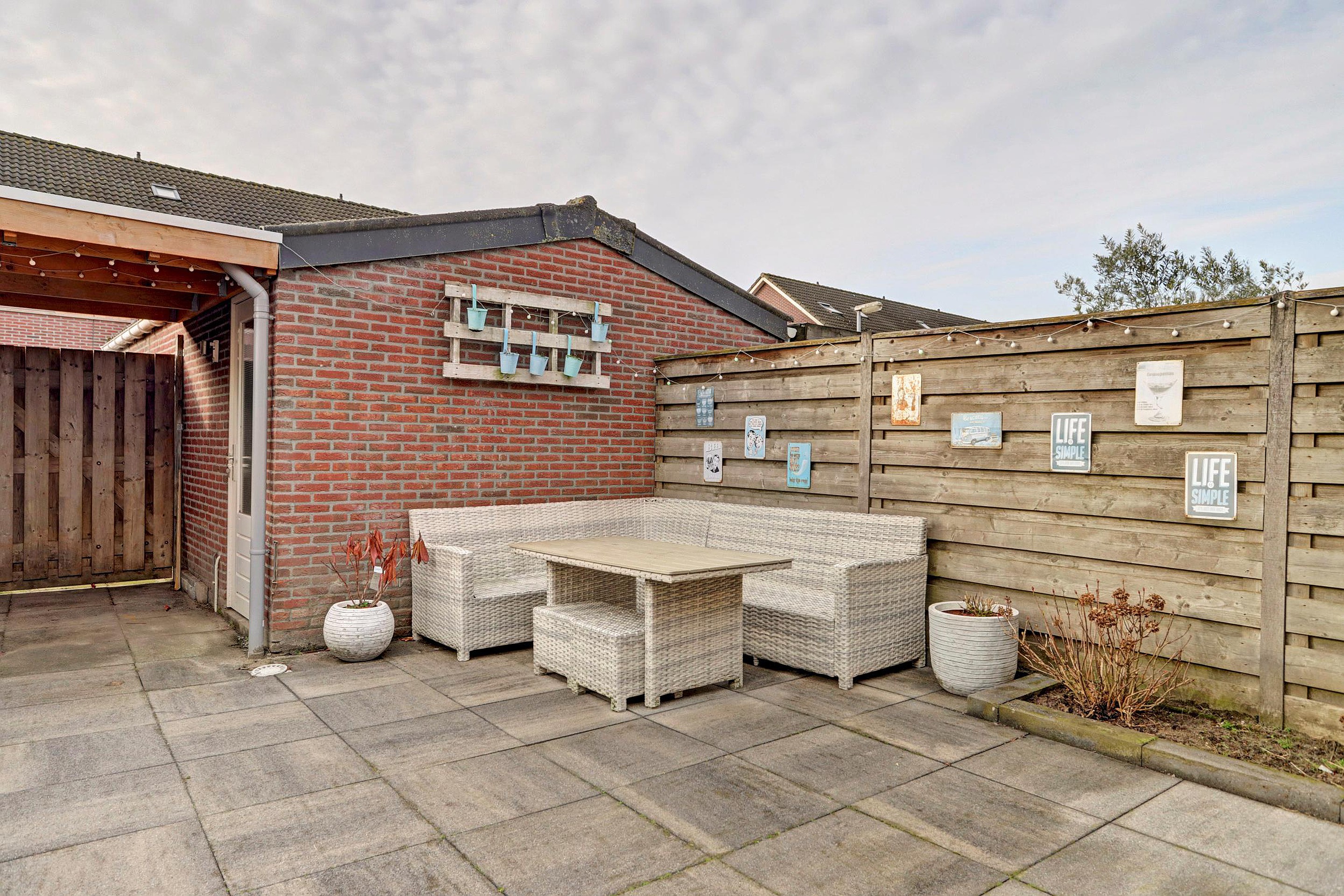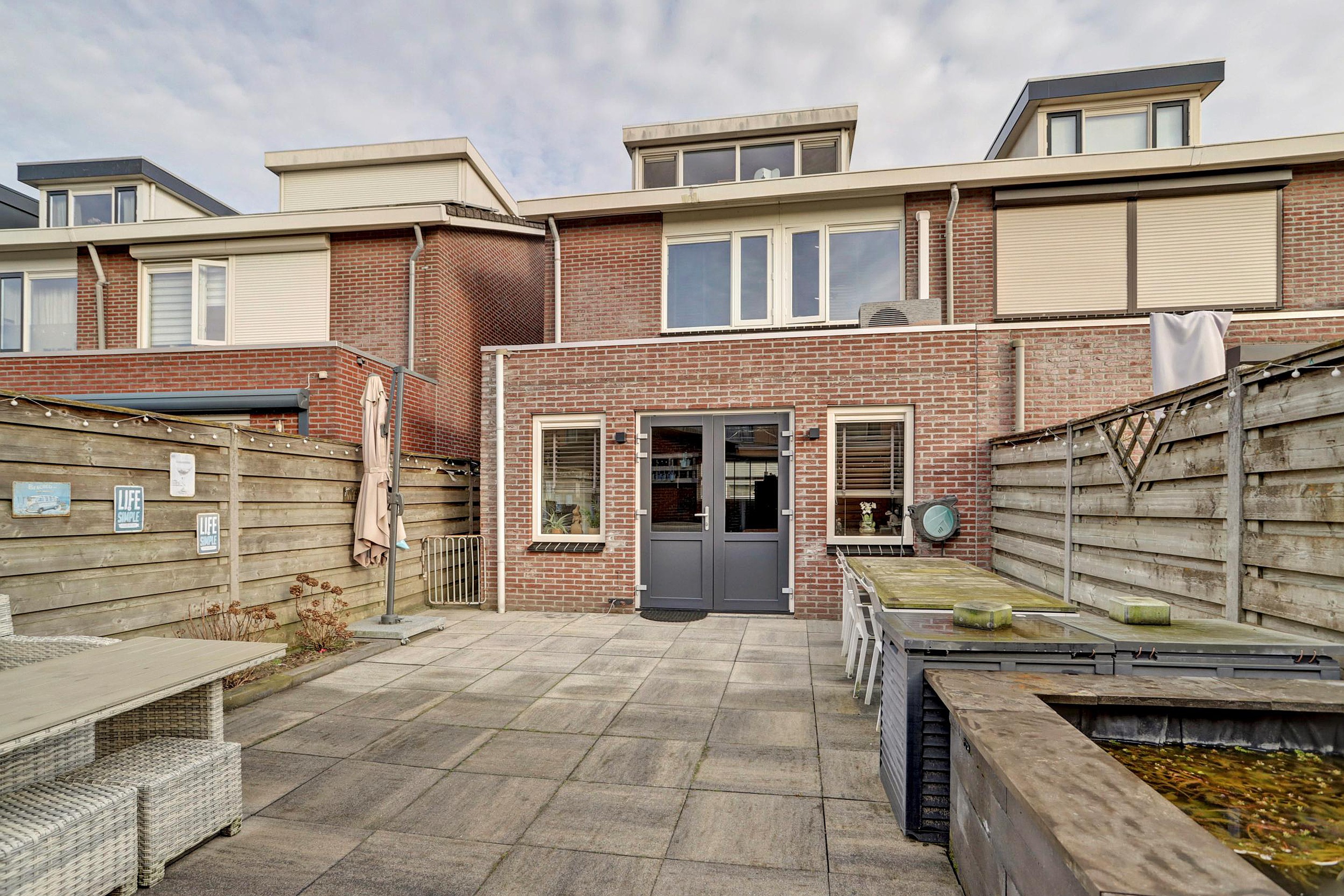 De achtertuin is ruim, onderhoudsvriendelijk aangelegd, volledig bestraat en op het Zuiden gelegen. Hierdoor beschik je over volop ruimte voor meerdere zitplekken en altijd volop zon in de tuin. Achter in de tuin bevindt zich een stenen berging met aangrenzende overkapping, ideaal voor het stallen van fietsen en het opbergen van tuinspullen. Dankzij de diepte van de tuin kun je hier heerlijk genieten van rust en privacy.