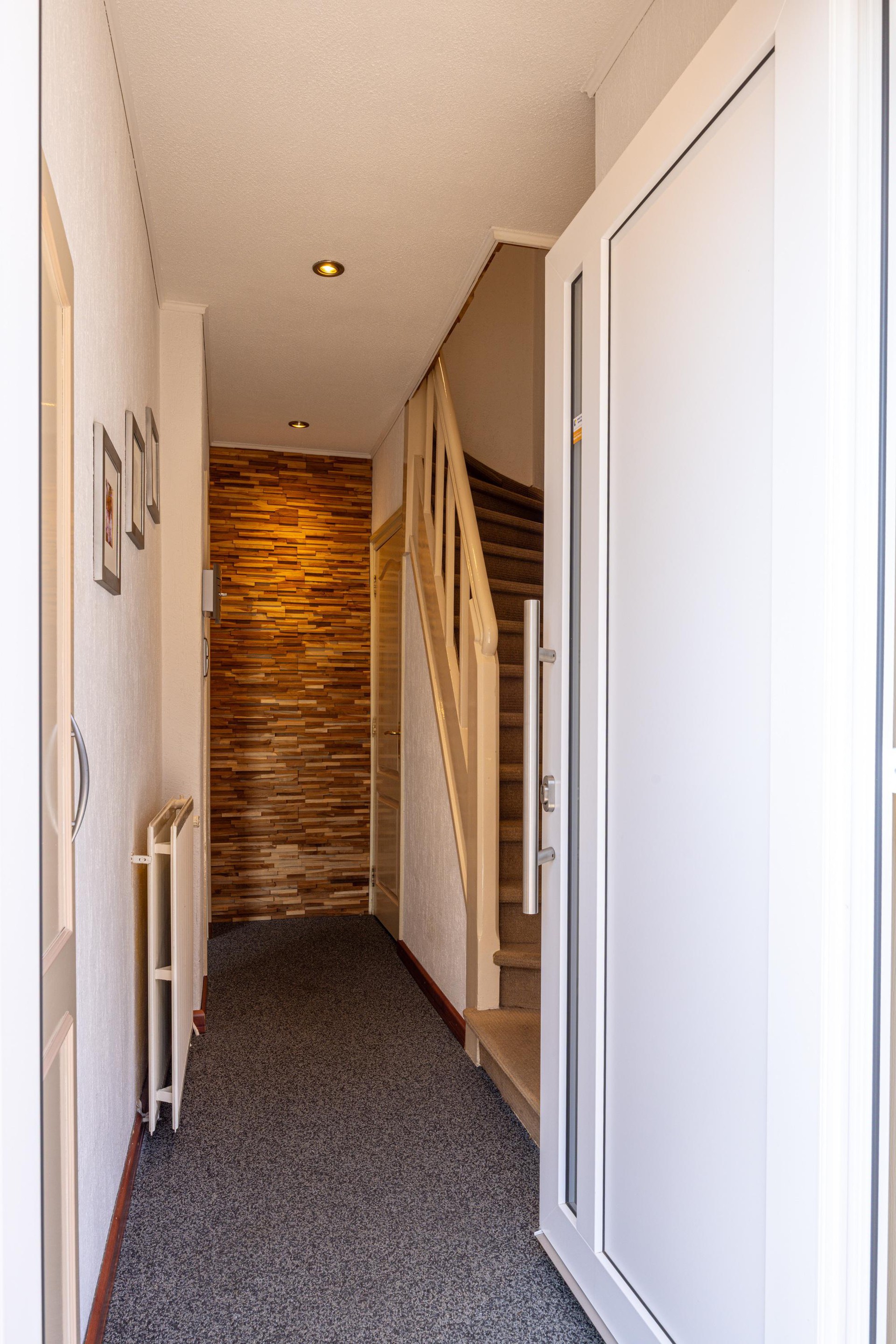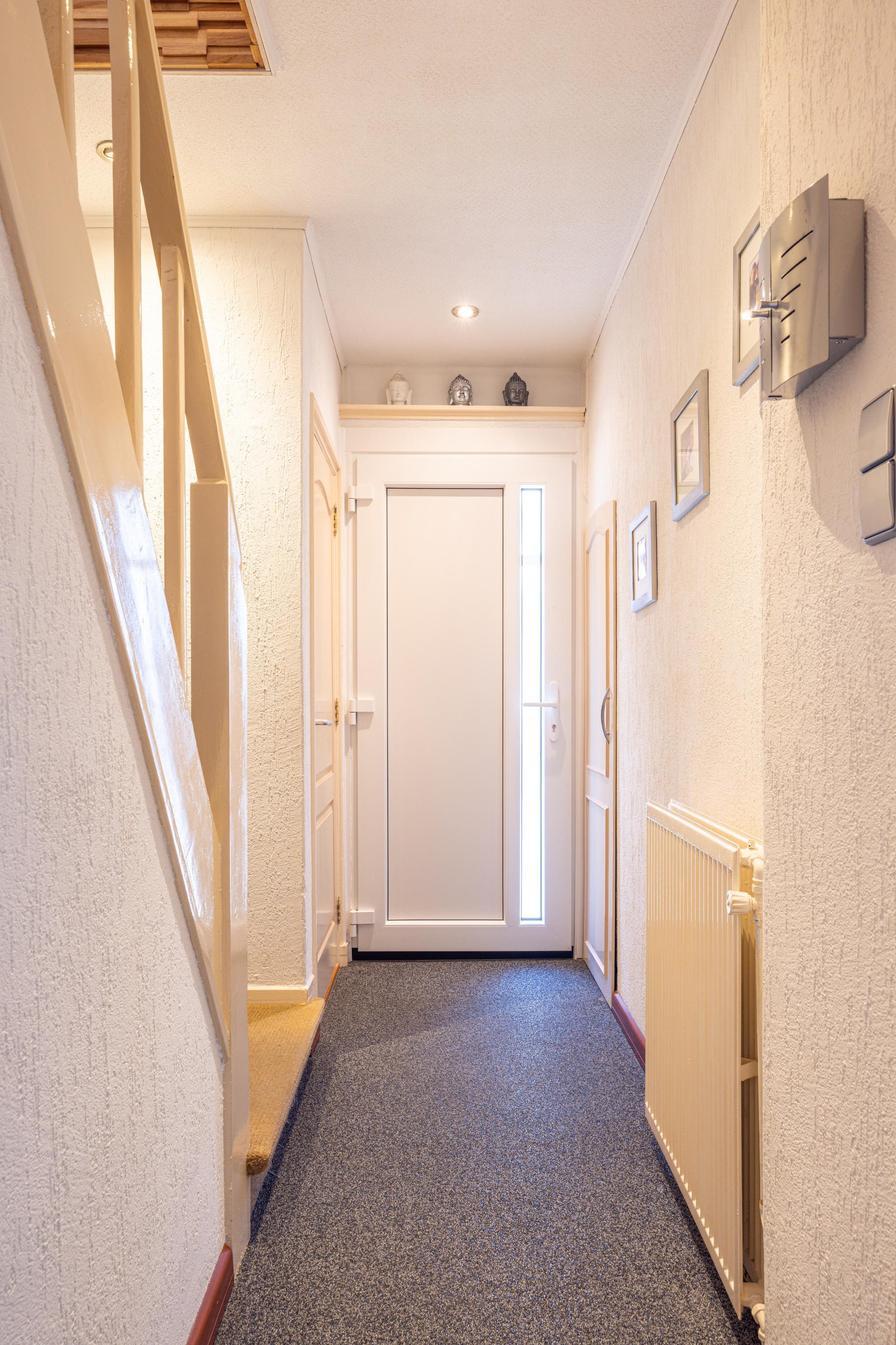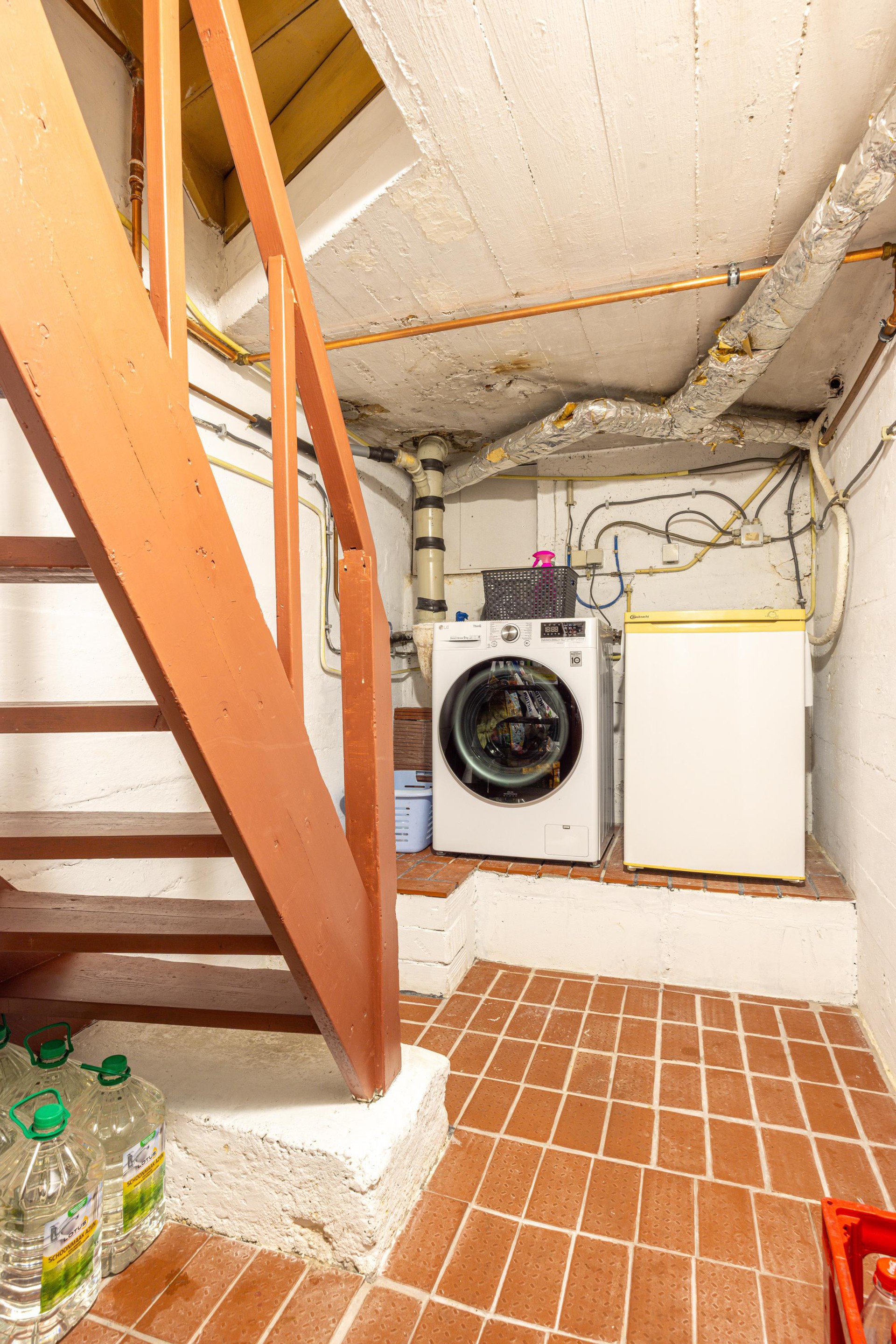 Begane grond Via de entree kom je in de ontvangsthal van de woning. Deze ruimte is afgewerkt met een grindvloer en beschikt over een garderobe, meterkast en een toiletruimte. Vanuit de hal is tevens de provisiekelder bereikbaar waar de witgoedaansluitingen zijn gesitueerd. Vanuit hier is er toegang tot de woonkamer en de trap naar de eerste verdieping.