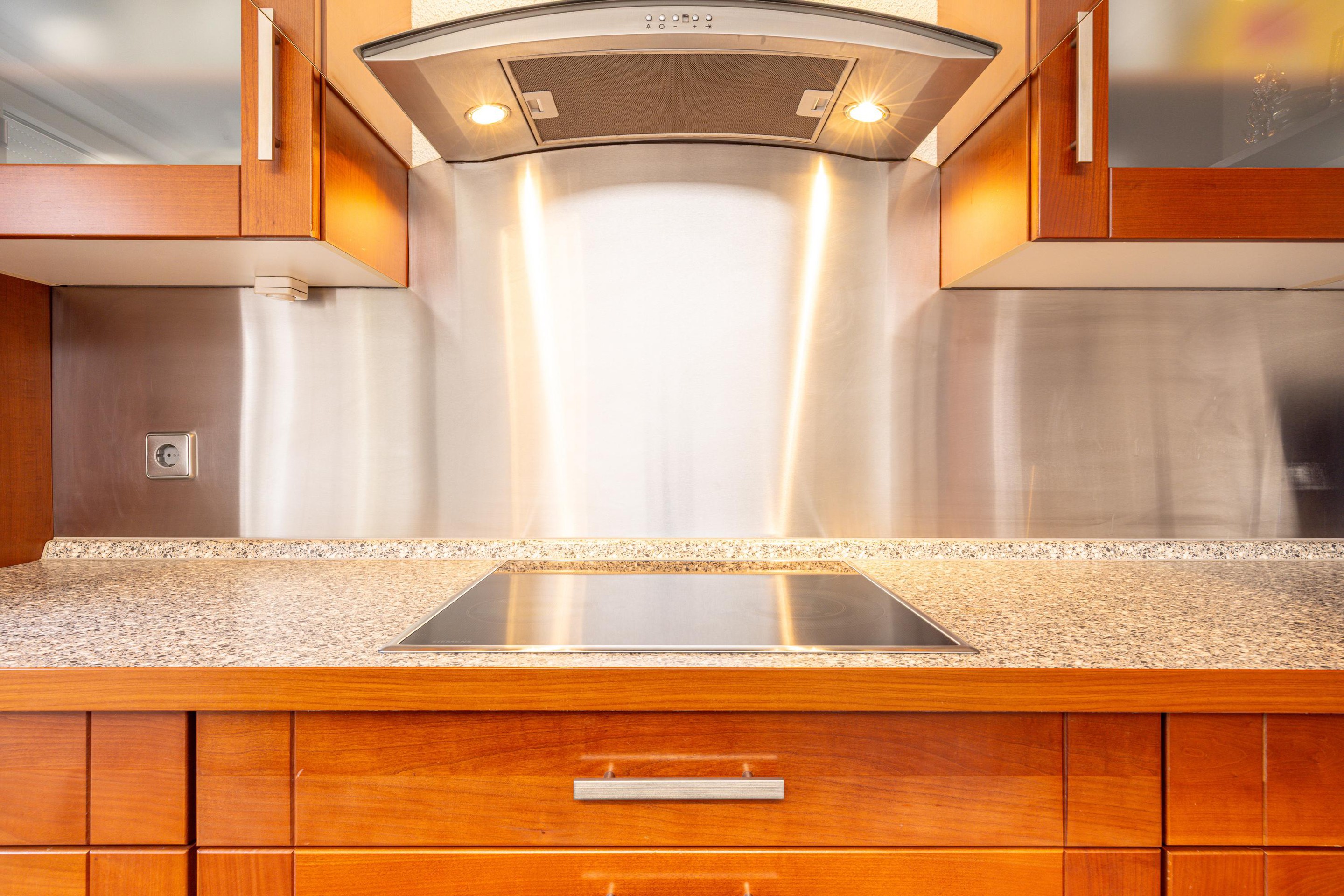 De keuken is uitgevoerd in een hoekopstelling en biedt veel werkblad en kastruimte. De keuken is voorzien van diverse inbouwapparatuur, waaronder een keramische kookplaat, afzuigkap, koelkast en vaatwasser. Een lichtkoepel zorgt voor extra daglicht in de ruimte. Daarnaast is hier een elektrische boiler geplaatst en een airco aanwezig die zowel kan koelen als verwarmen. Vanuit de keuken is er directe toegang tot de achtertuin en ook hier zijn rolluiken aanwezig. Dankzij de uitbouw is de begane grond merkbaar groter geworden en biedt deze volop leefruimte.