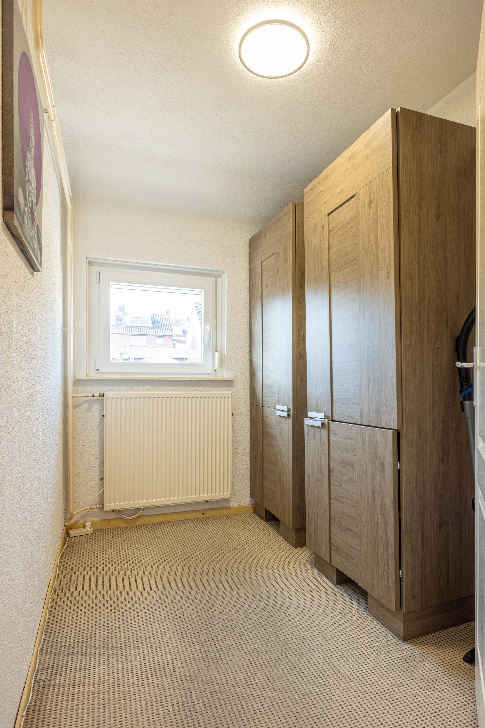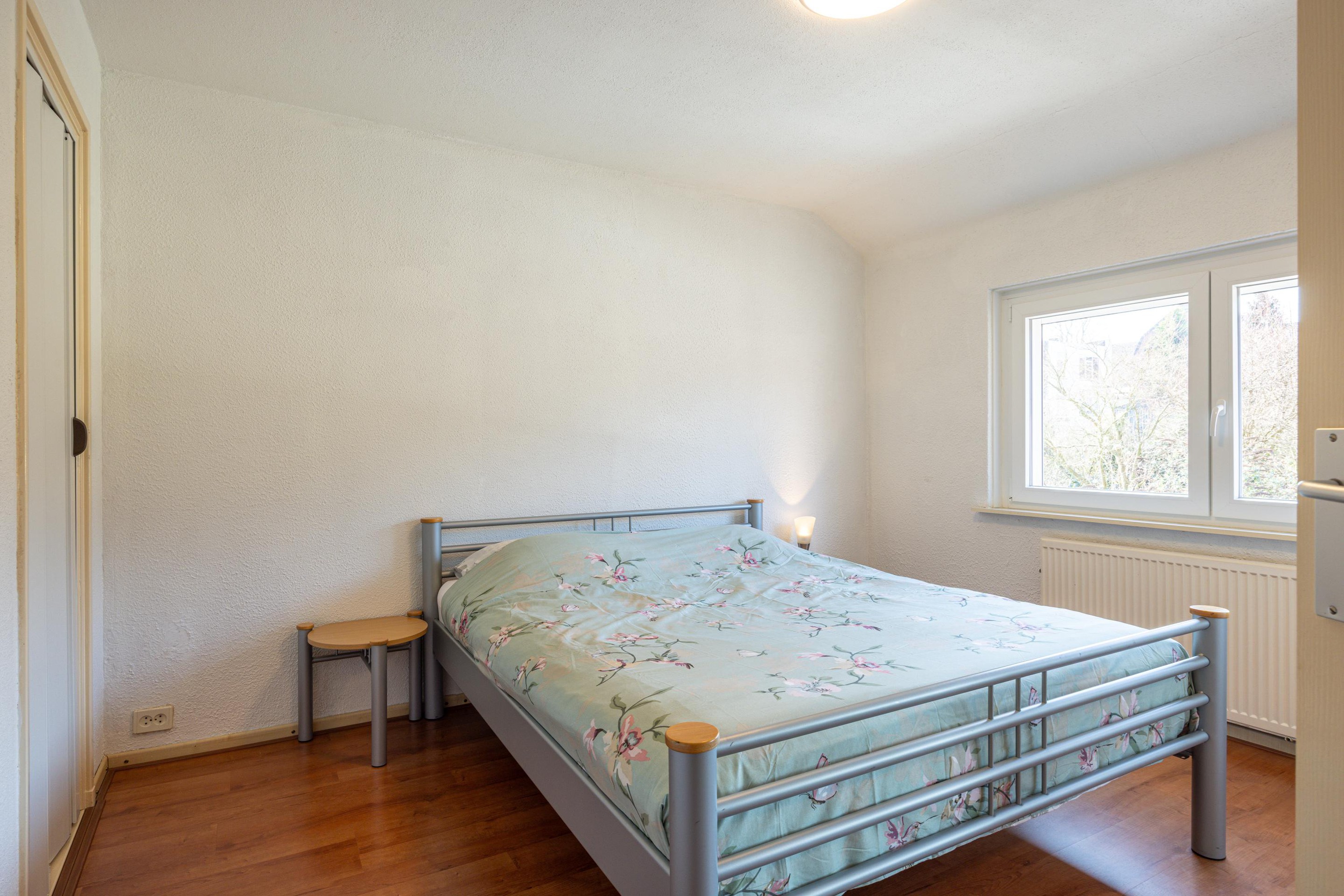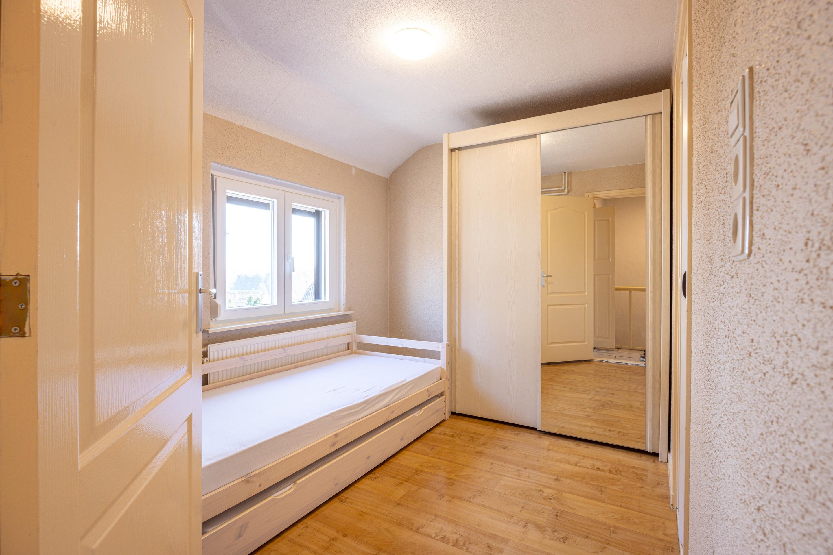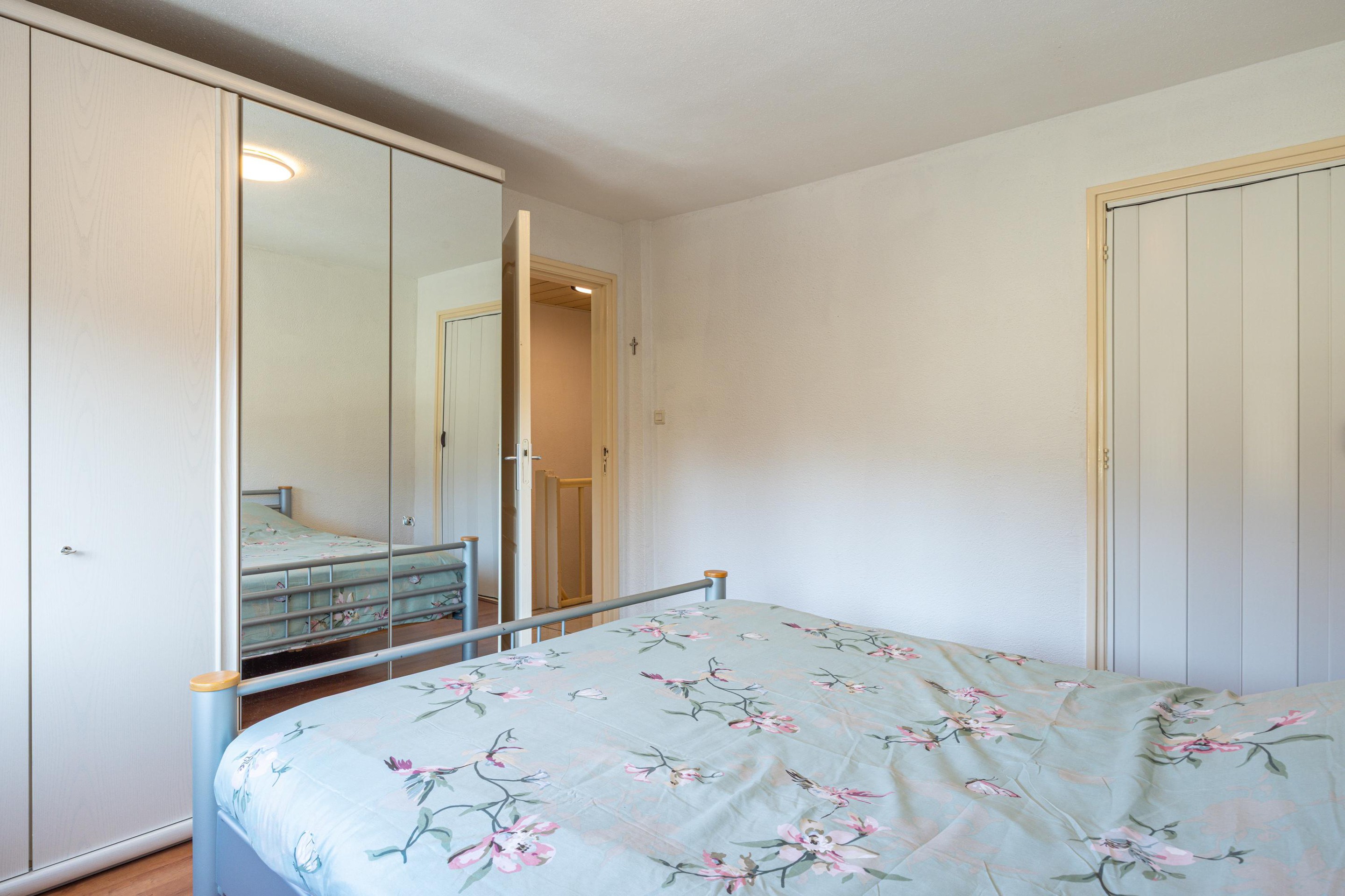 Eerste verdieping Via de trap in de hal bereik je de eerste verdieping. De overloop is afgewerkt met een tegelvloer en geeft toegang tot drie slaapkamers en de badkamer. Op de overloop bevindt zich tevens een airco die zowel kan koelen als verwarmen. De drie slaapkamers beschikken allemaal over prettig daglicht en zijn voorzien van rolluiken. Twee slaapkamers zijn afgewerkt met een laminaatvloer en beschikken over een muurkast. De derde kamer is voorzien van tapijt en kan uitstekend worden gebruikt als werk- of studeerkamer.