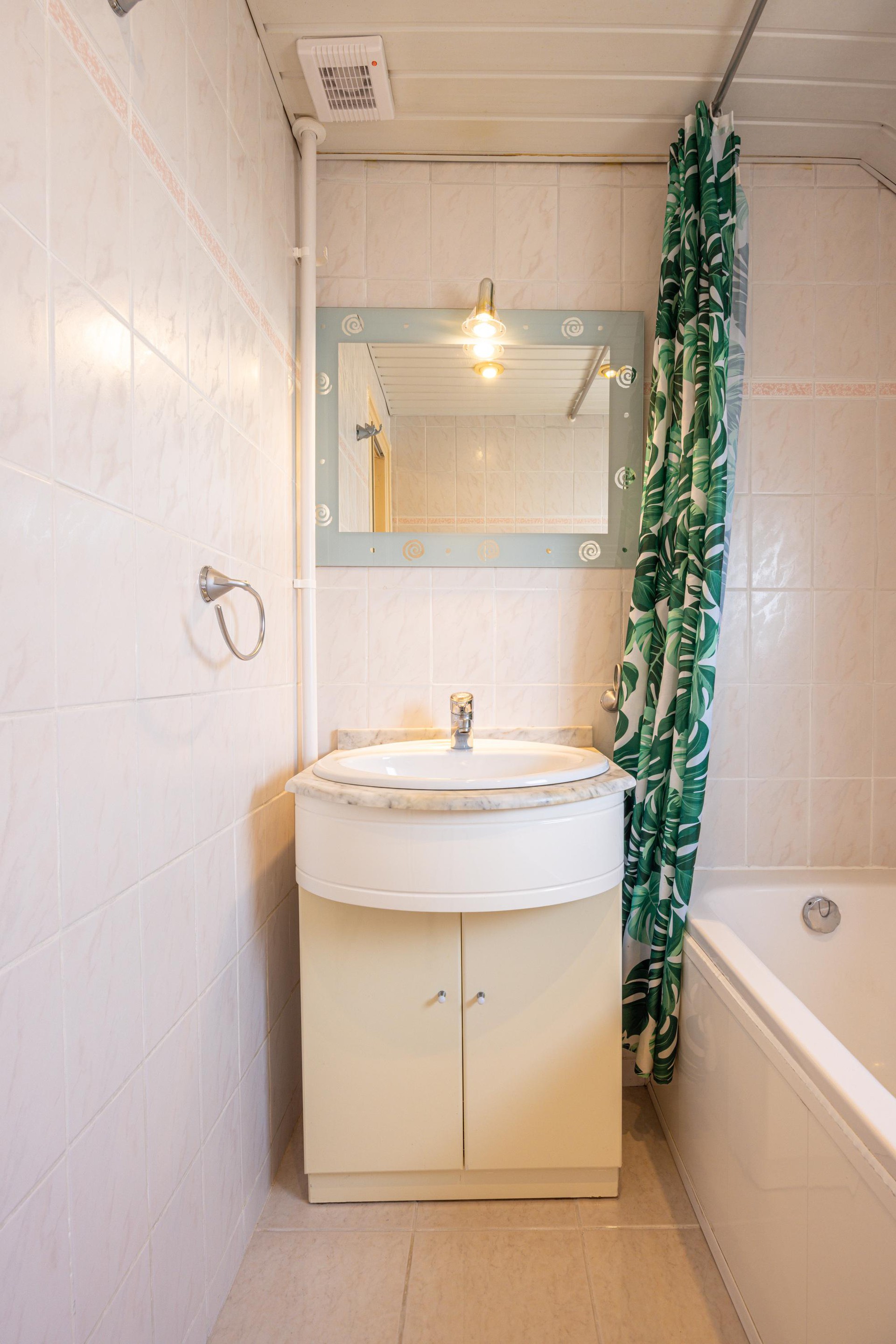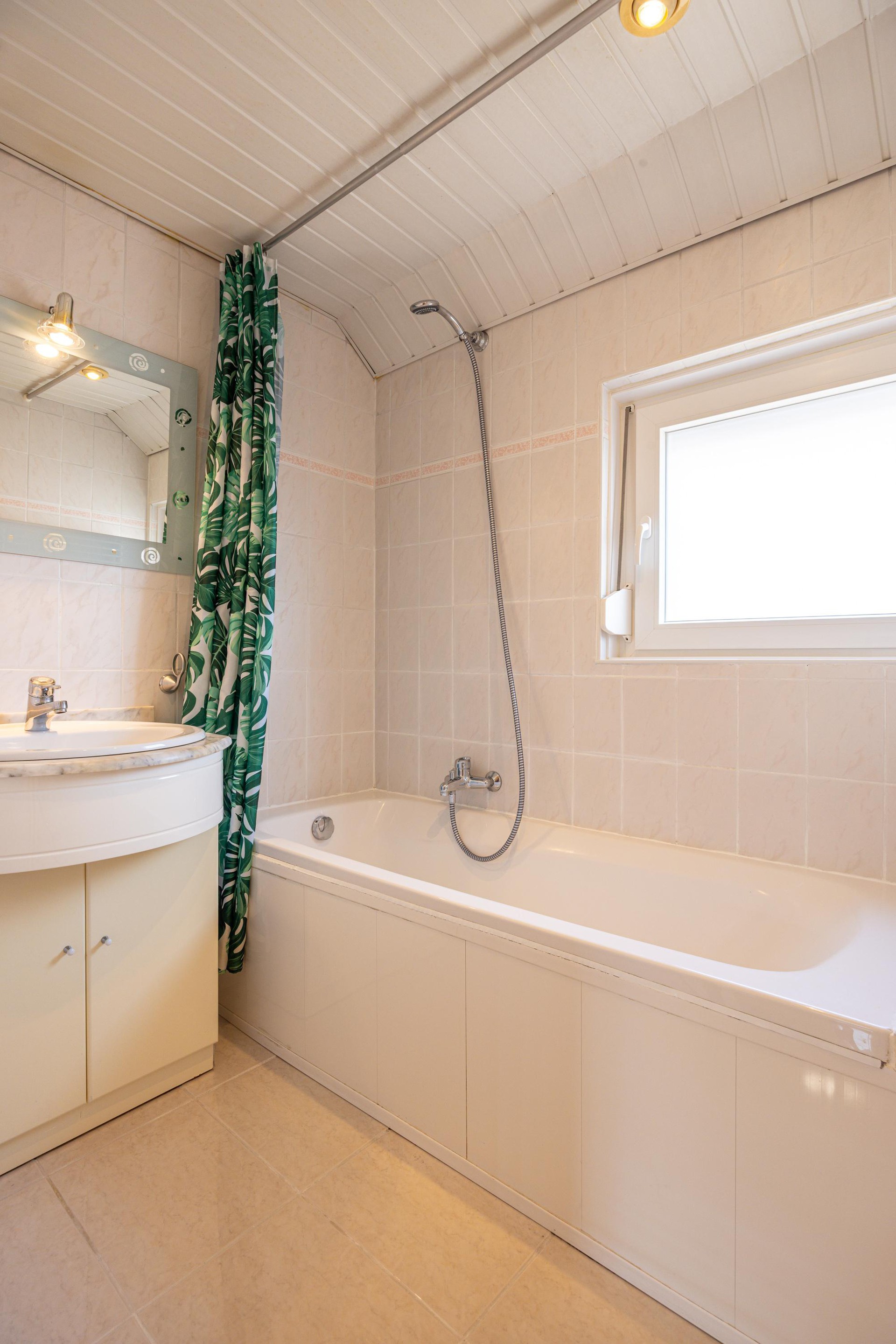 De badkamer is uitgerust met een ligbad met douche en een wastafel met meubel en spiegel. Een raam zorgt voor daglicht en ventilatie en is eveneens voorzien van een rolluik.
