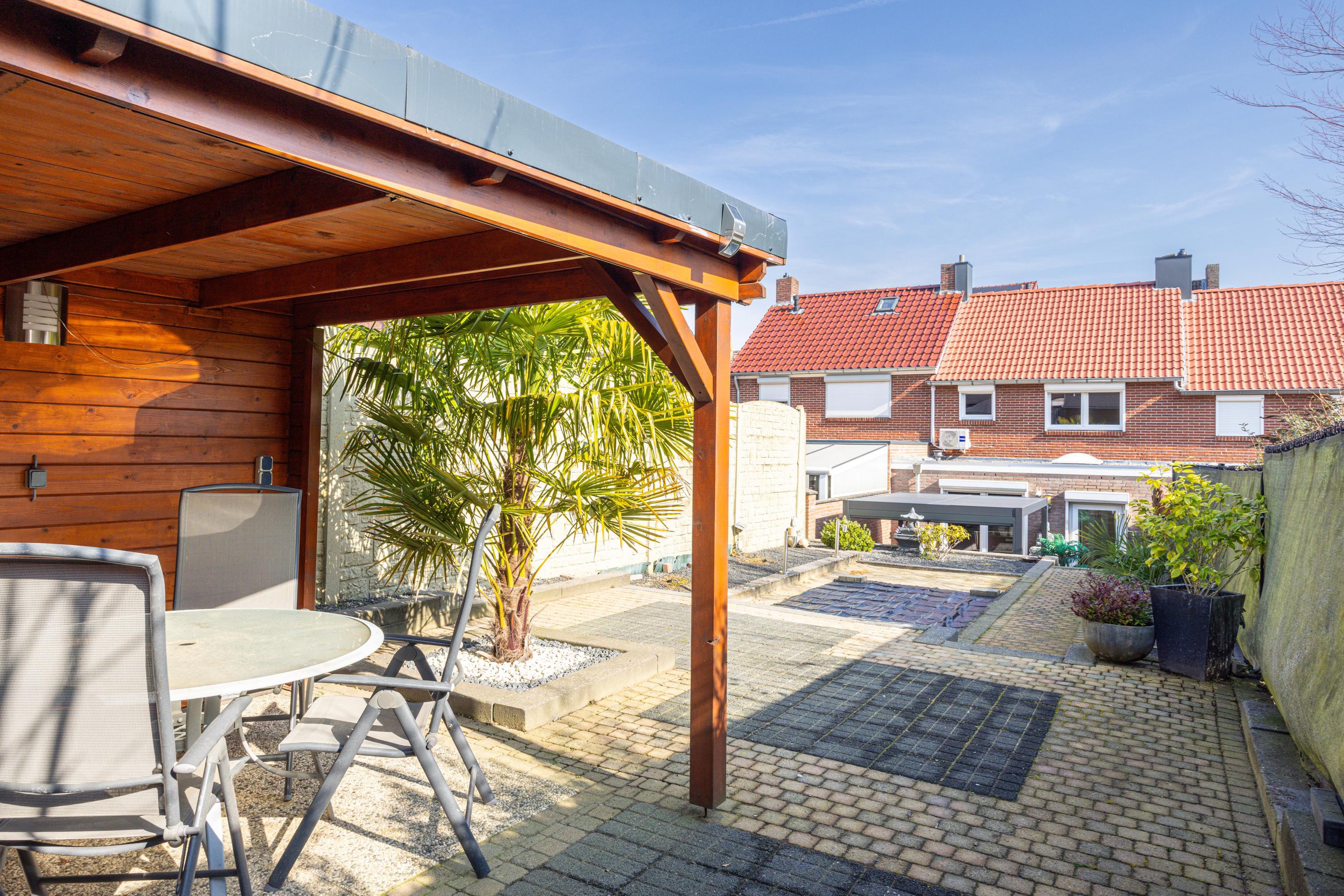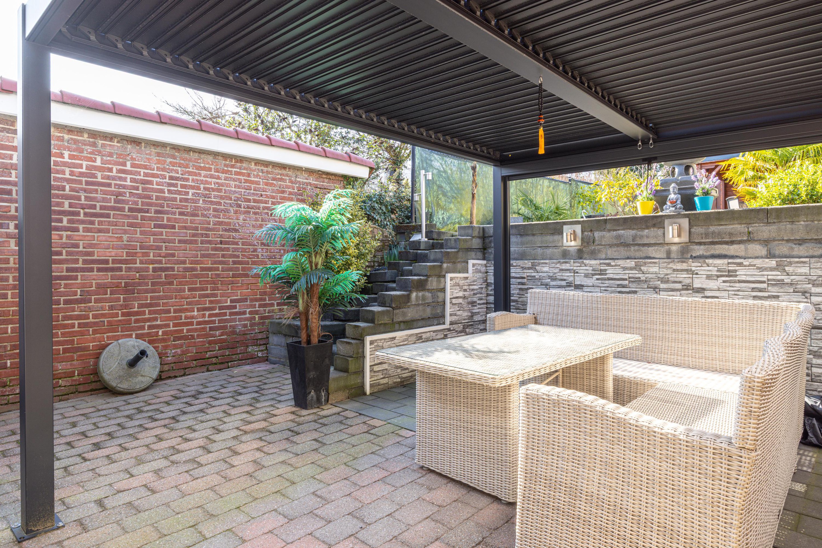 Tuin De achtertuin is verzorgd aangelegd en biedt verschillende plekken om buiten te zitten. Direct achter de woning bevindt zich een terras dat aansluit op de keuken en is voorzien van een lamellen overkapping. Via enkele trappen bereik je het hoger gelegen gedeelte van de tuin. Hier ligt een tweede terras met een overkapping, waardoor er een fijne plek ontstaat om beschut buiten te zitten.