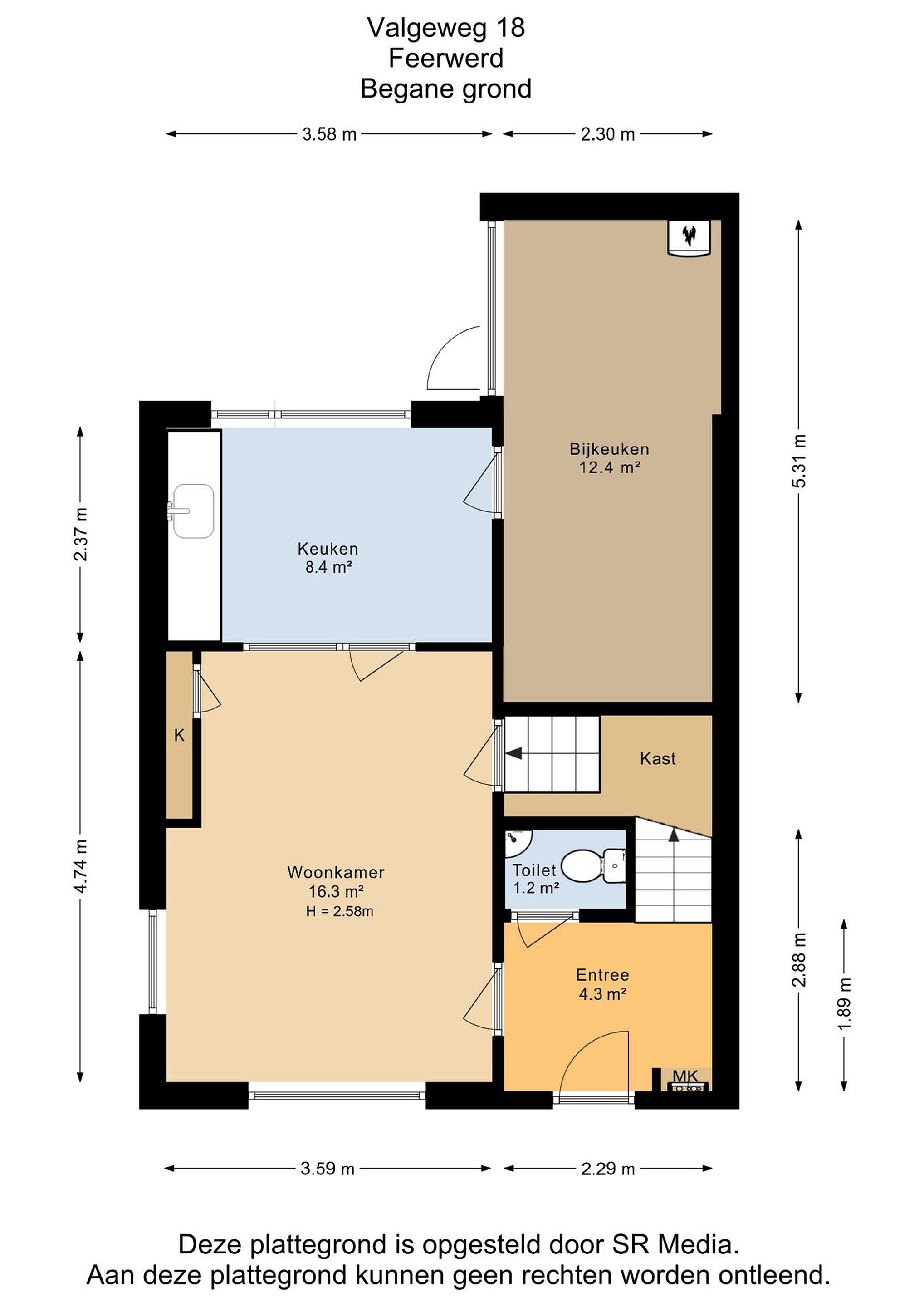 Op de begane grond vind je een entree met meterkast, trapopgang, toilet en doorgang naar de woonkamer. De woonkamer beschikt over een trapkast voor extra opslag. Door de glazen wand/deur in de woonkamer krijg je licht vanuit de keuken, wat de ruimte meer open en lichter maakt. De gesloten doorgang naar de keuken heeft een praktische indeling. Vanuit de bijkeuken kom je in de bijkeuken, waar je toegang hebt tot de tuin.