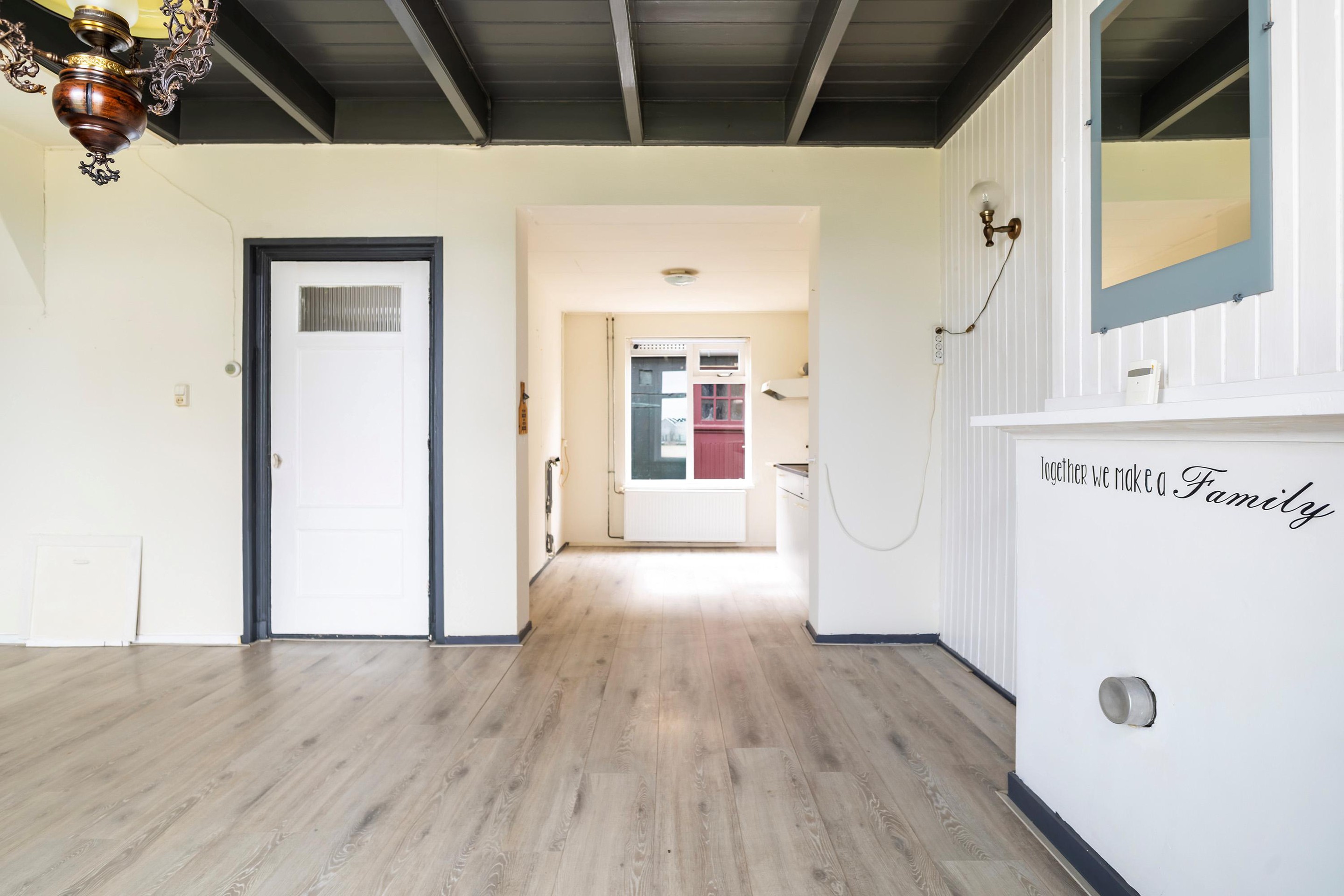 Aansluitend bevindt zich de keuken in een eenvoudige rechte opstelling, voorzien van spoelbak en kastruimte. Vanuit de keuken is er toegang tot de hal en de achterzijde van de woning.