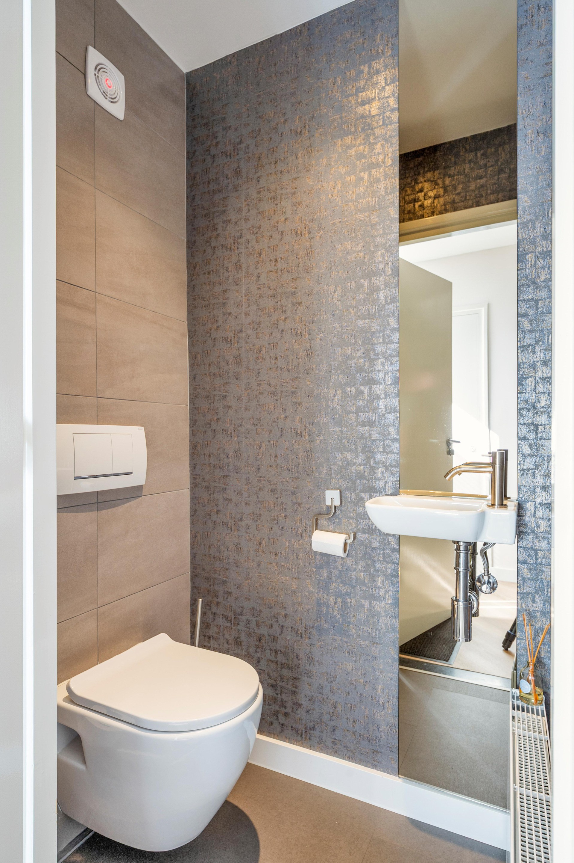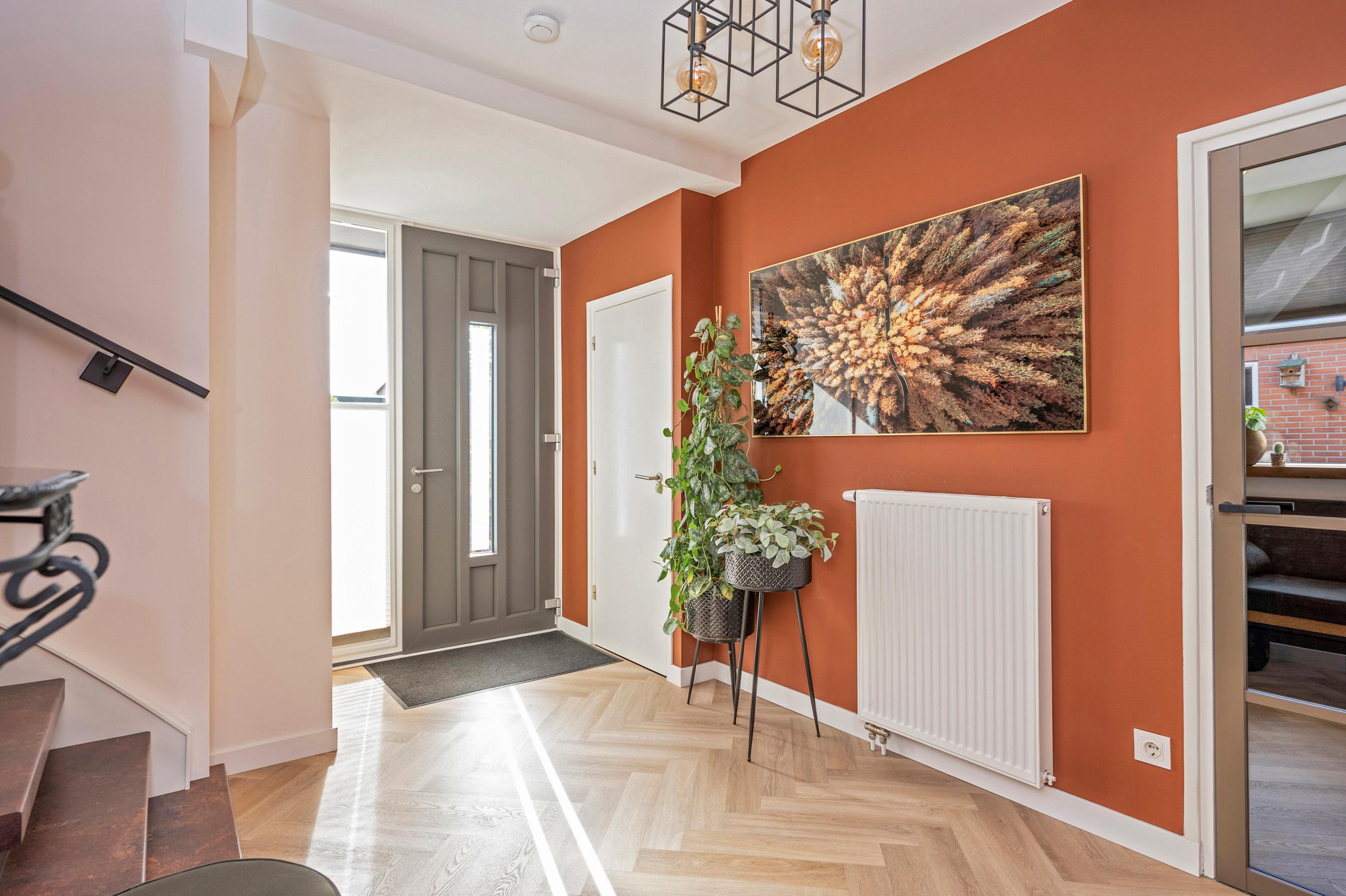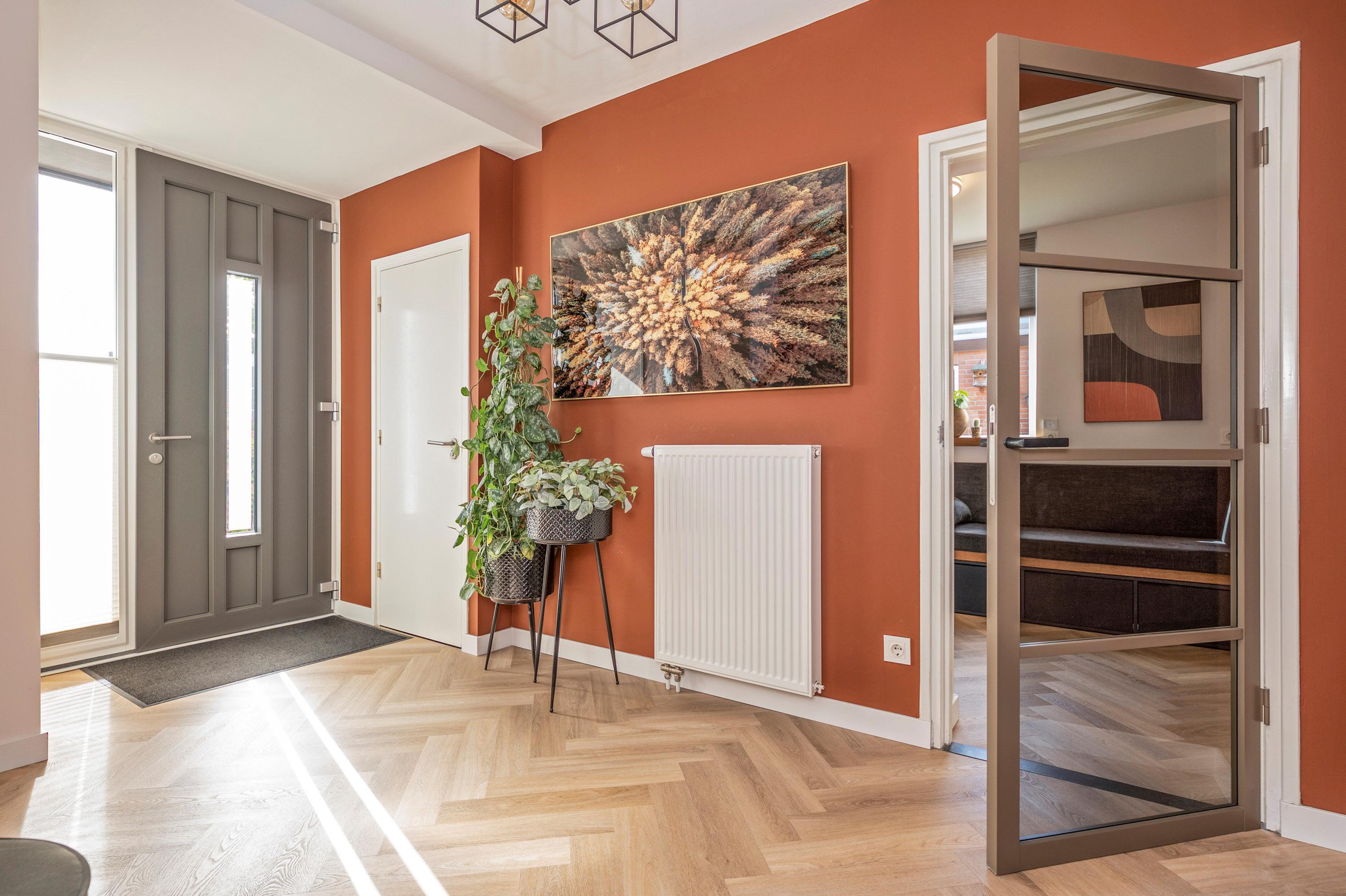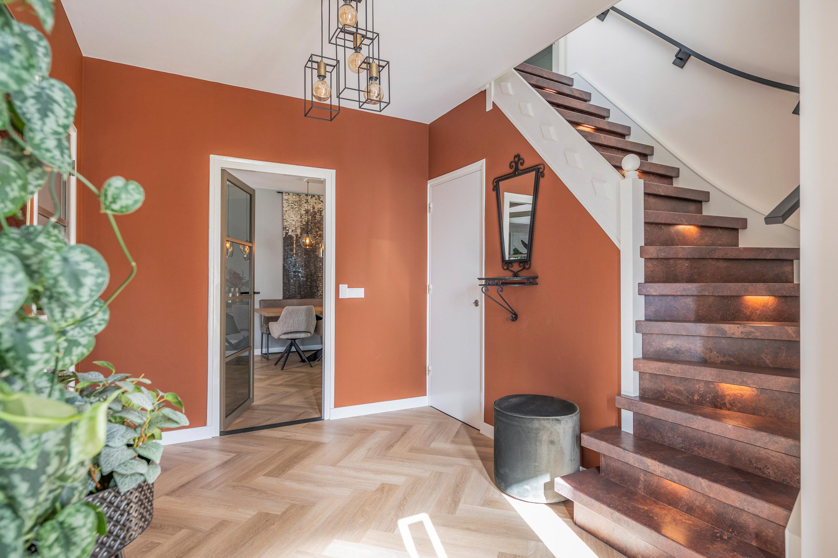 Ruime, sfeervolle entree/hal met meterkast, toilet voorzien van een hangcloset met fonteintje, garderobe en bergruimte onder de trap en de trapopgang naar de 1e verdieping.