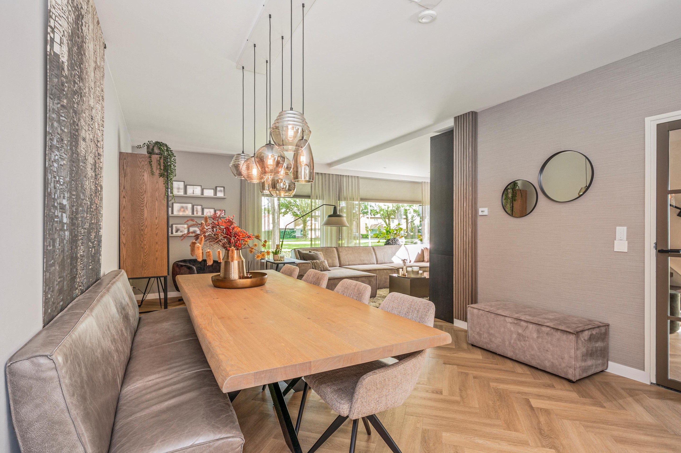 Smaakvolle woon/eetkamer welke voorzien is van grote ramen welke zorgen voor optimale lichtinval en prachtig uitzicht over een brede groenstrook. De aanwezigheid van prachtige deuren biedt de mogelijkheid om het woonkamer gedeelte te scheiden van het keuken / kantoor gedeelte en in alle rust te kunnen werken.