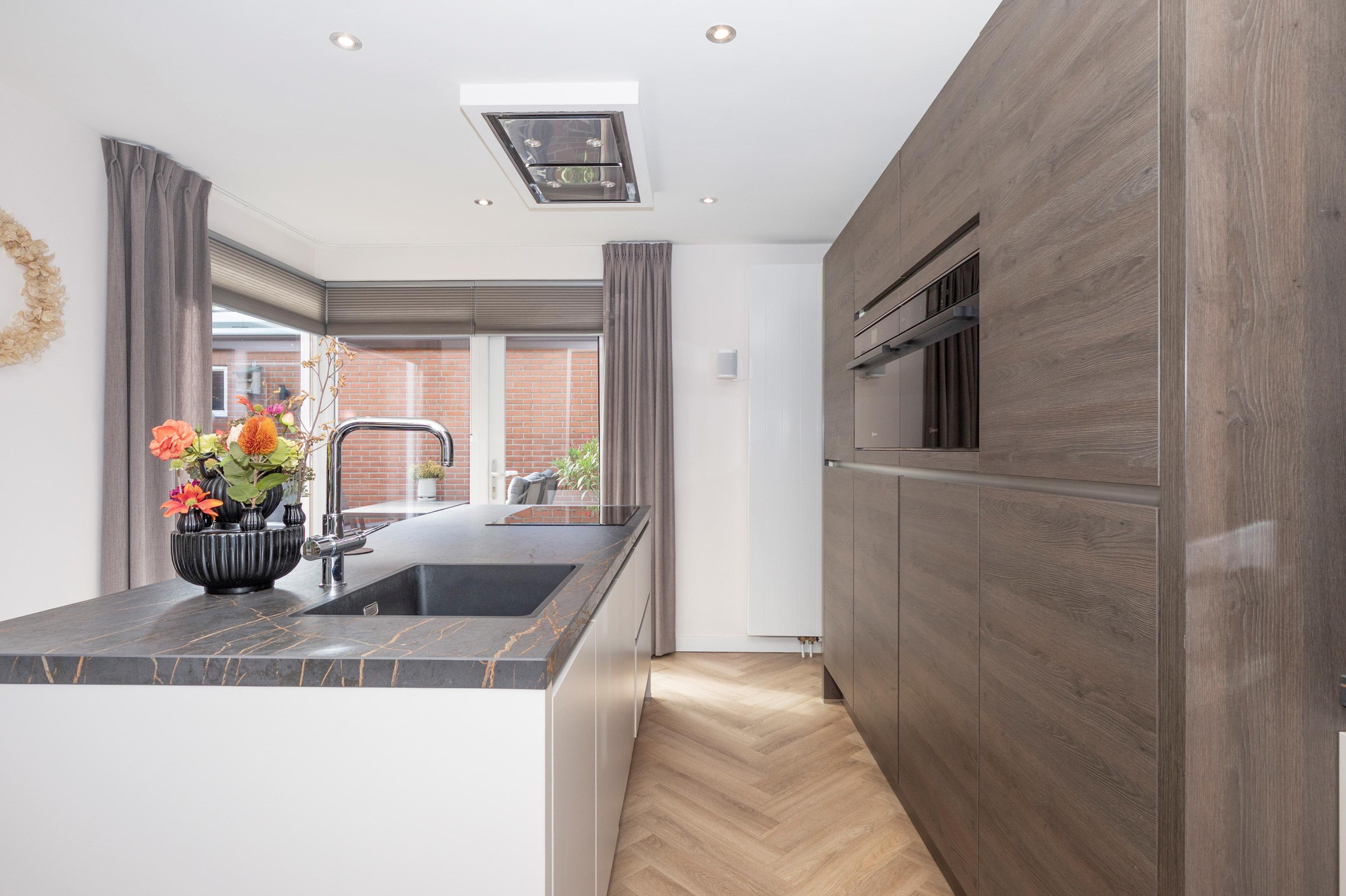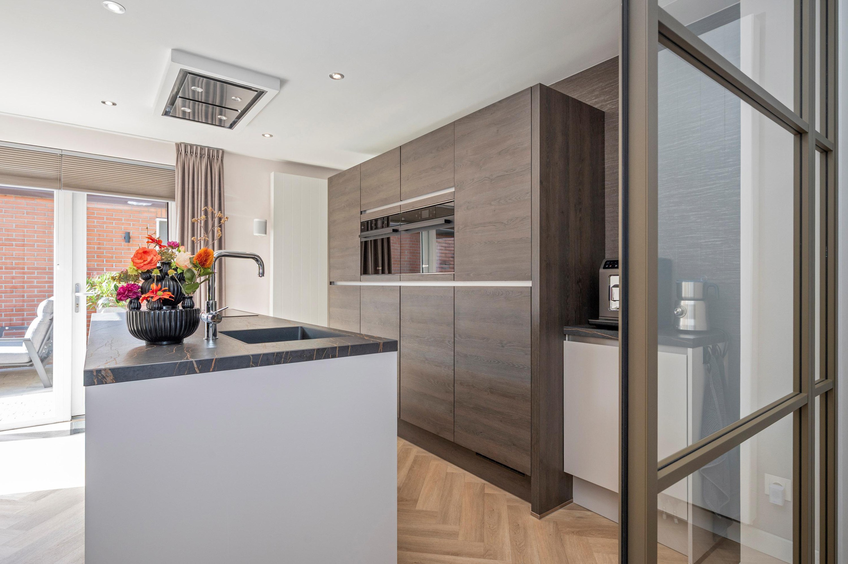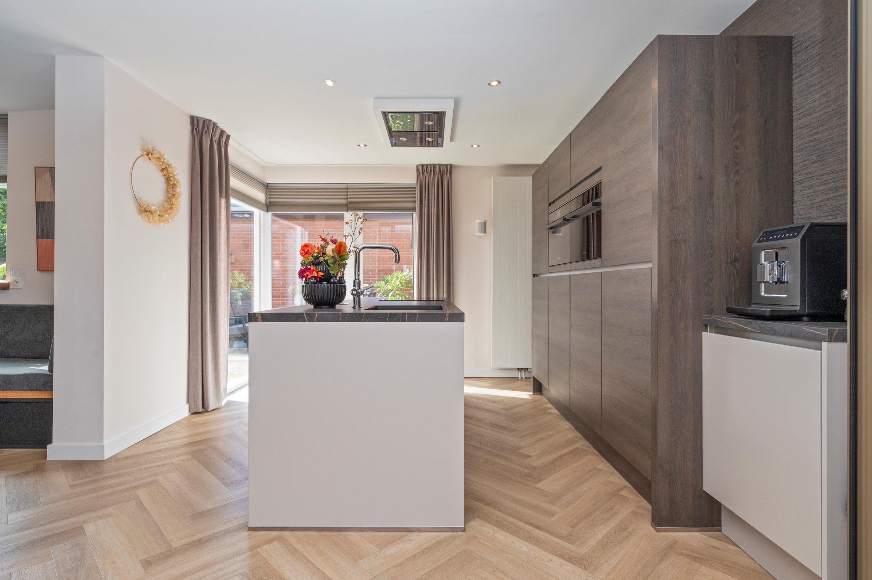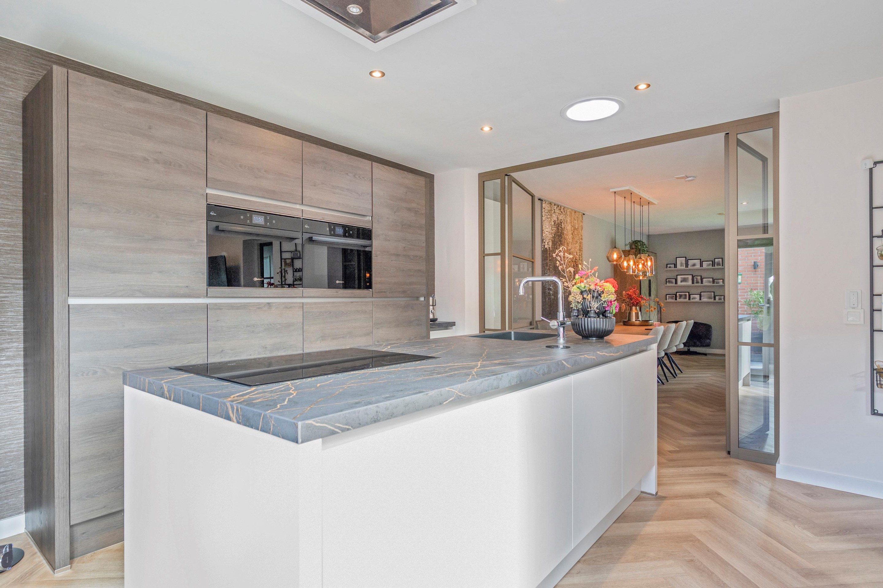 In het verlengde van de woon/eetkamer bevindt zich de prachtige keuken inclusief kookeiland. De keuken is voorzien van de volgende inbouwapparatuur: koelkast, diepvries, vaatwasser, inductie kookplaat, 2 combi-ovens, kokend waterkraan en een afzuigkap.
