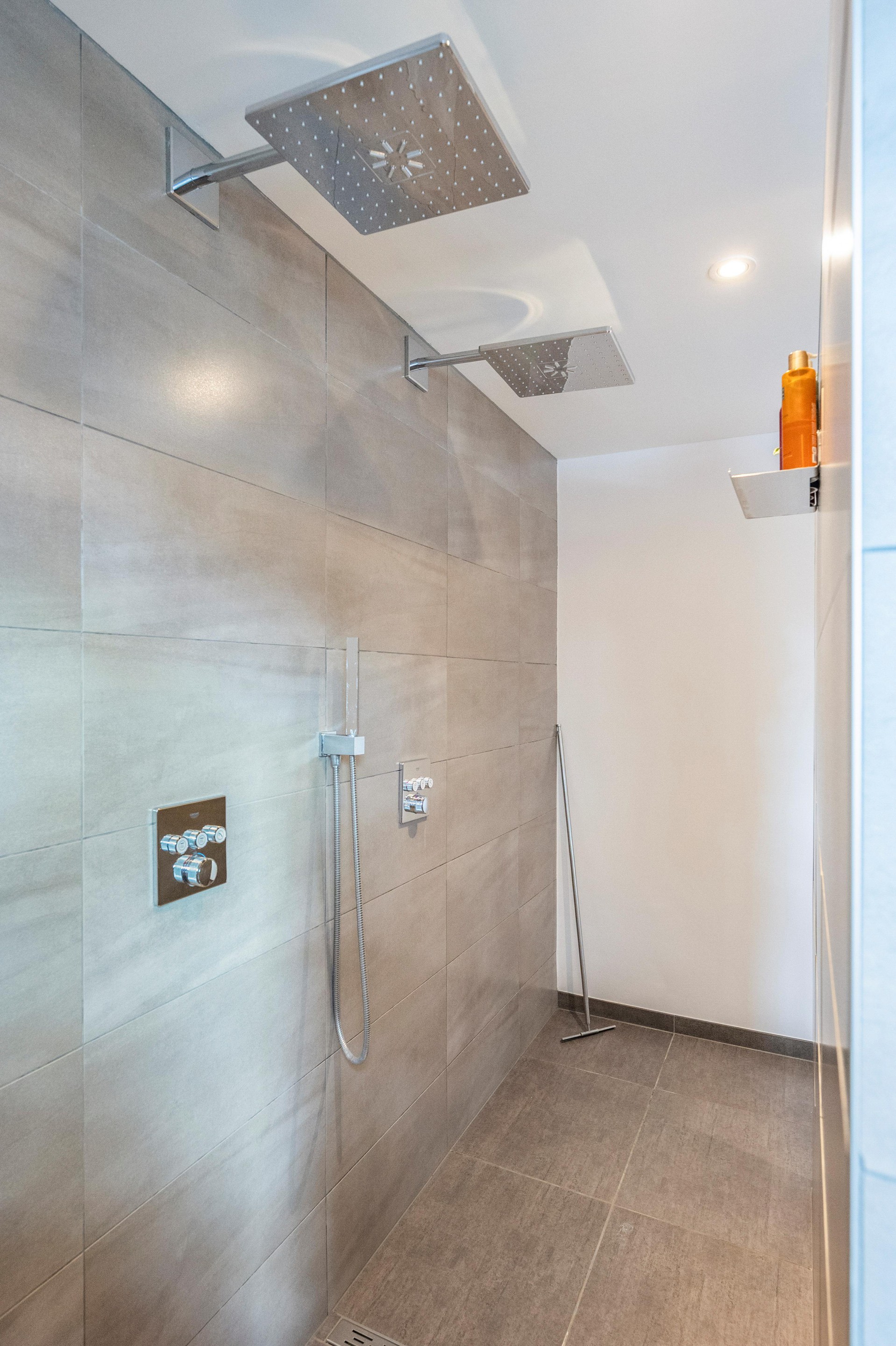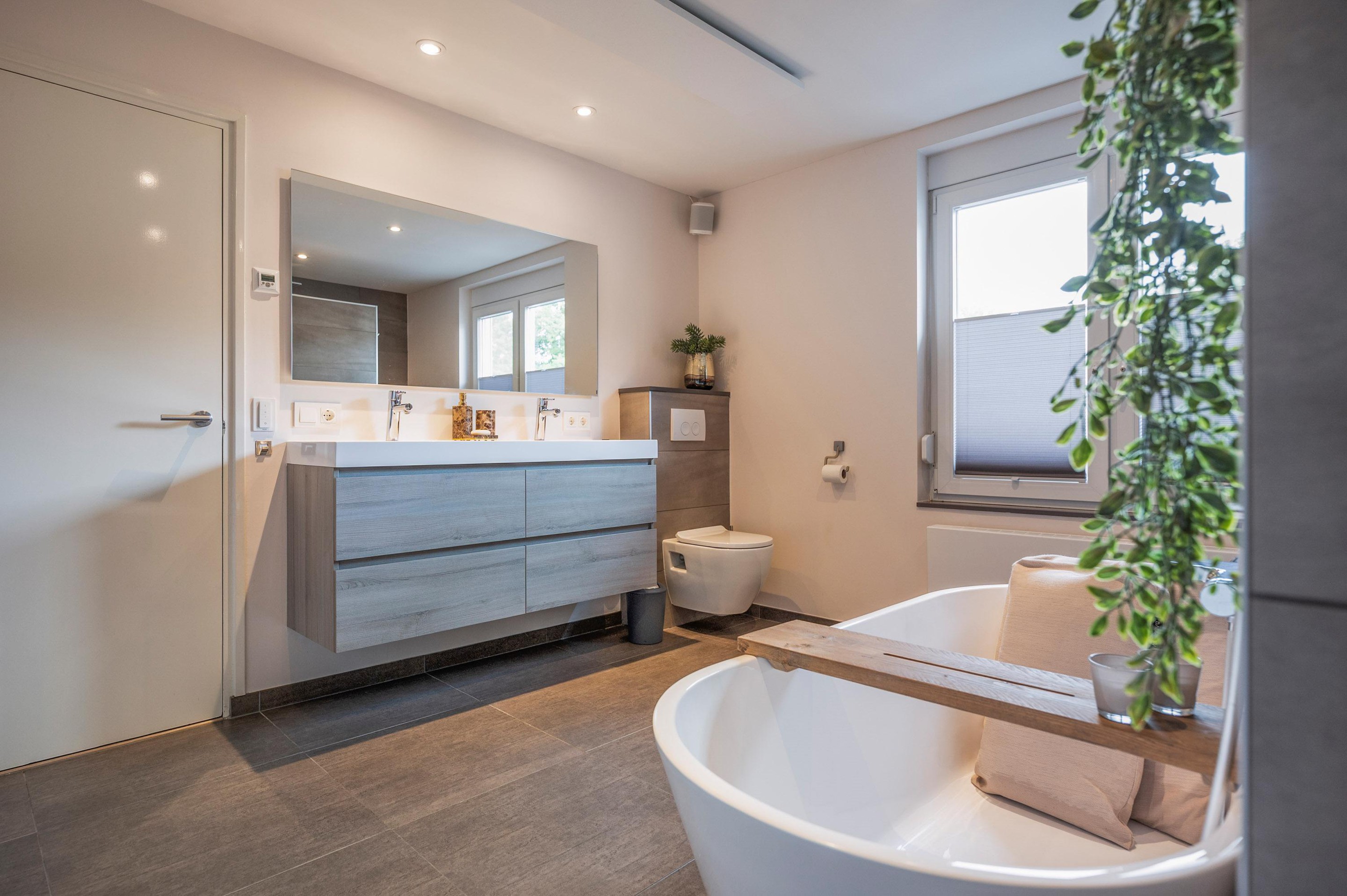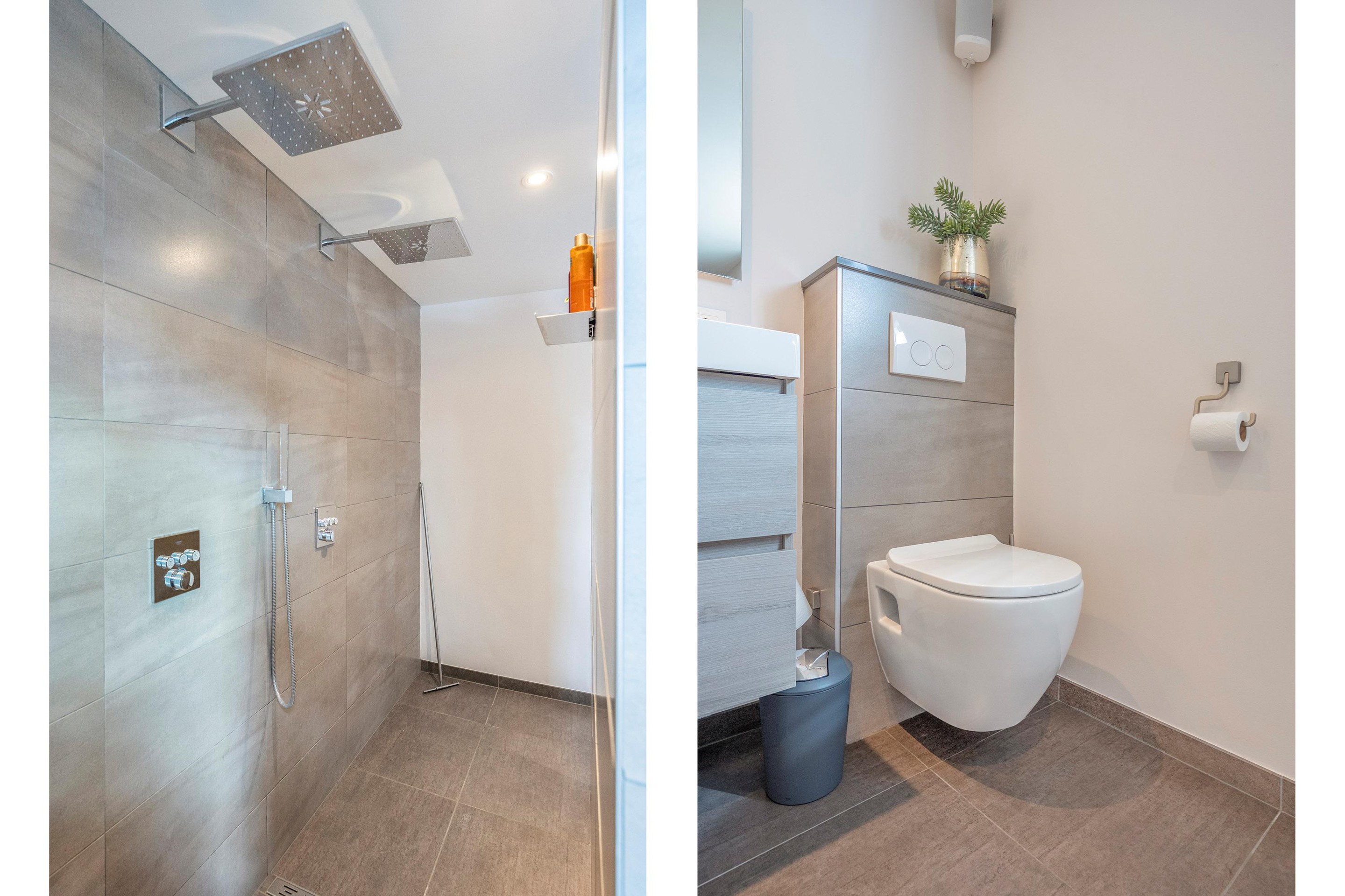 De badkamer is voorzien van een zeer riante dubbele inloopdouche, groot vrijstaand ligbad, dubbele wastafel met opbergmeubel, designradiator en een toilet.