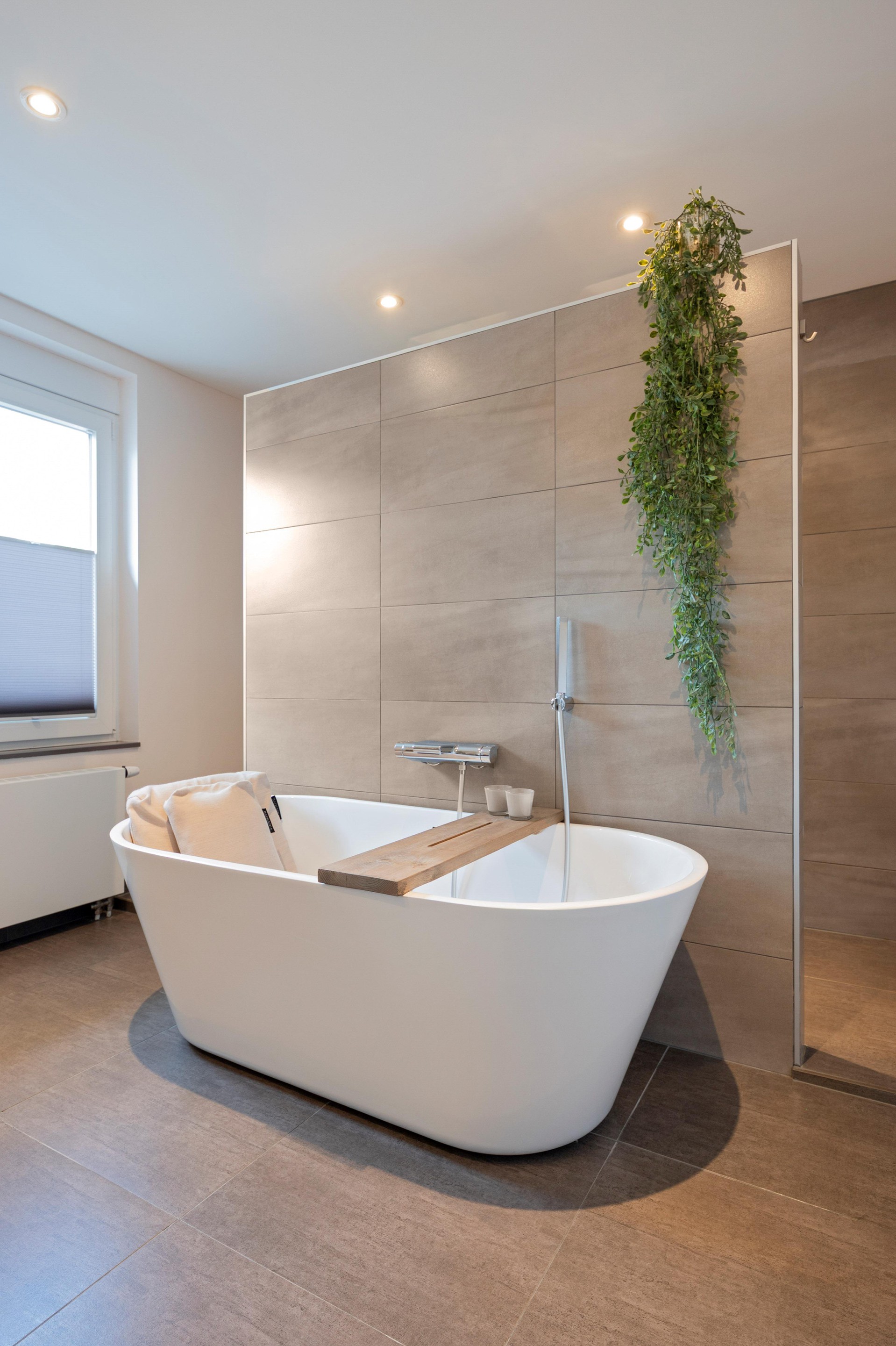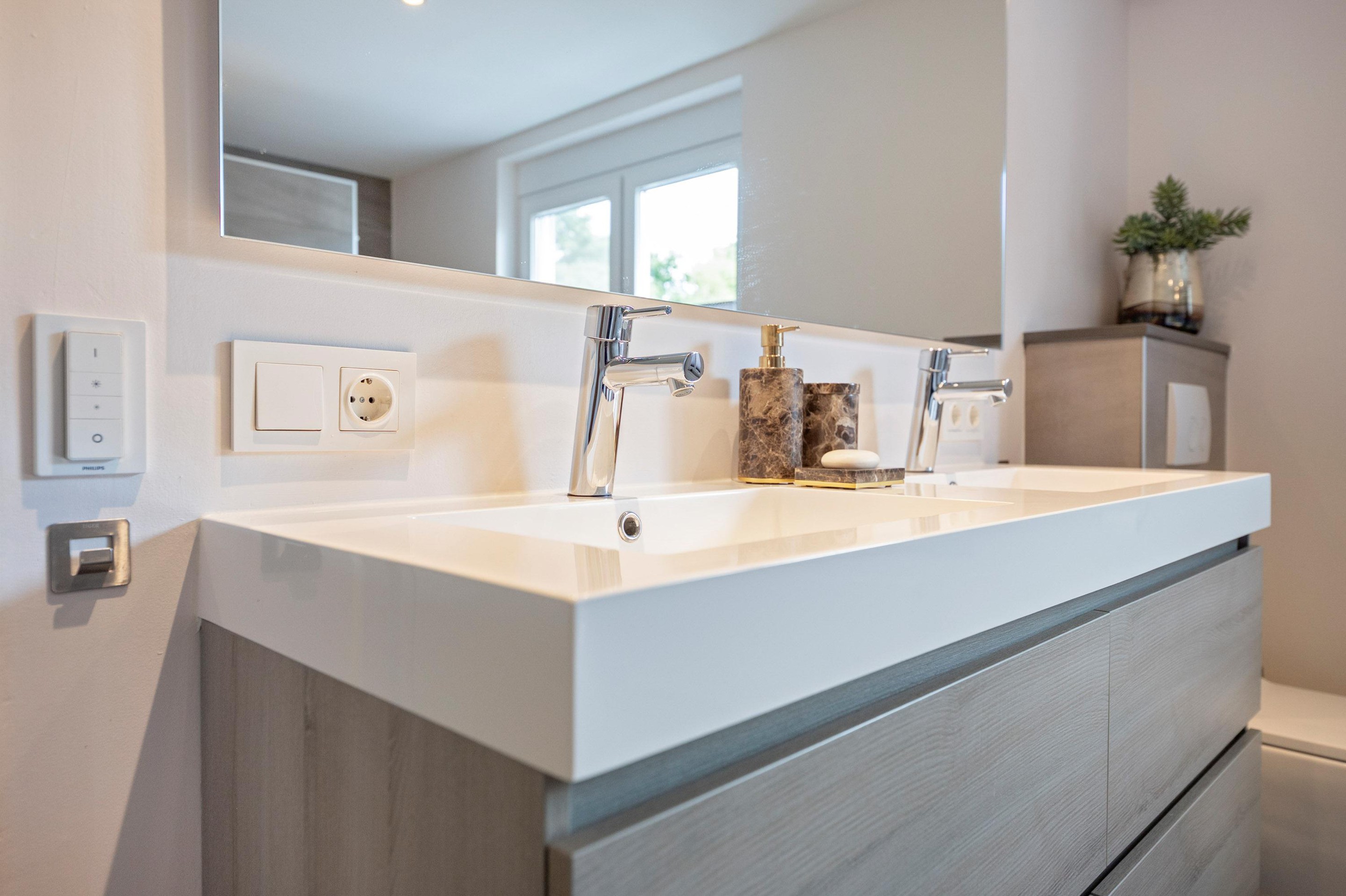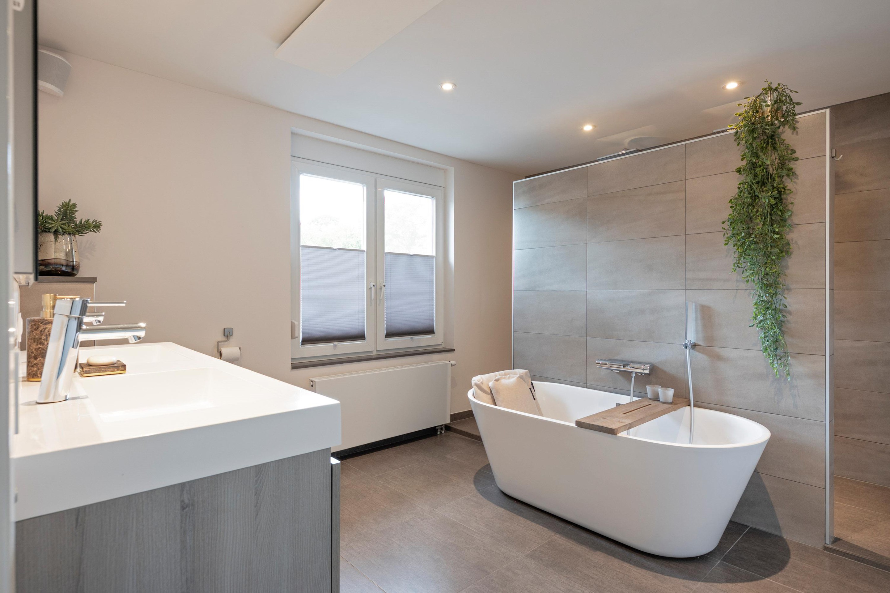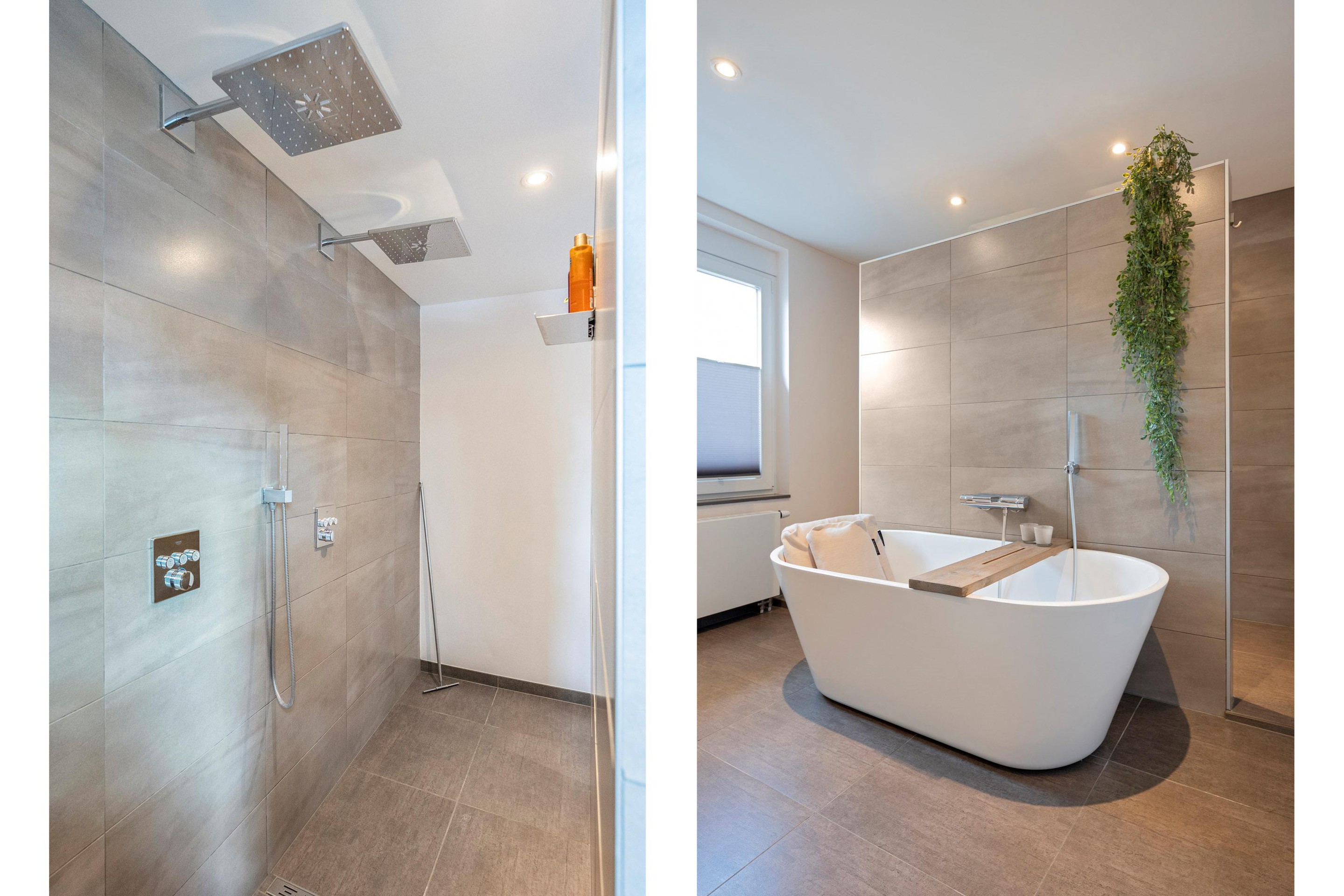 De badkamer is voorzien van een zeer riante dubbele inloopdouche, groot vrijstaand ligbad, dubbele wastafel met opbergmeubel, designradiator en een toilet.
