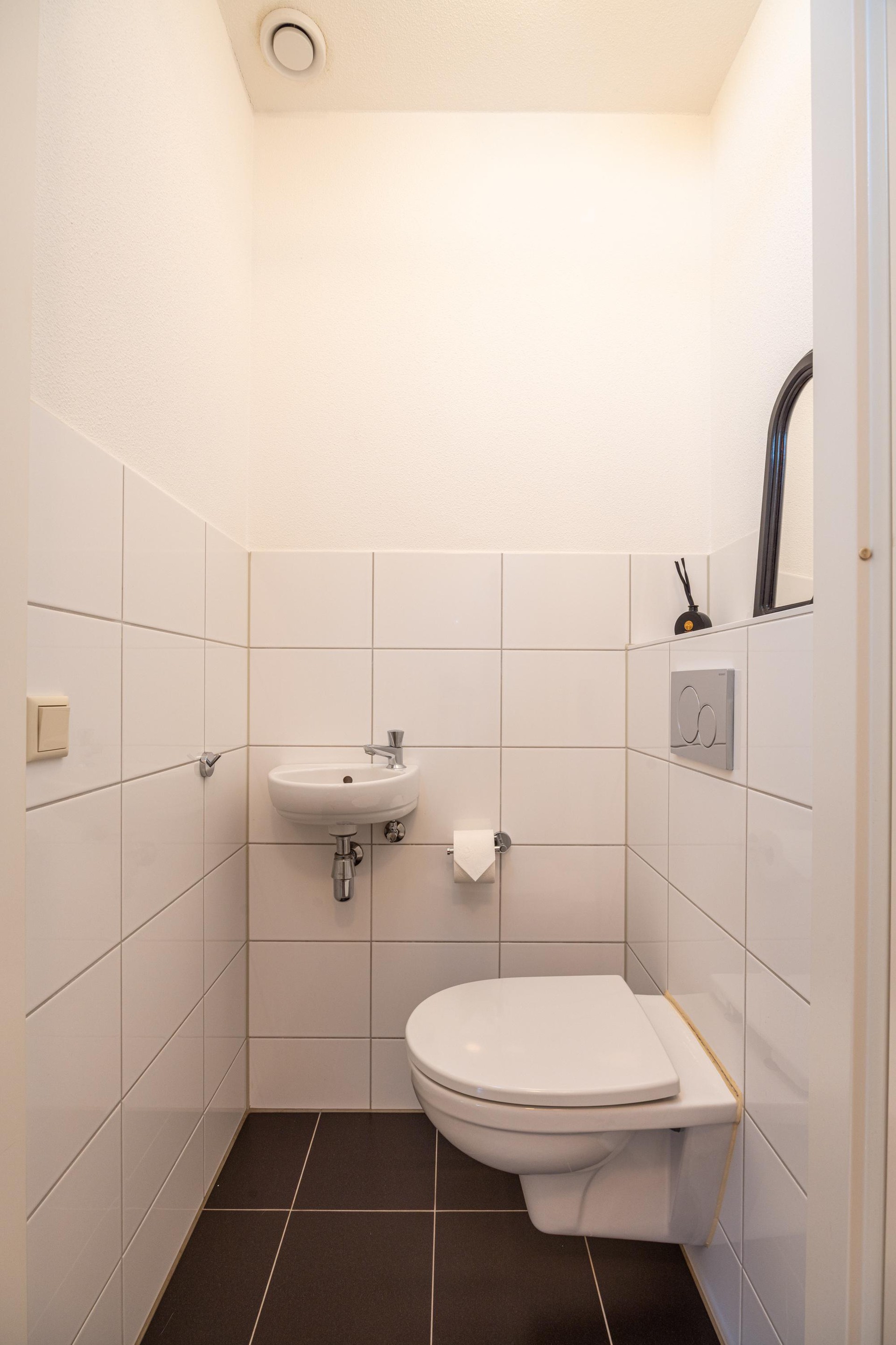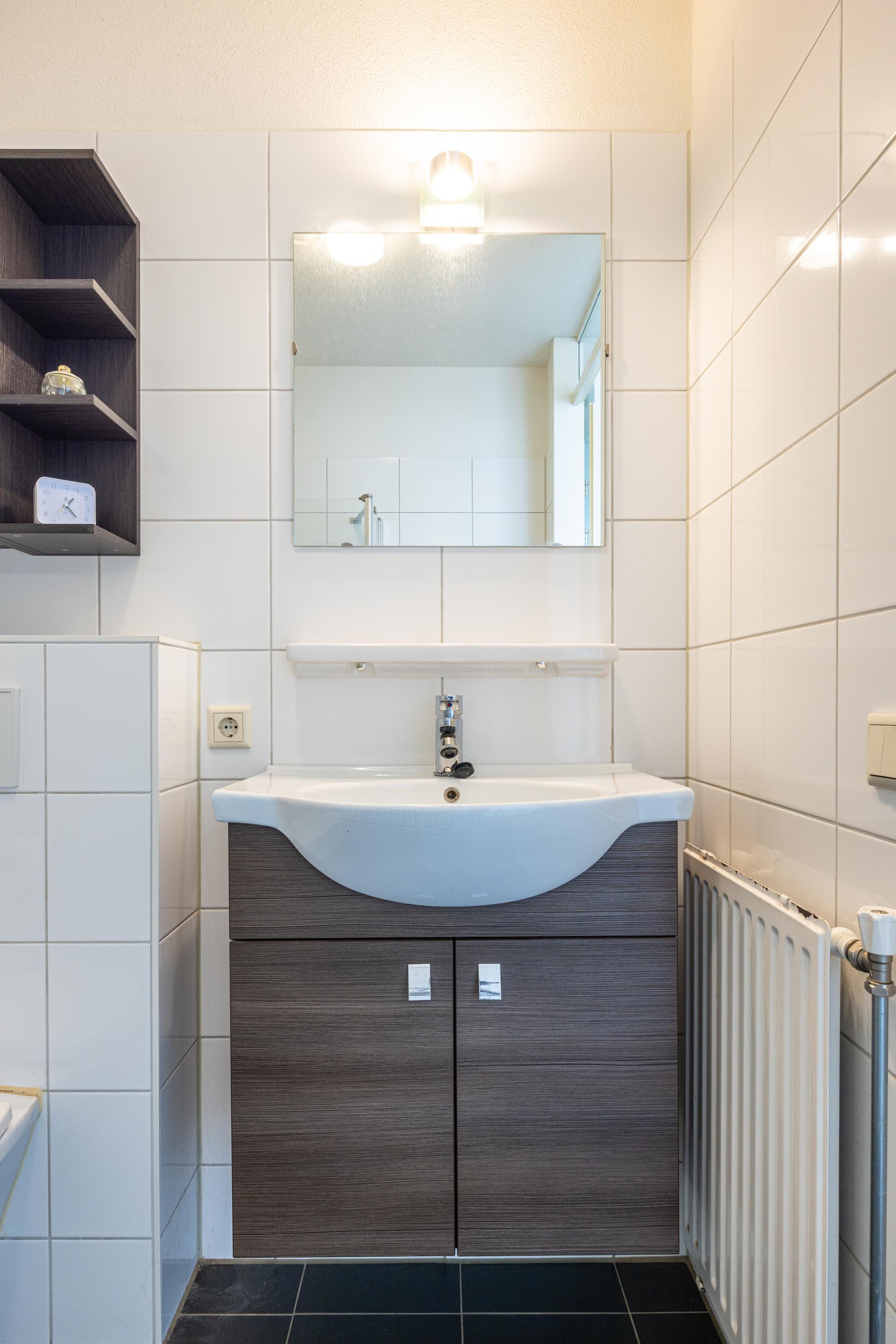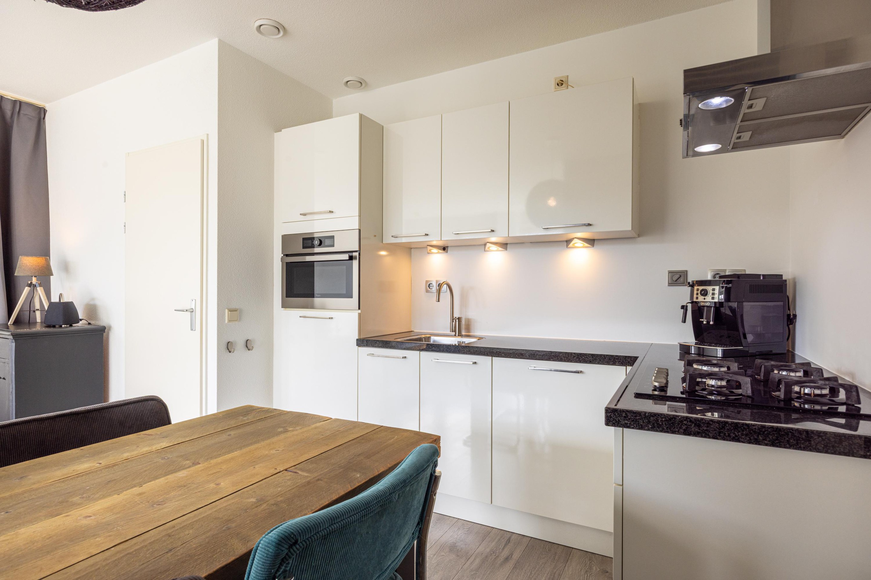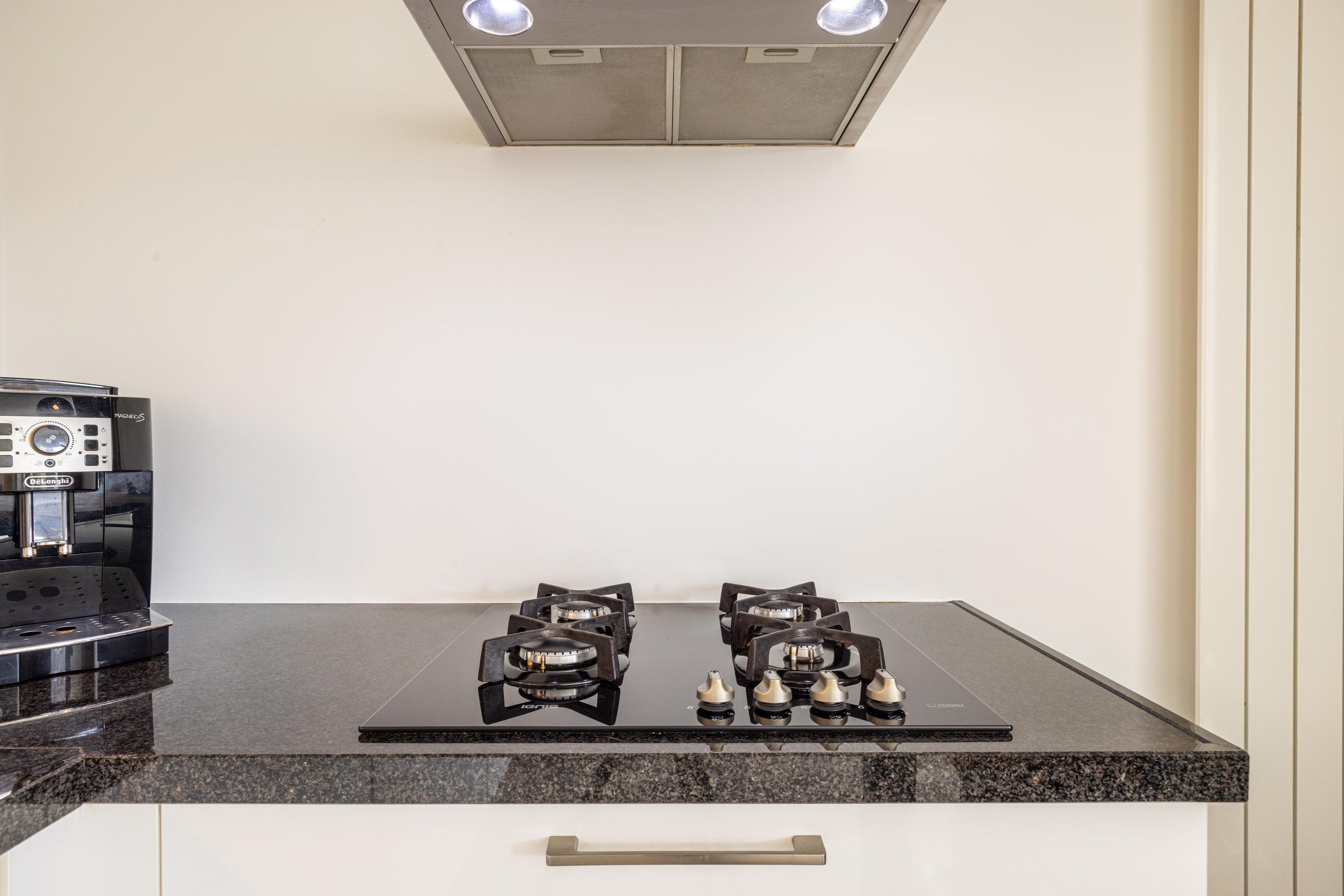 De open keuken is in 2016 volledig vernieuwd. De moderne keukenopstelling combineert witte hoogglans fronten met donkere werkbladen, wat zorgt voor een tijdloze uitstraling. Je beschikt hier over alle benodigde inbouwapparatuur: een 4-pits gaskookplaat, afzuigkap, combi-oven, koelkast en vaatwasser. De begane grond voelt ruim en comfortabel aan, mede door de goede lichtinval en de verzorgde afwerking.