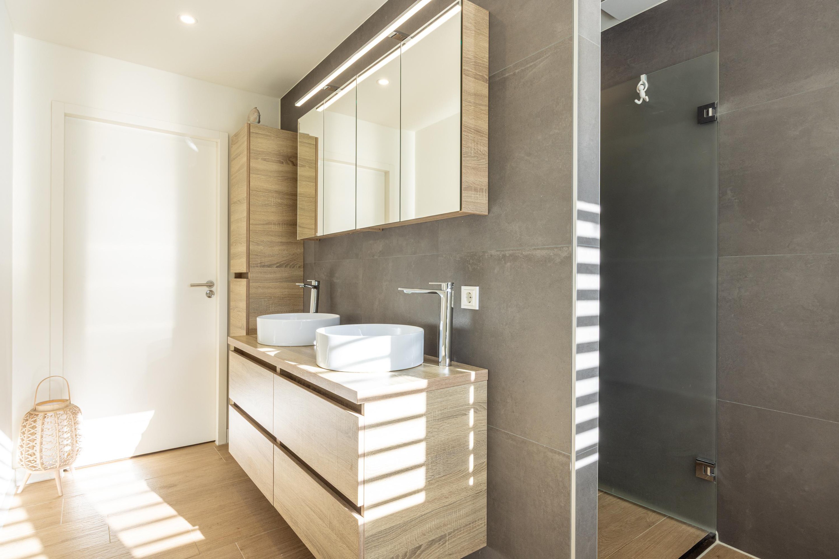 De keuken is in 2021 volledig vernieuwd en uitgevoerd in een moderne stijl met een donkergrijze tegelvloer en voldoende kastruimte. De keuken beschikt over alle gewenste inbouwapparatuur: een 5-pits gasfornuis, afzuigkap, combi-heteluchtoven, koelkast en vaatwasser. Er is genoeg ruimte voor een eettafel, perfect voor gezellige familiemomenten of een ontbijt met uitzicht op de patio. Via een tweede tussenportaal, waar zich ook de cv-installatiekast bevindt, kom je in de badkamer en heb je eveneens toegang tot de patio.