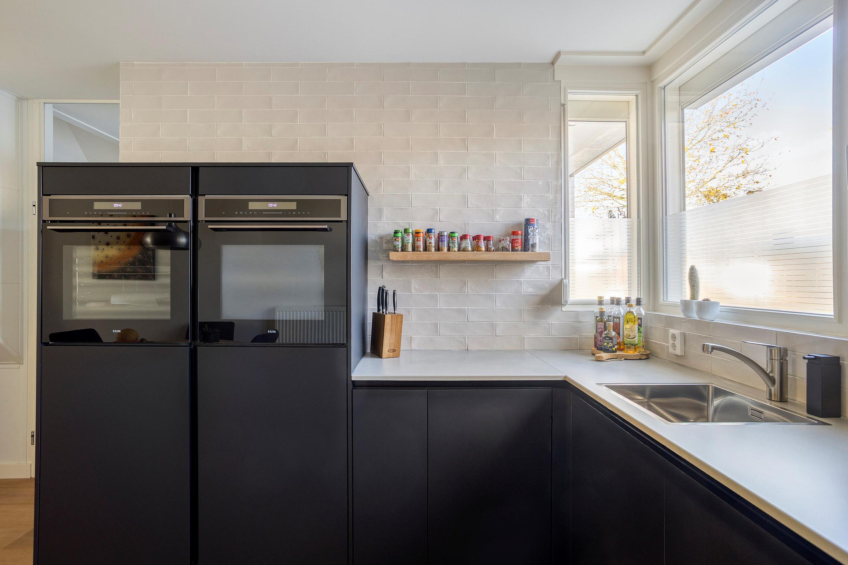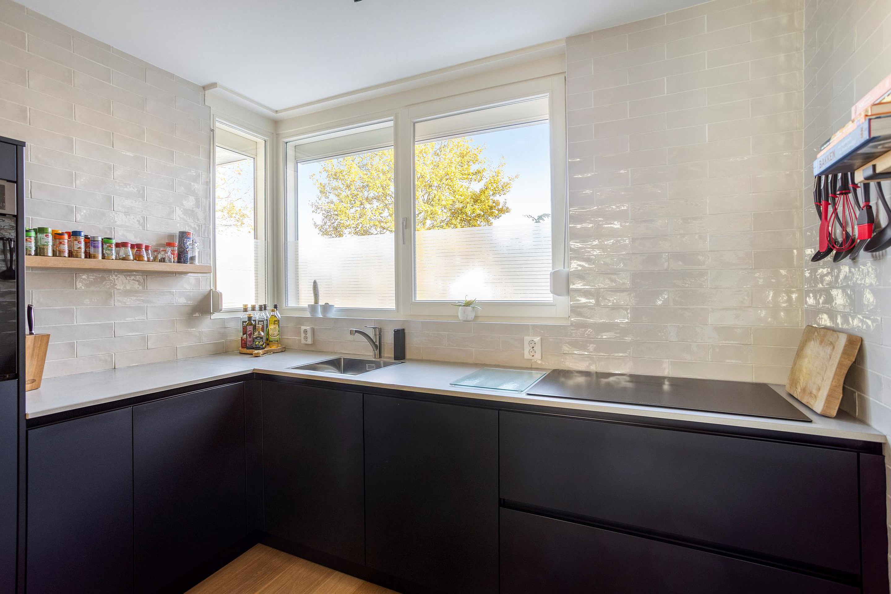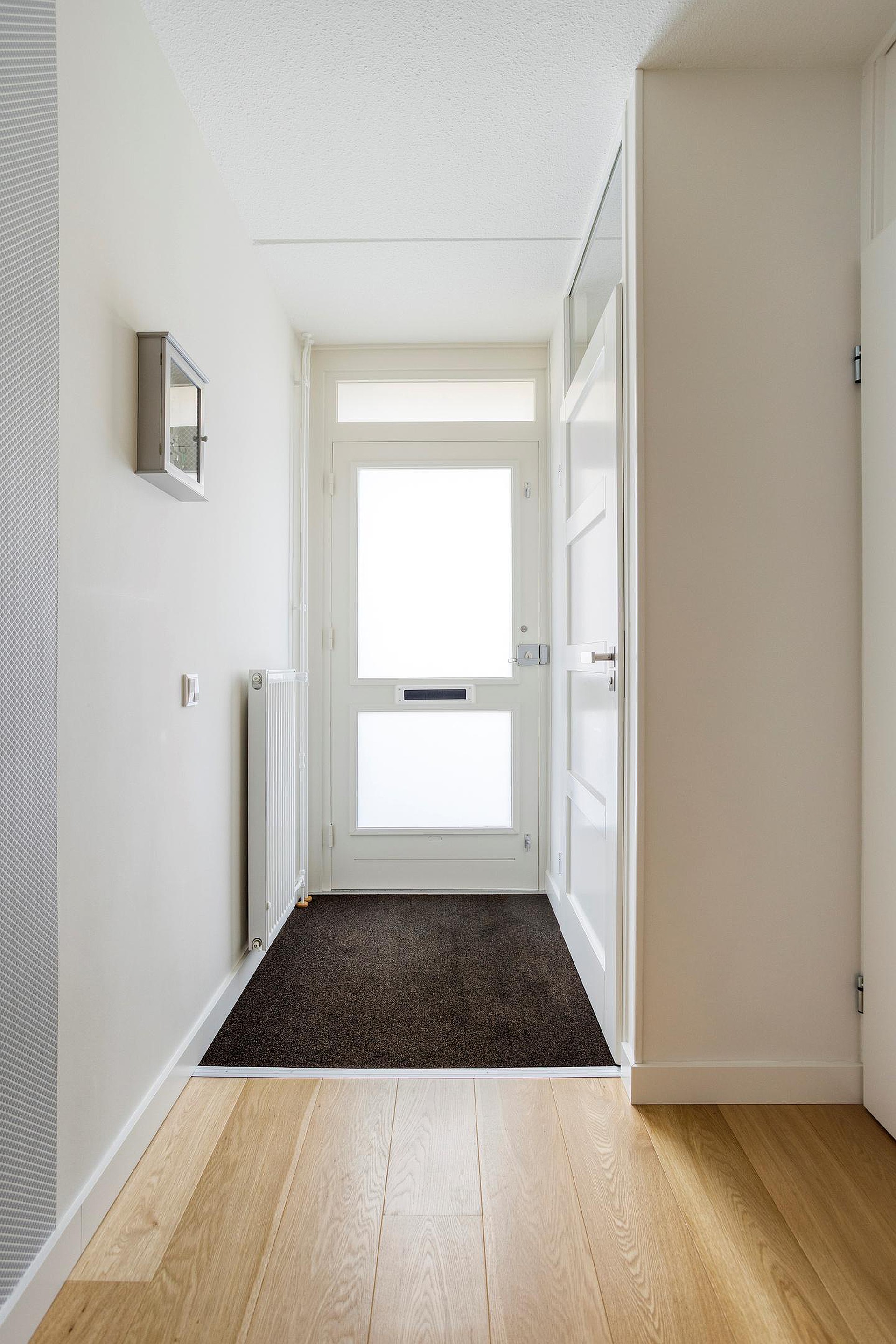 Royale hal/entree (ca.6m2), hier bevinden zich de meterkast en de toiletruimte, deze is geheel betegeld, keramische vloertegels met Portugees motief, voorzien van een zwevend toilet. Vanuit de hal betreedt men de open keuken voorzien van een zwart keukenblok in hoekopstelling met de volgende inbouwapparatuur: spoelbak, 4-pits inductiekookplaat met ingebouwde afzuiging (AEG), oven, combi-oven, vaatwasser en koelkast. Aanrechtblad in betonlook. Aansluitend de living die net als de rest van de begane grond, toilet uitgezonderd voorzien is van een wit eiken houten vloer. Aangrenzend bevindt zich aan de achterzijde de sfeervolle serre, waar je het hele jaar door kunt genieten van het buitengevoel.