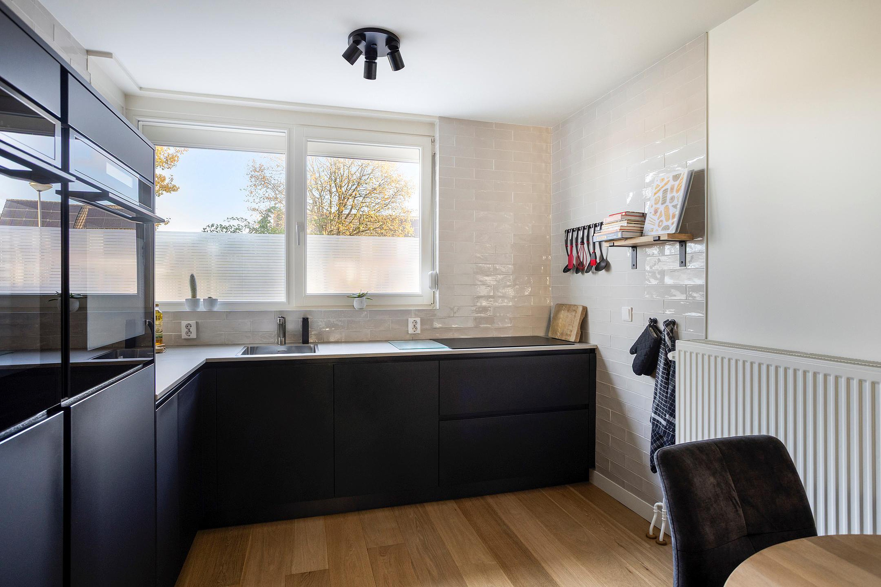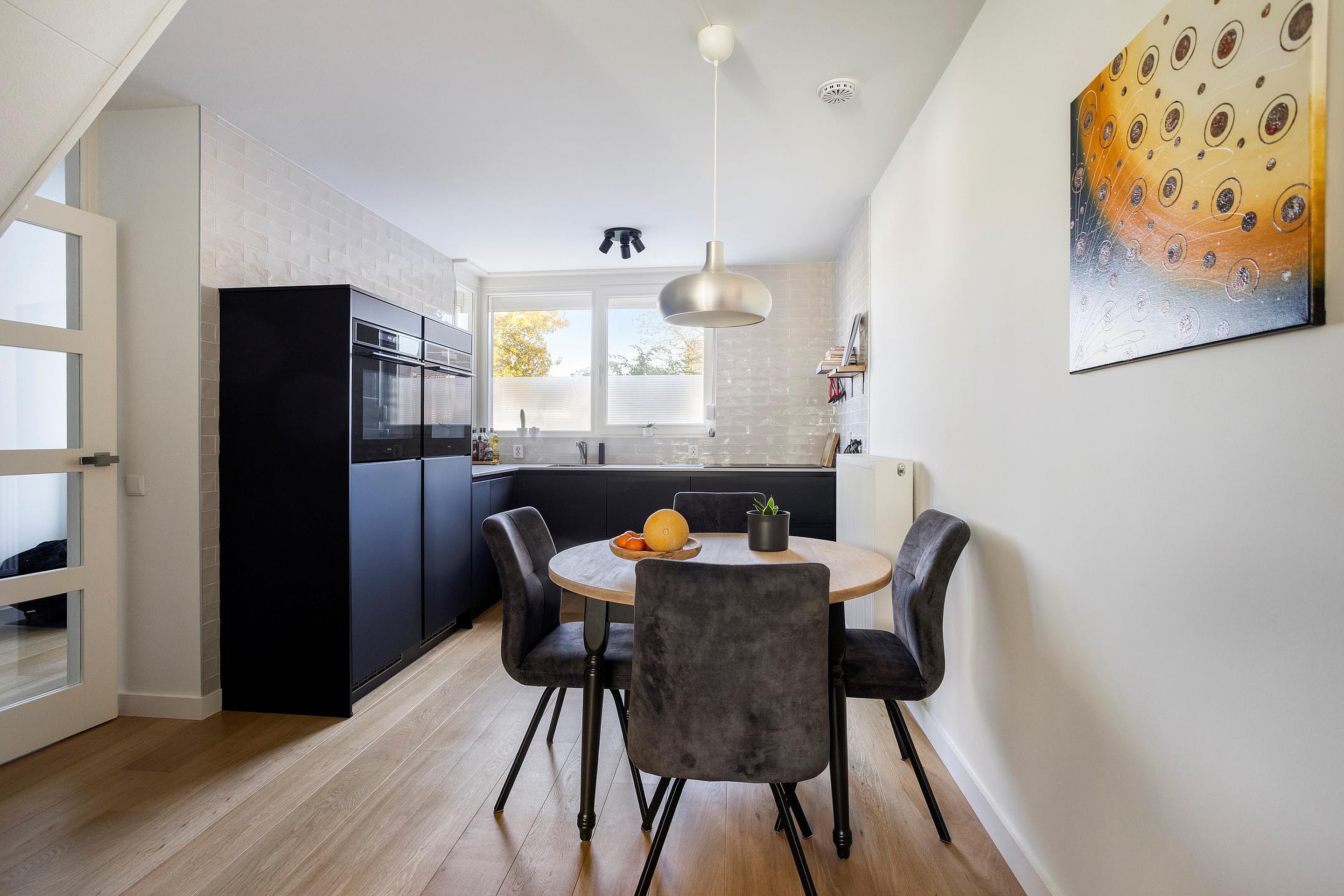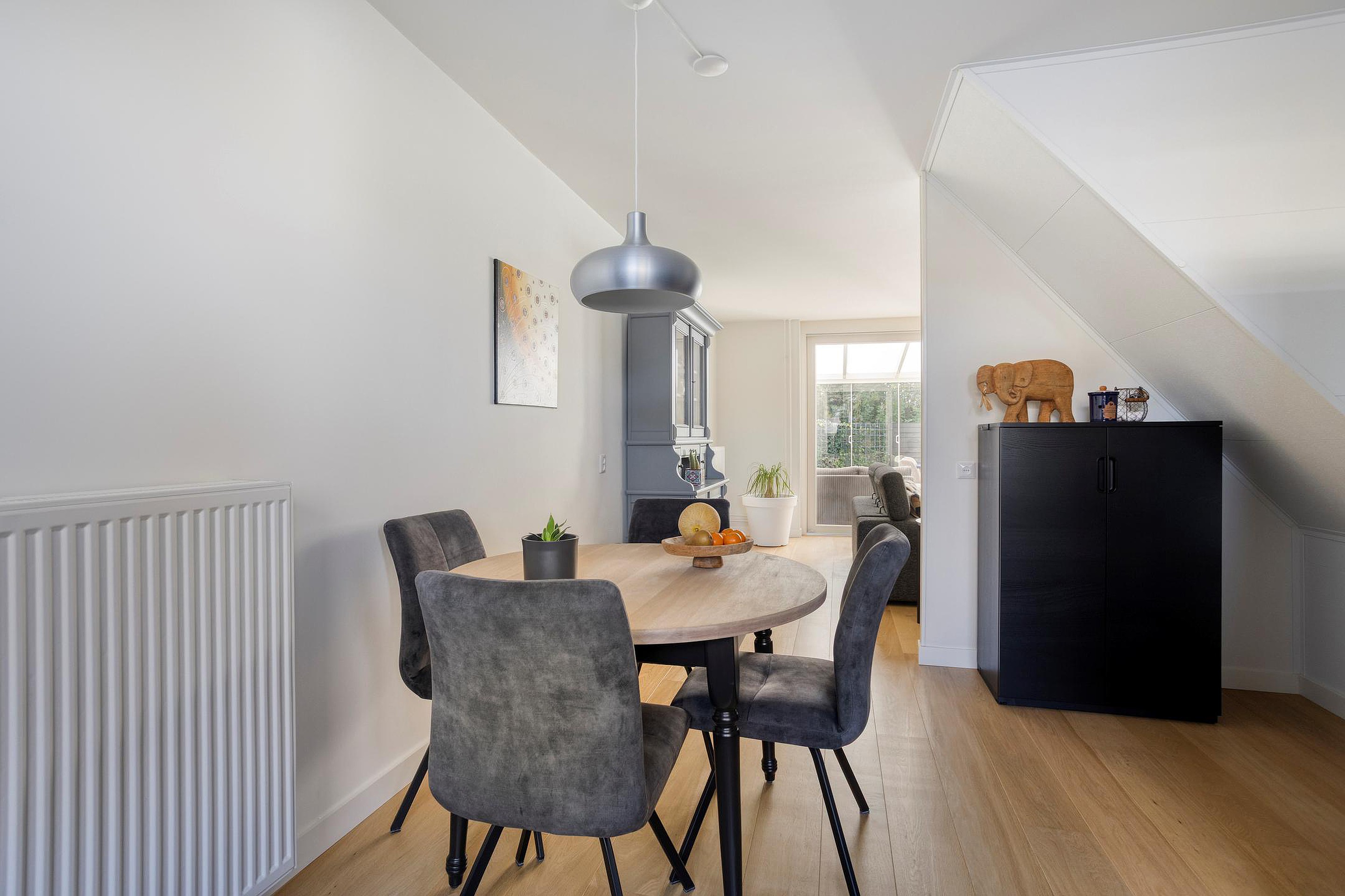 Royale hal/entree (ca.6m2), hier bevinden zich de meterkast en de toiletruimte, deze is geheel betegeld, keramische vloertegels met Portugees motief, voorzien van een zwevend toilet. Vanuit de hal betreedt men de open keuken voorzien van een zwart keukenblok in hoekopstelling met de volgende inbouwapparatuur: spoelbak, 4-pits inductiekookplaat met ingebouwde afzuiging (AEG), oven, combi-oven, vaatwasser en koelkast. Aanrechtblad in betonlook. Aansluitend de living die net als de rest van de begane grond, toilet uitgezonderd voorzien is van een wit eiken houten vloer. Aangrenzend bevindt zich aan de achterzijde de sfeervolle serre, waar je het hele jaar door kunt genieten van het buitengevoel.