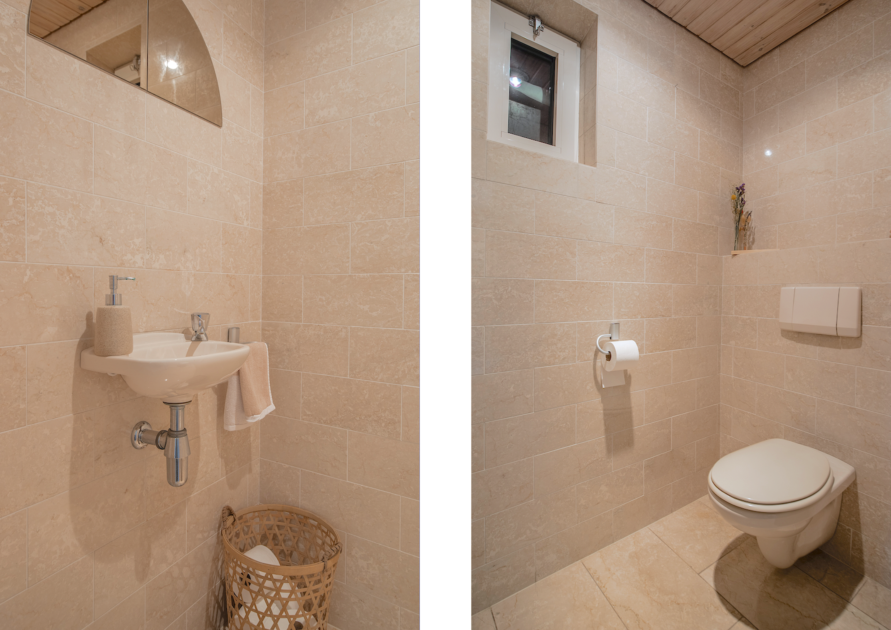 Bijgebouw: vanuit de bijkeuken is er toegang tot het multifunctionele bijgebouw, met een entree, hal, badkamer met zwevend toilet, douche voorzien van rainshower en wastafelmeubel, hal met trapopgang en toegang tot royale garage.