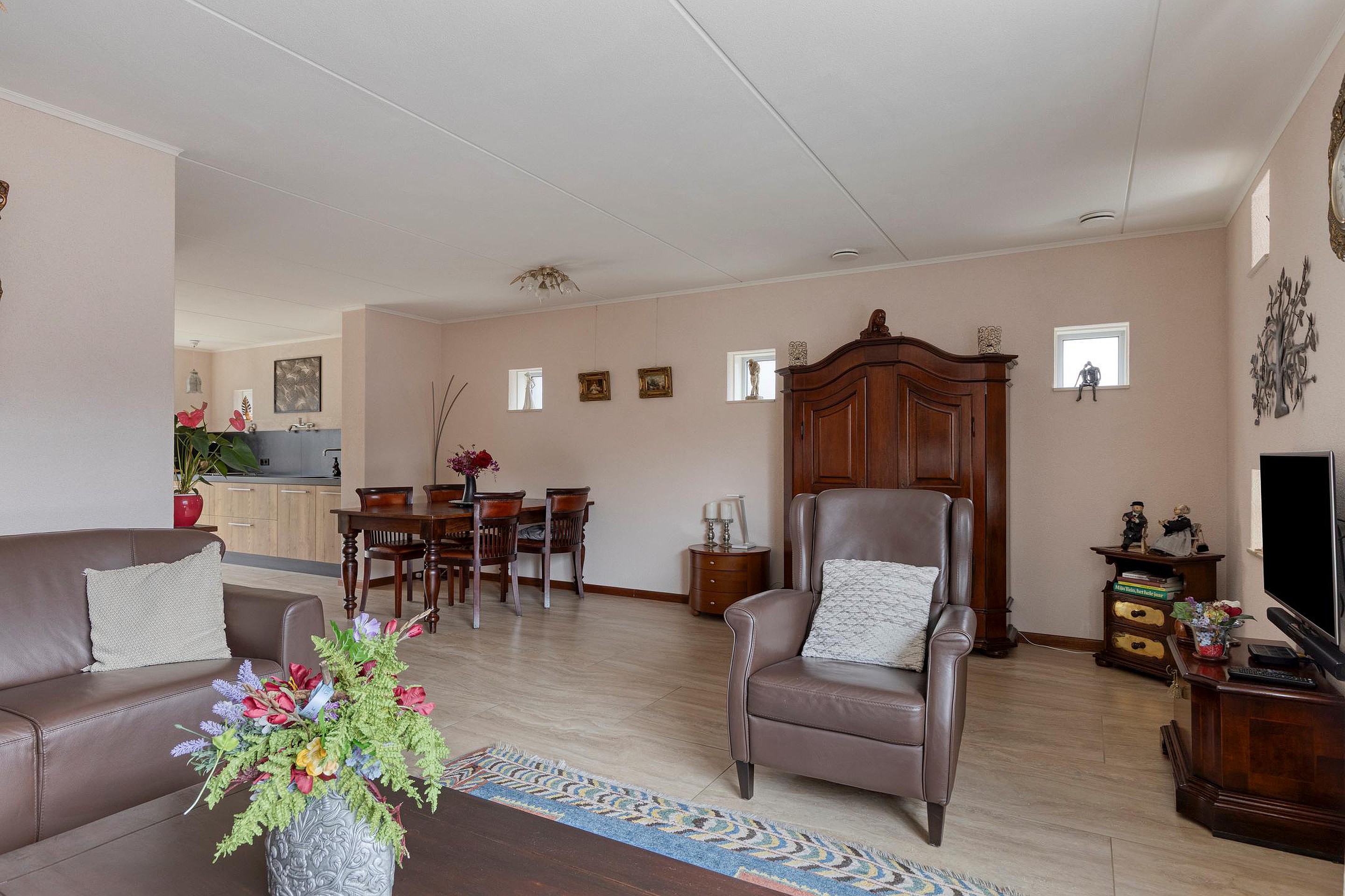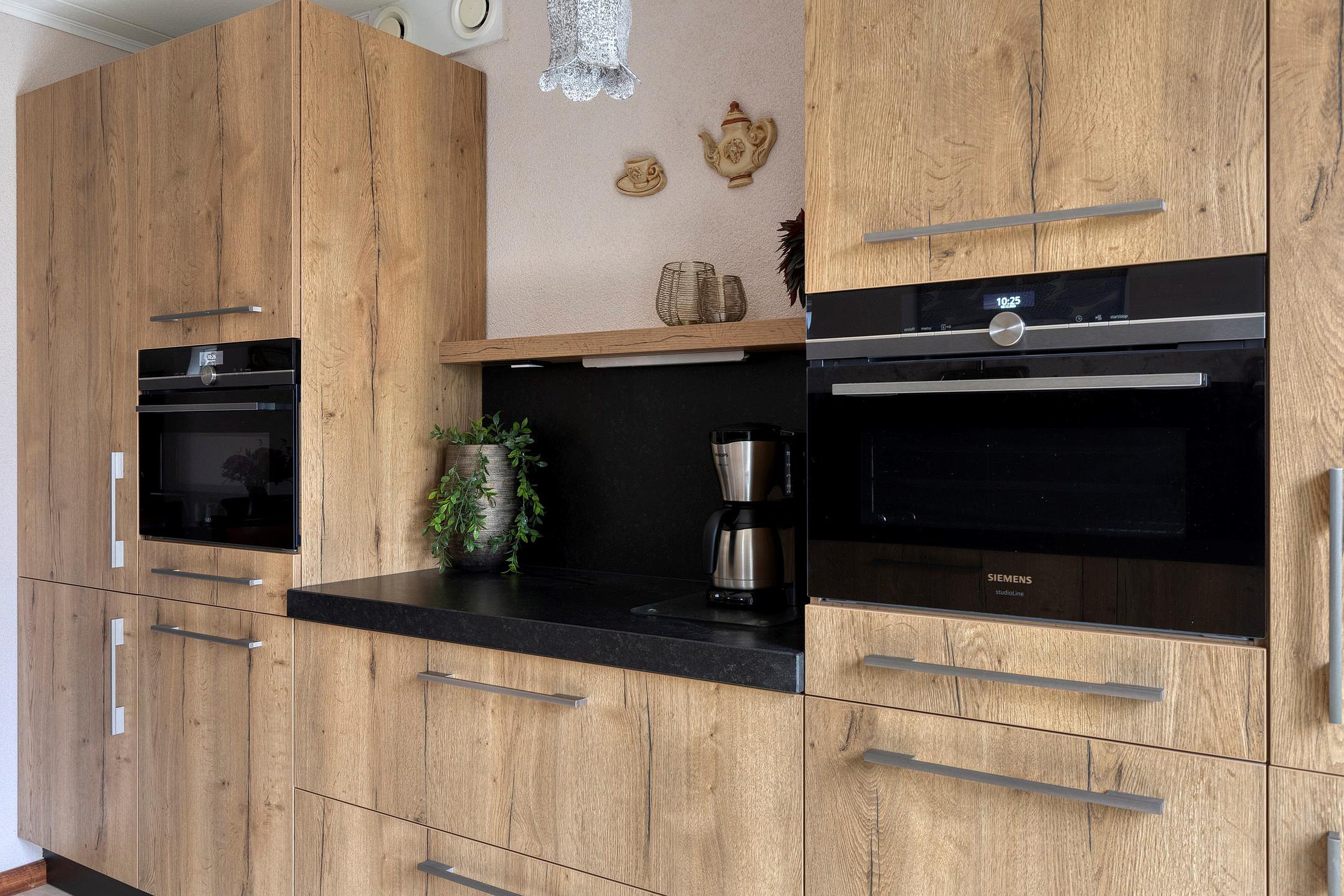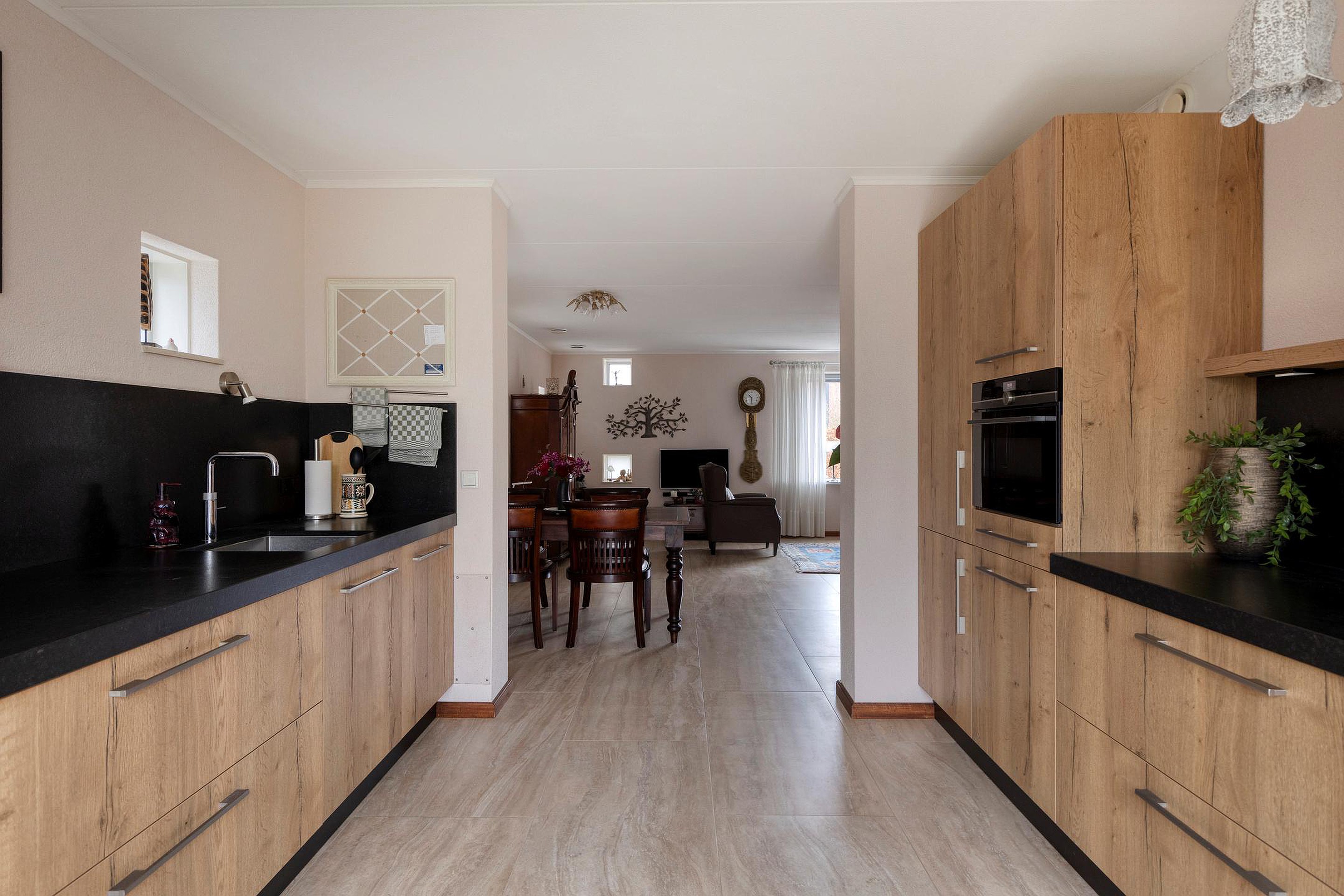 De open keuken aan de achterzijde is praktisch en stijlvol ingericht met opstellingen aan beide zijden. Aan de ene zijde vindt u het werkblad met inductiekookplaat, spoelbak en vaatwasser. Aan de andere zijde is er volop kastruimte, een koelkast en een sfeervolle coffee corner. De combinatie van houtlook en zwarte accenten geeft de keuken een moderne, robuuste uitstraling.