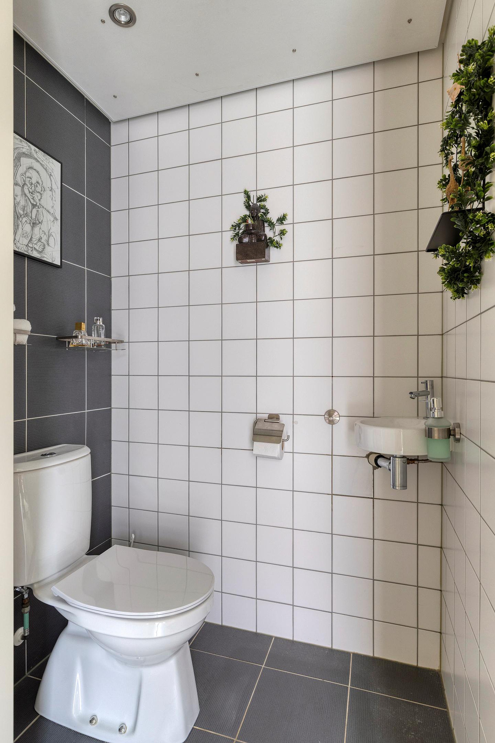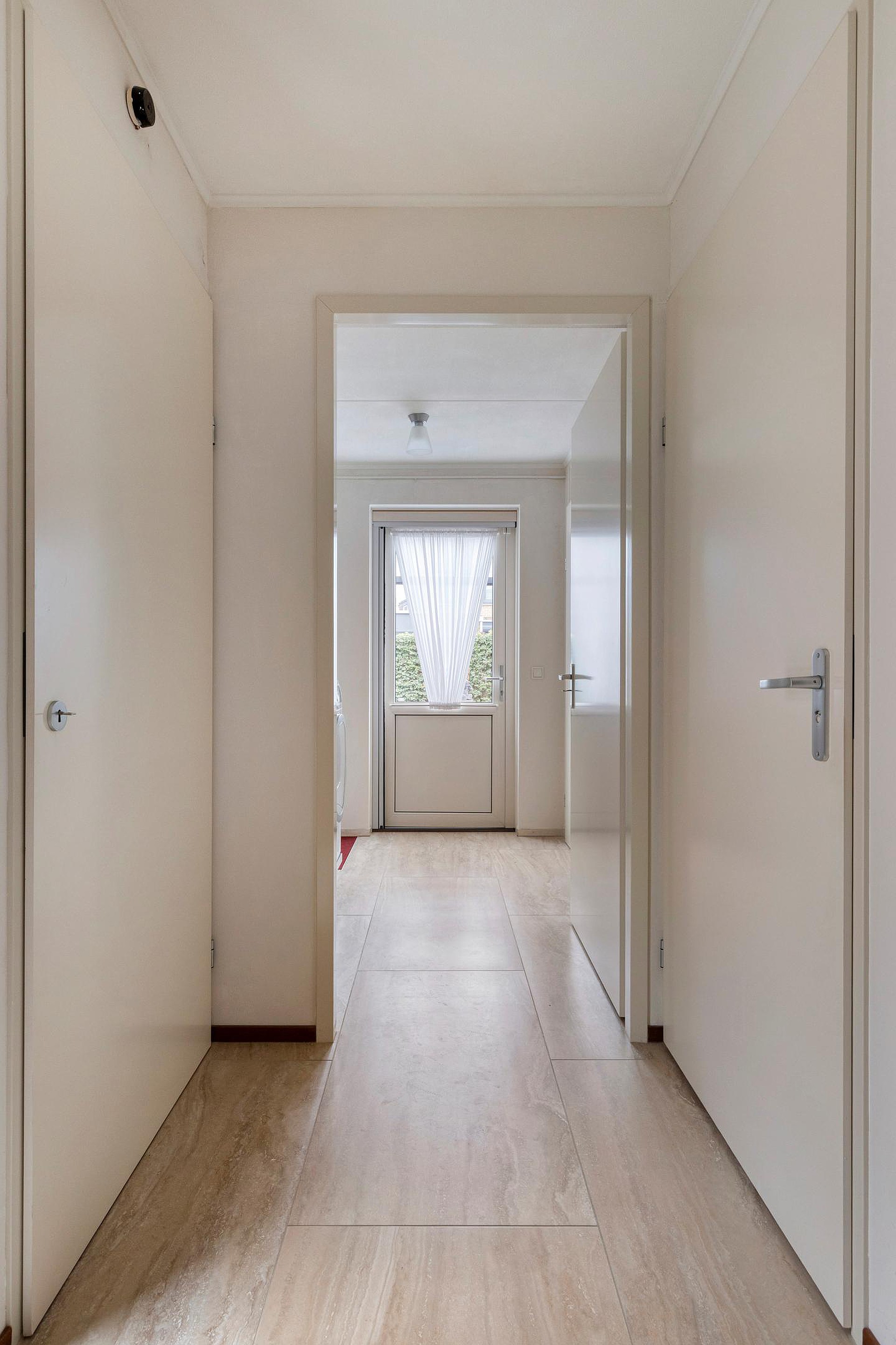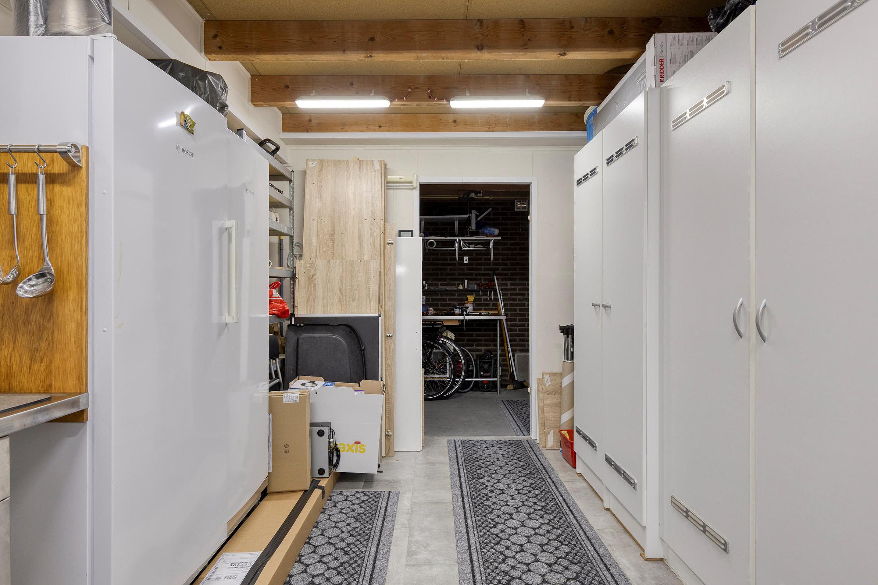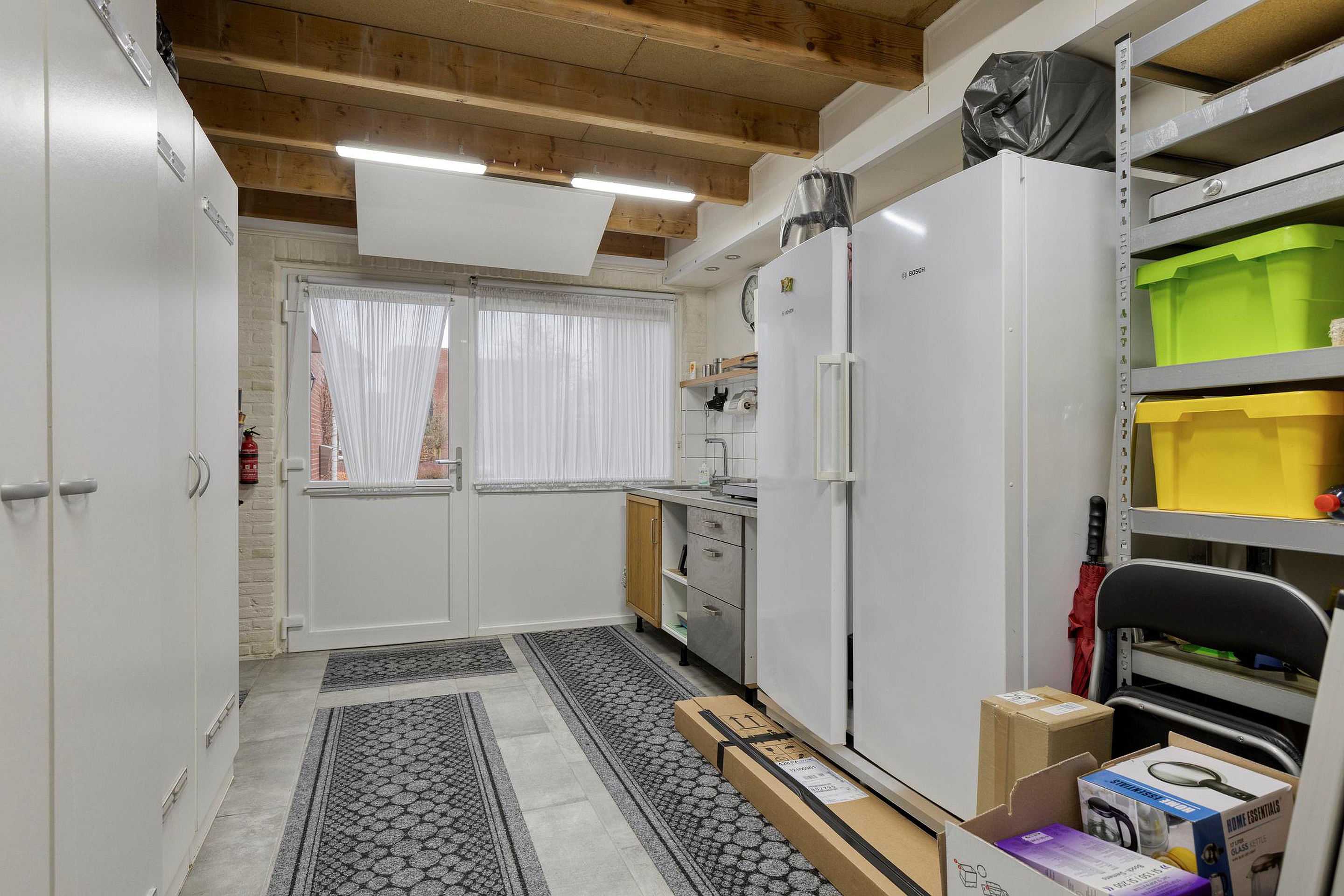 De bijkeuken is praktisch ingericht met aansluitingen voor wasapparatuur en een vaste kastenwand waarin de warmtepomp netjes is weggewerkt. Vanuit hier heeft u toegang tot de tuin én tot een tweede inpandige berging (voorheen garage, eenvoudig terug te brengen indien gewenst).