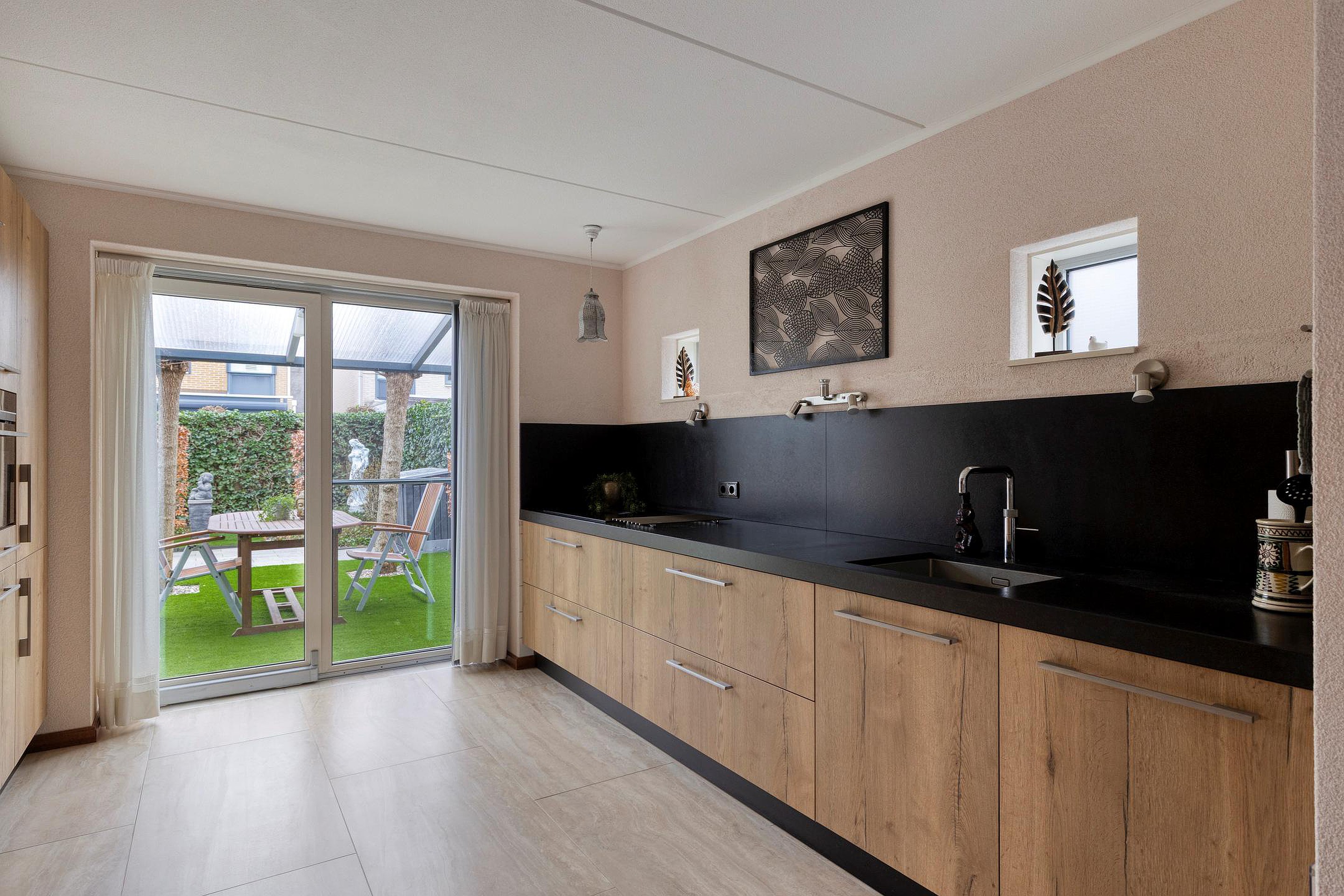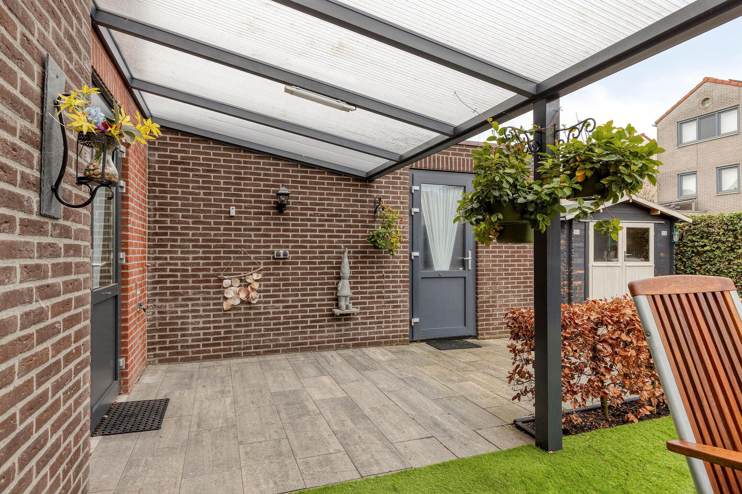 Via de schuifpui loopt u zo de overkapping in de achtertuin in; een heerlijke plek om tot in de late uurtjes buiten te genieten.