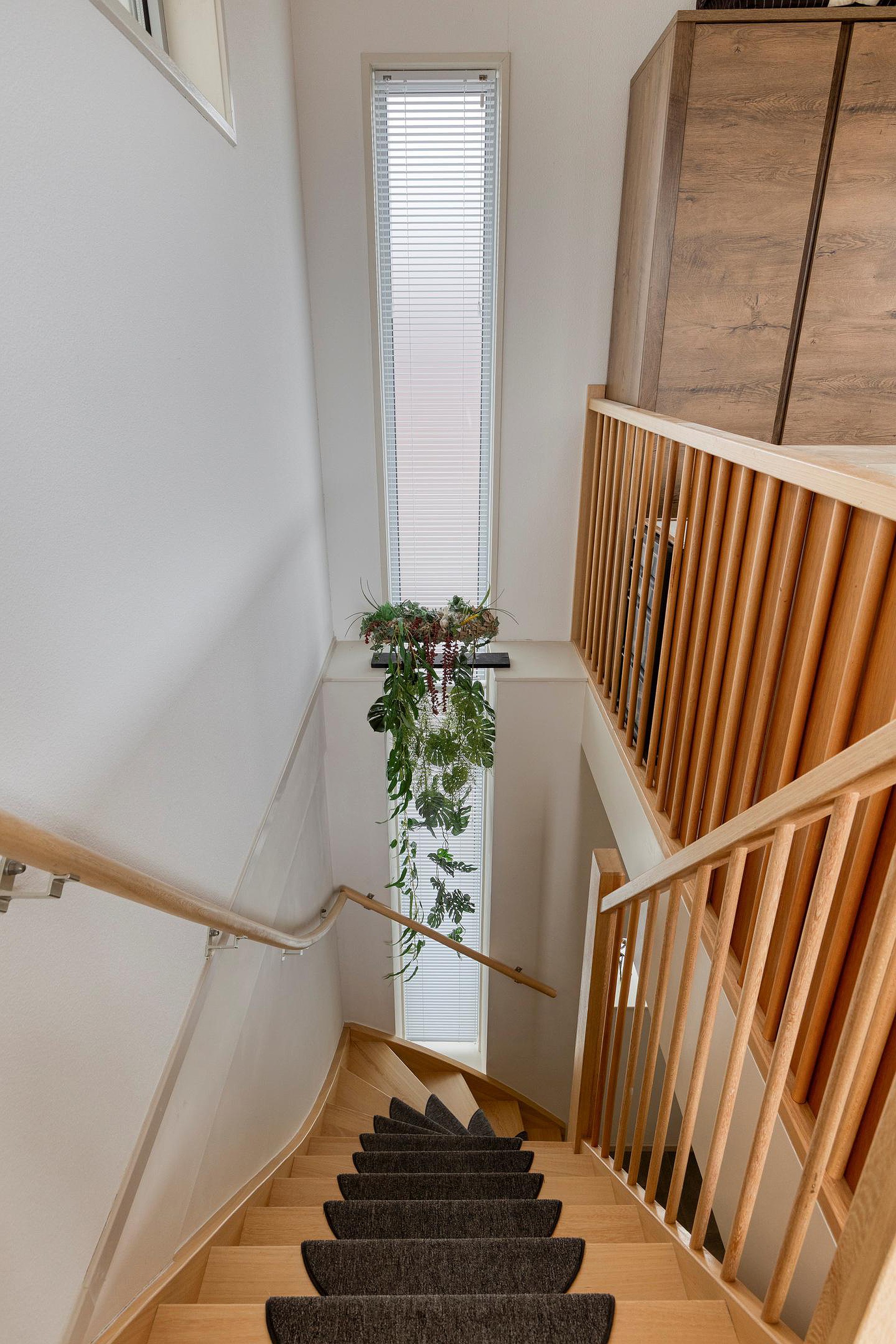 Eerste verdieping Via de hardhouten trap komt u op de lichte overloop, waar een verticale raampartij met matglas zorgt voor veel daglicht met behoud van privacy.