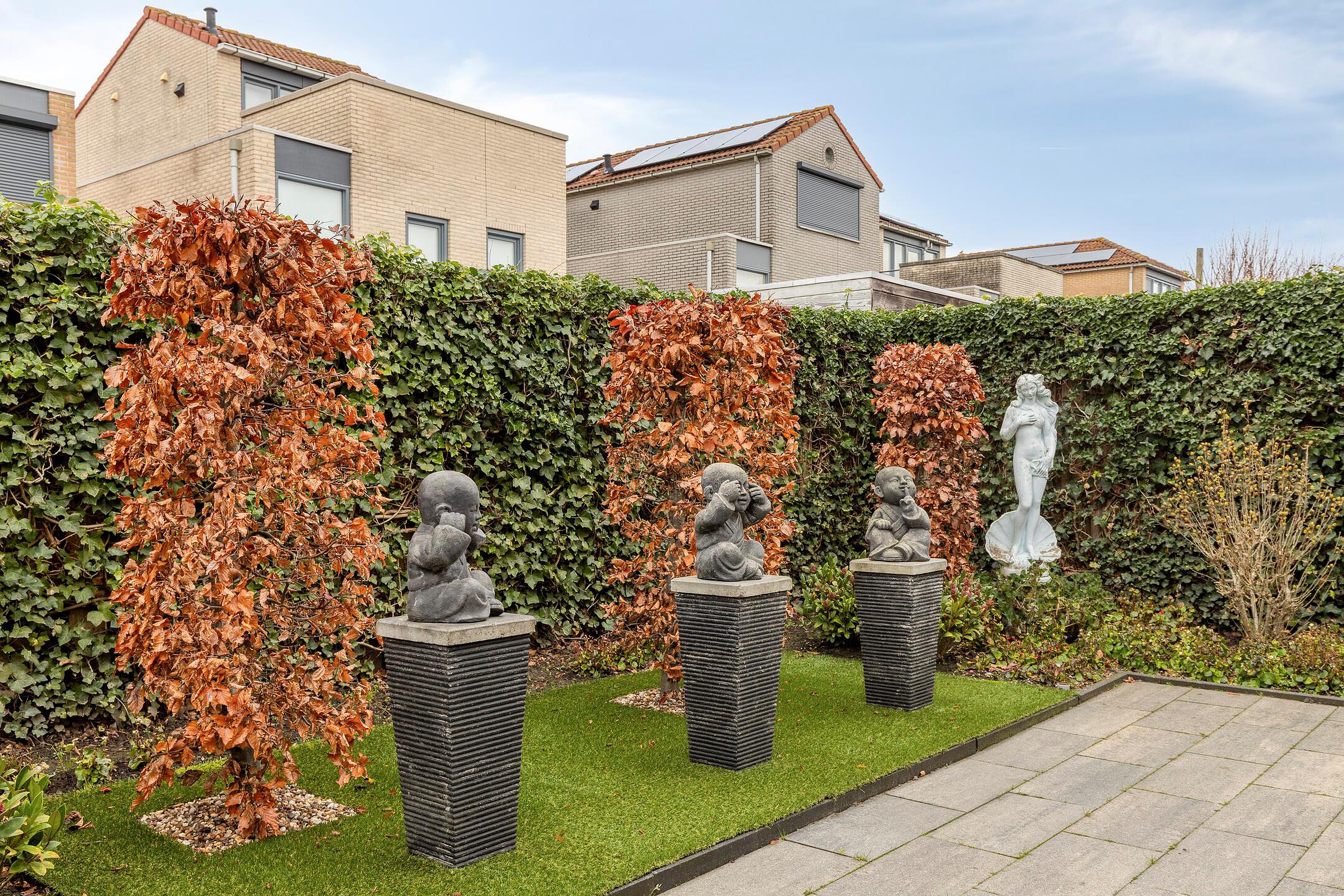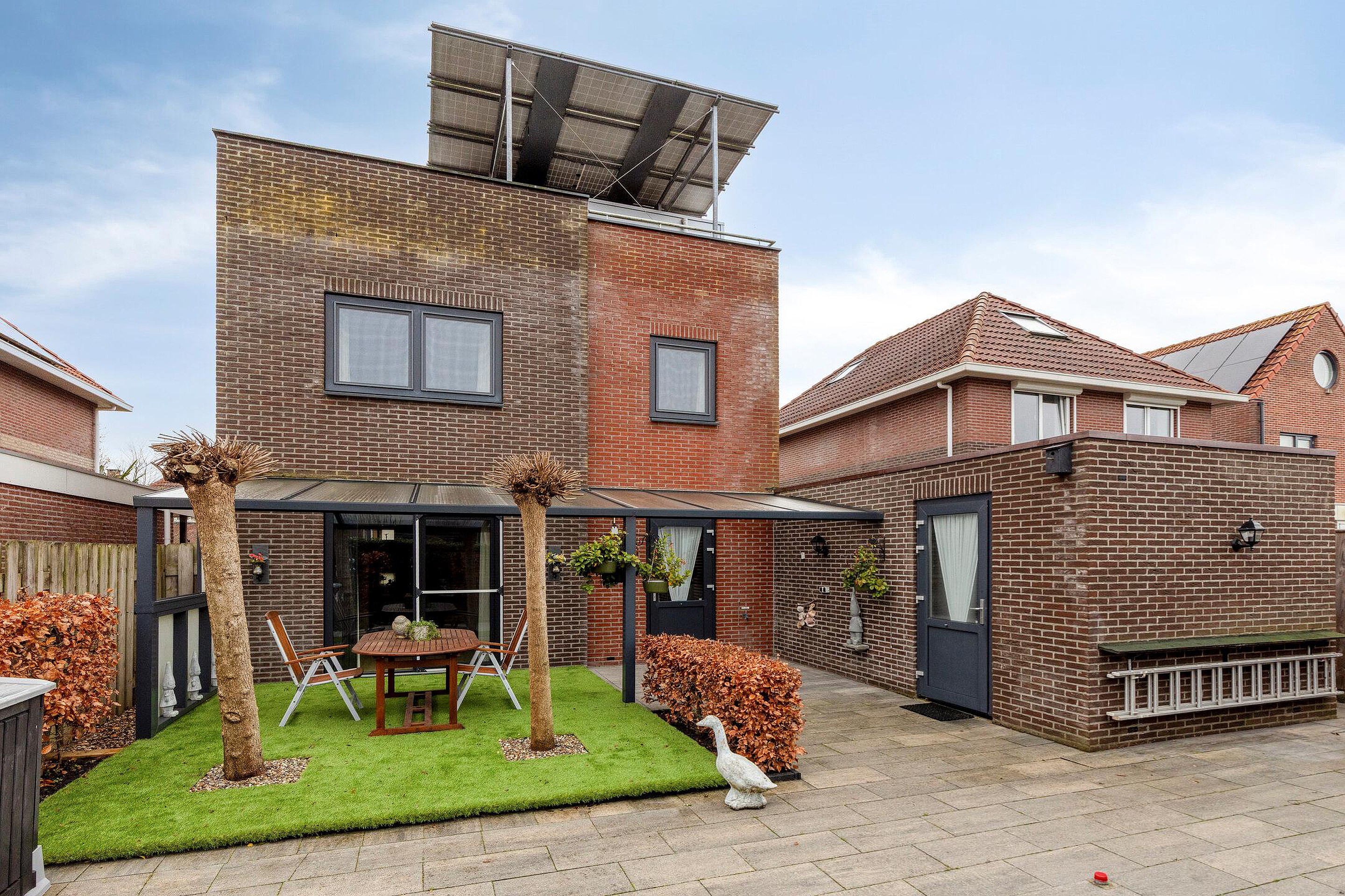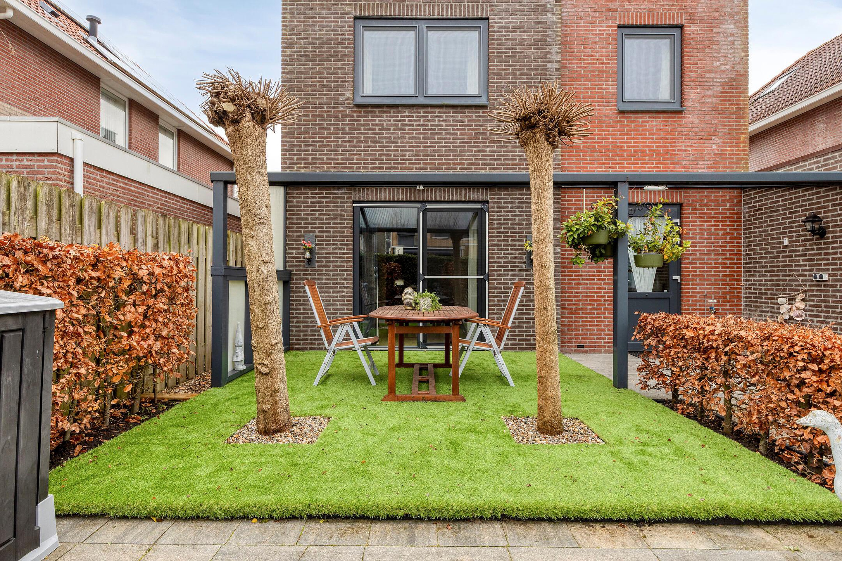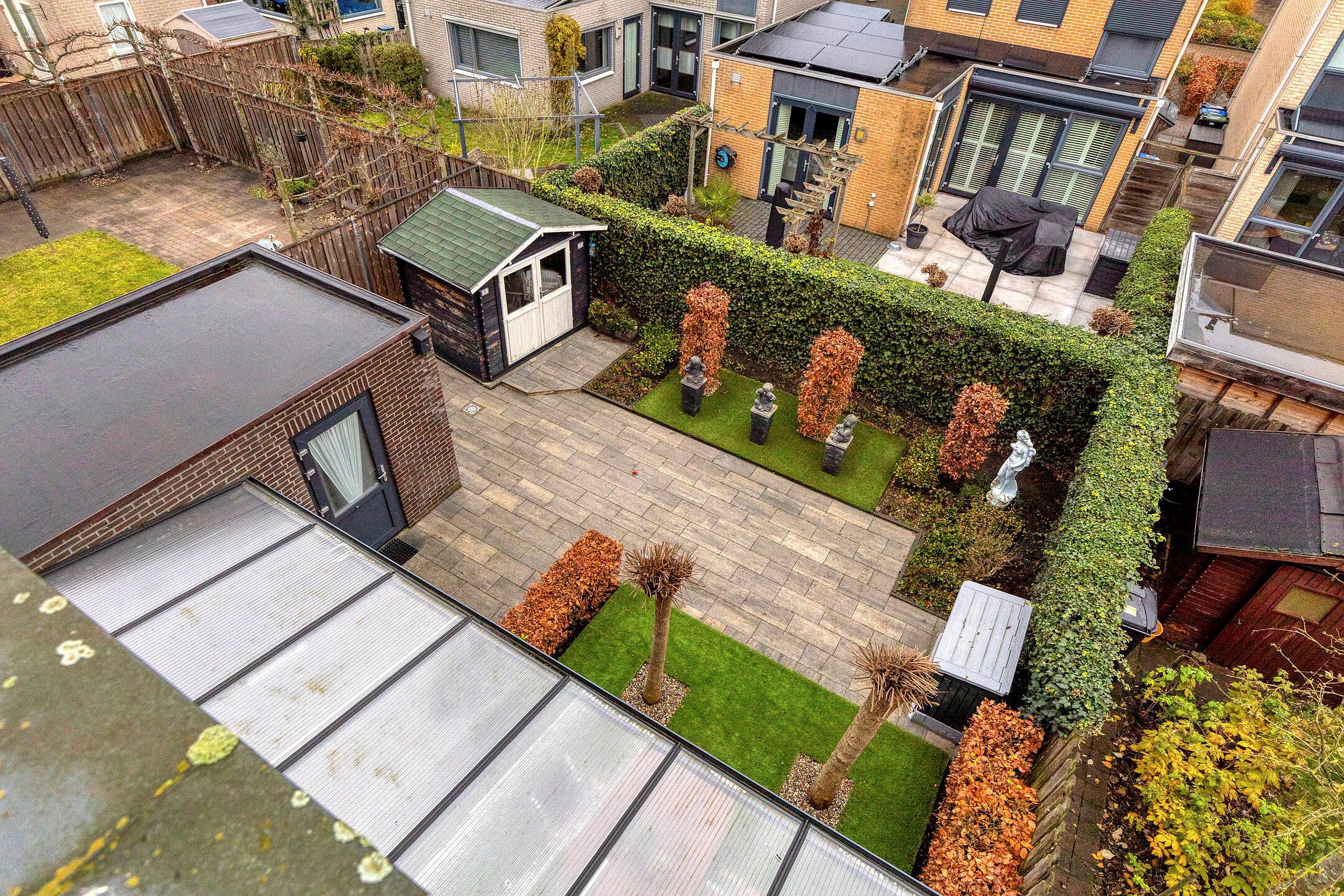 Ook de achtertuin is fraai en onderhoudsvriendelijk ingericht. Direct aan de keuken bevindt zich een stijlvolle aluminium overkapping met terras; een plek waar u het hele jaar door comfortabel buiten kunt zitten, ongeacht het weer.