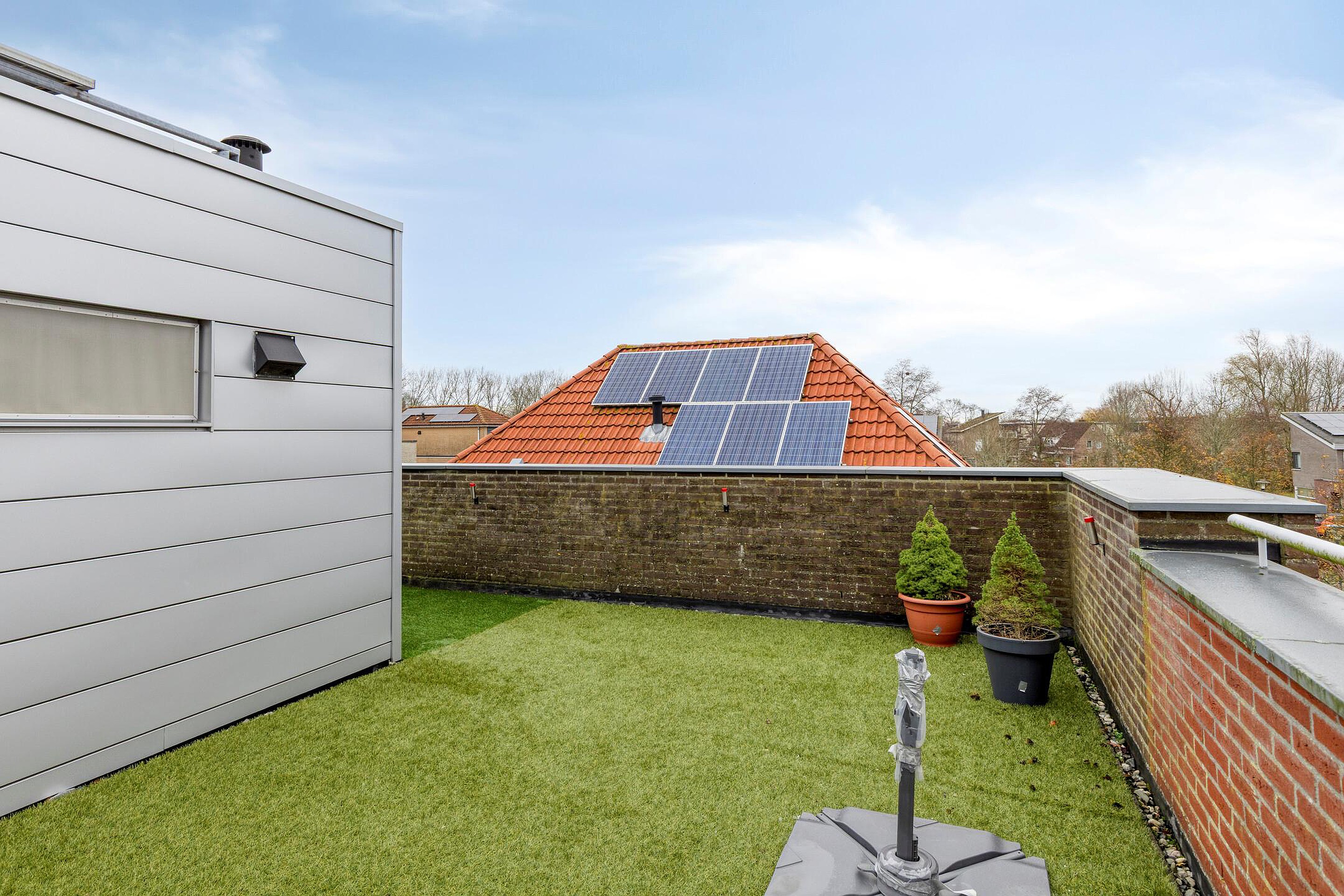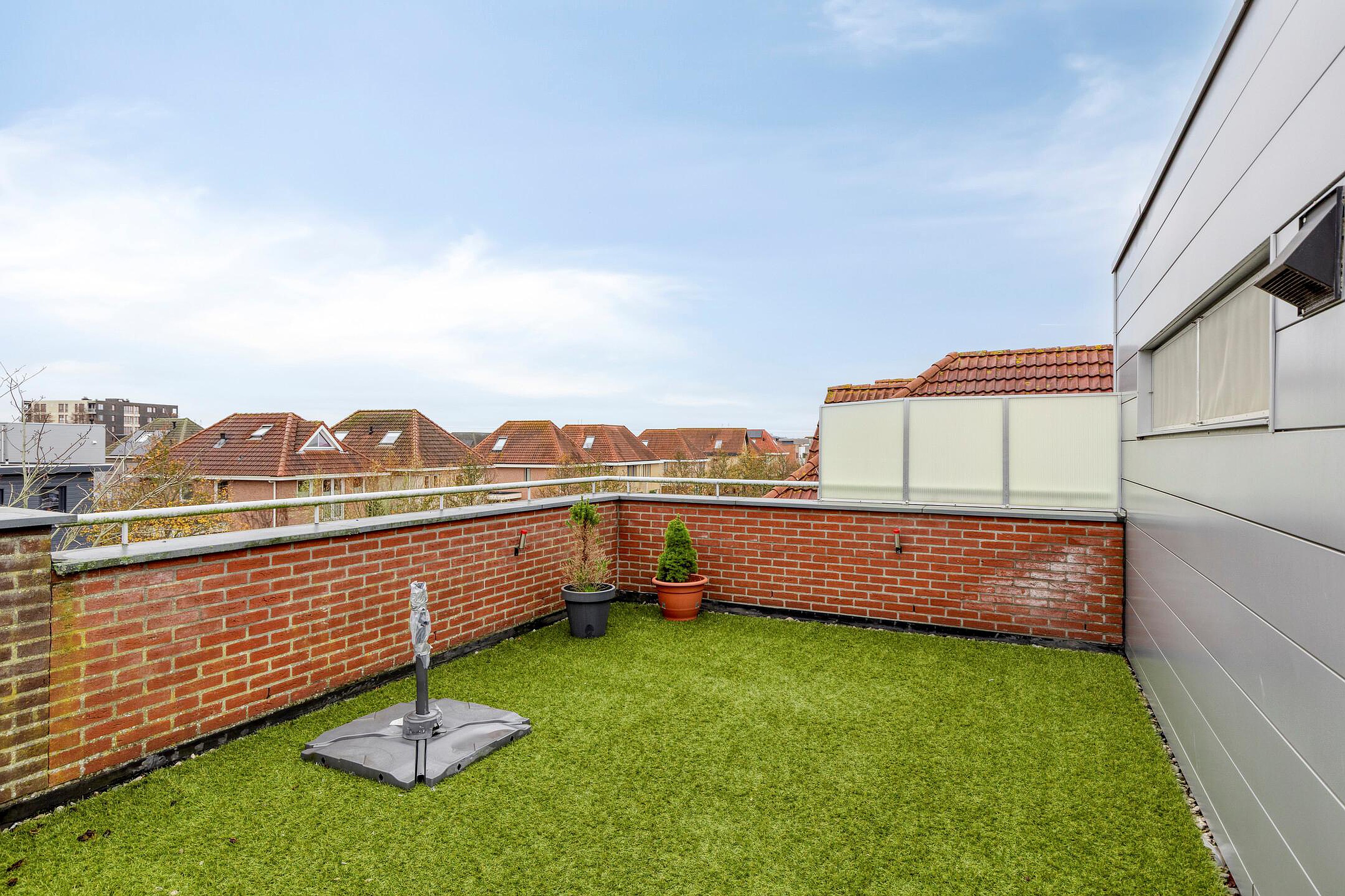 Via de schuifpui bereikt u het riante dakterras van circa 45 m2. Het zonnige, op het zuiden gelegen deel biedt veel privacy, fijn uitzicht en is een heerlijke plek om al vroeg in het jaar van de zon te genieten.