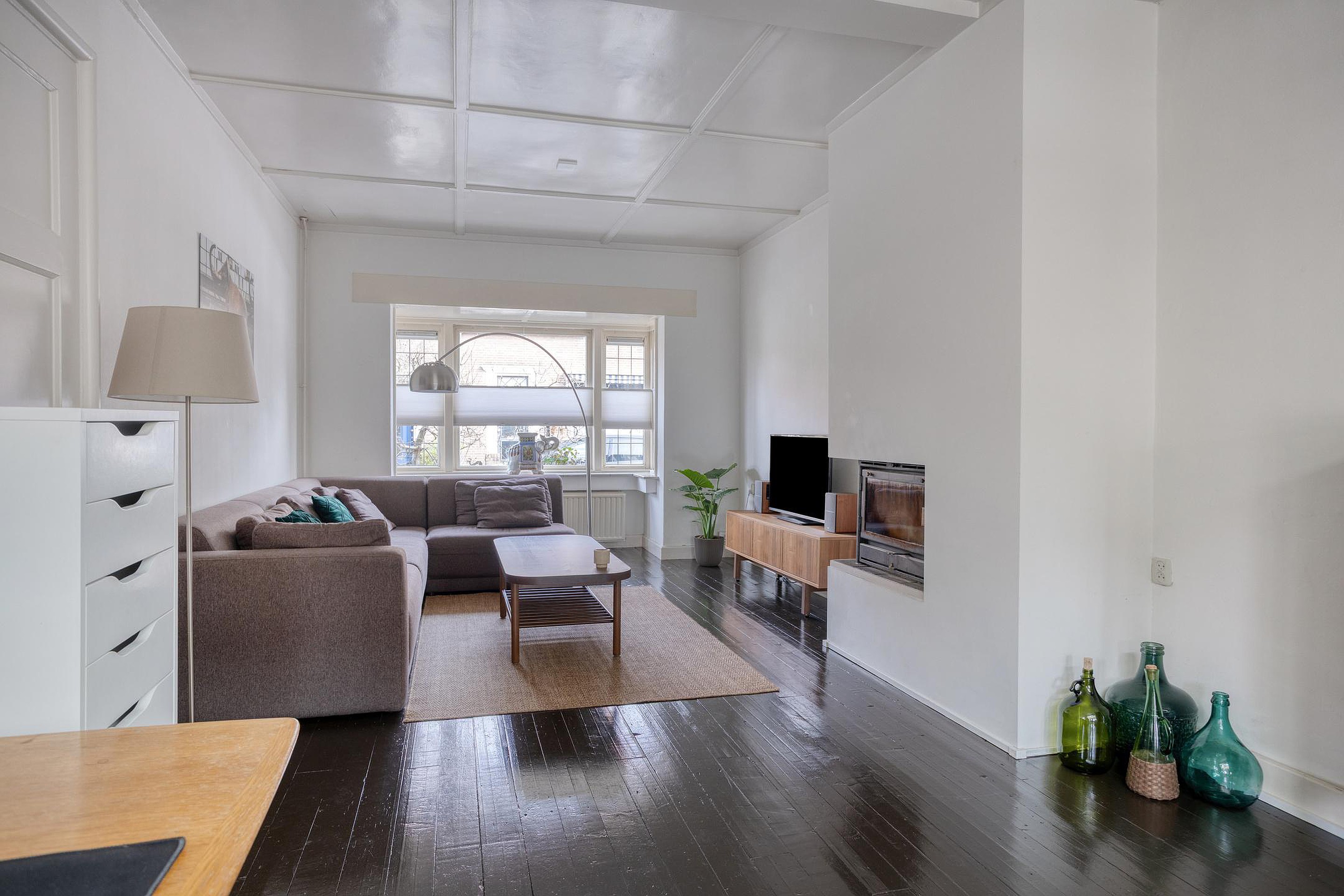 De woonkamer ademt de charme van vroeger. Authentieke plafonds, een sfeervolle erker met glas-in-loodramen en een warm, donker gelakte houten vloer zorgen voor een karaktervolle uitstraling. De open haard maakt het geheel compleet en zorgt voor extra sfeer tijdens de koudere maanden.