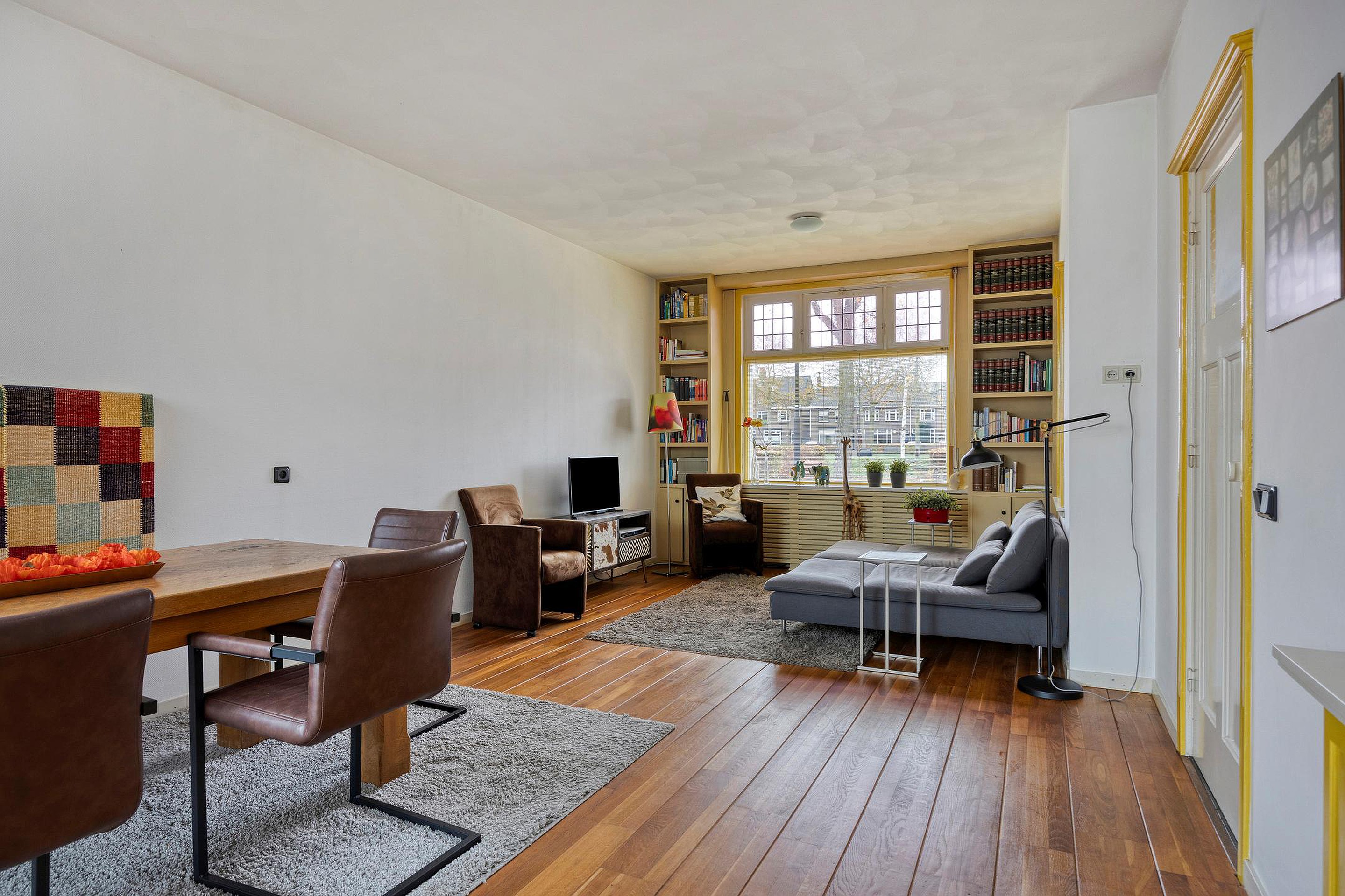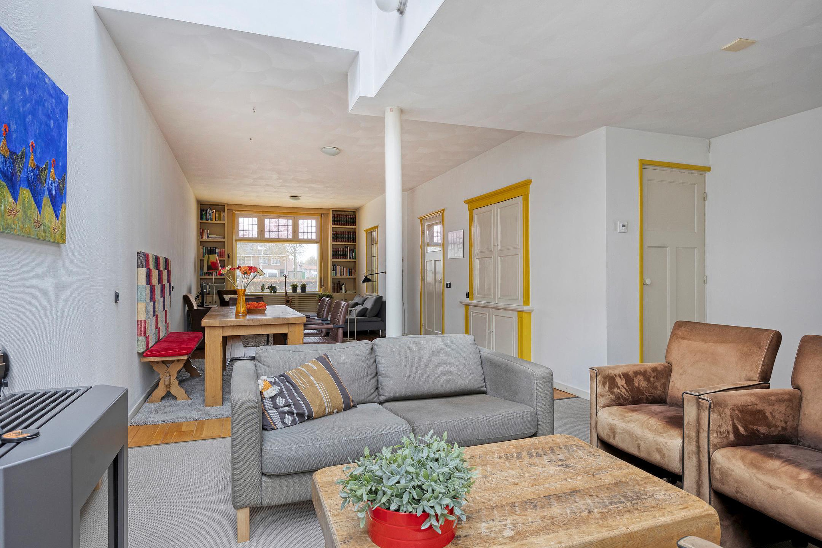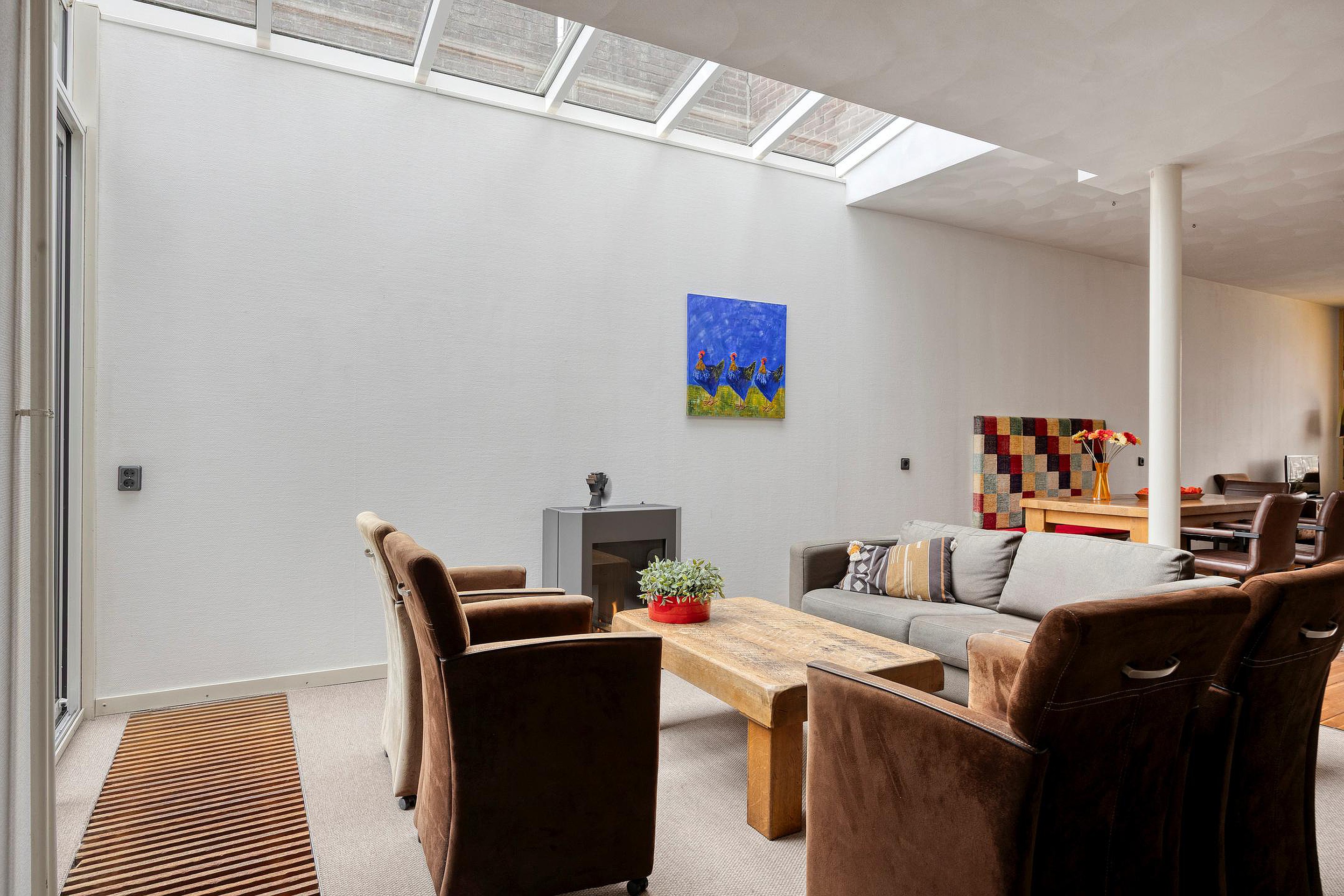 Via de authentieke entree betreedt u de hal, die toegang biedt tot de royale en sfeervolle woonkamer. Deze prachtige leefruimte wordt gekenmerkt door een overvloed aan natuurlijk licht dankzij de grote licht straat. De combinatie van een hoogwaardige houten vloer, strak gestucte muren en een stijlvolle designer gaskachel zorgt voor een warme, maar tegelijkertijd moderne en elegante uitstraling.